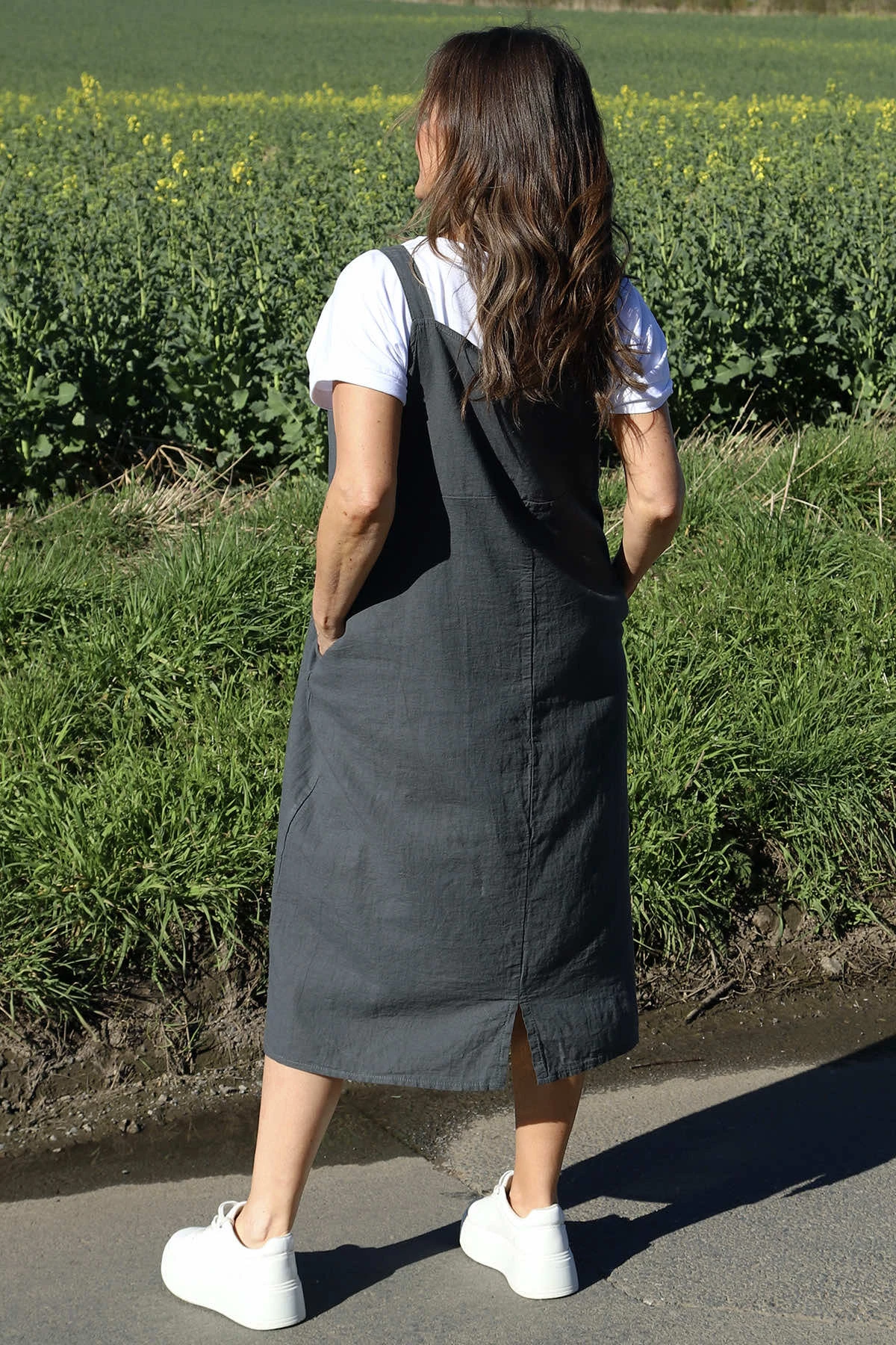 Effortlessly chic and versatile, our Adina Linen Pinafore Dress is the perfect addition to your wardrobe. Crafted from high-quality linen, this dress features button-up straps for a customisable fit, convenient pockets, and stylish seam details. The small split in the rear skirt adds an extra touch of flair. Stay comfortable and stylish in this must-have dress.