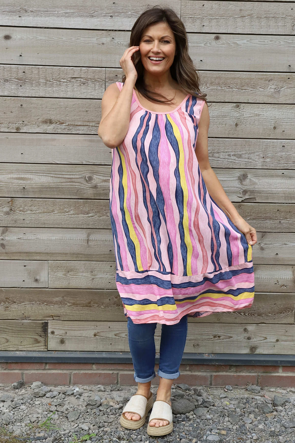 The Amiah Stripe Tunic features a sleeveless design with a comfortable round neck, perfect for warm days. Its all-over vertical stripe print creates a flattering, elongating effect, making it a versatile addition to your wardrobe. Easy to style and wear, this tunic offers both comfort and a chic look for everyday wear.