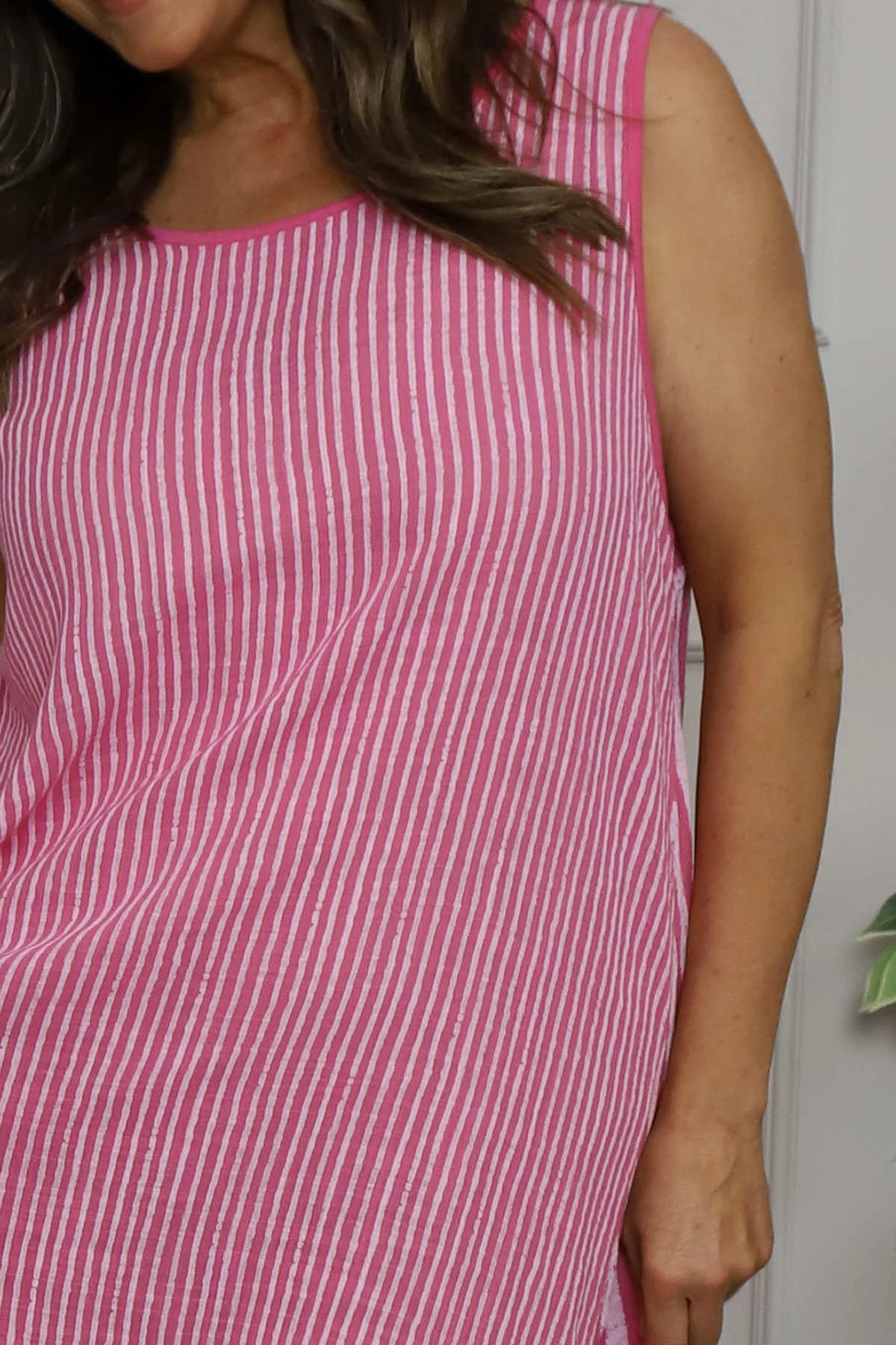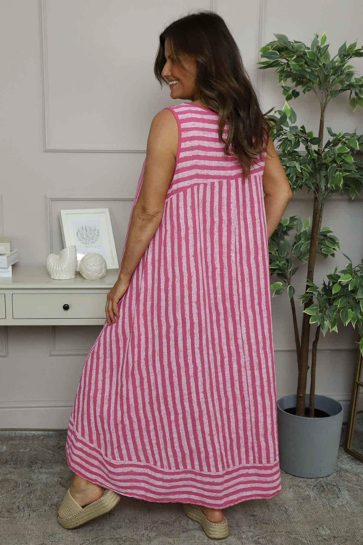 Get ready for summer with the Aubrie Stripe Cotton Dress. This sleeveless dress features an all-over stripe pattern and a comfortable round neckline, crafted from soft cotton to keep you cool and stylish all day long. Perfect for warm days, it offers effortless comfort and a flattering fit.