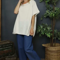 Baines Linen Top, a premium and exclusive design from Kit and Kaboodal. Crafted with a luxurious blend of linen and cotton, it boasts a flawless fit for all body types. It’s short sleeves and stylish folded neckline add a touch of elegance to any outfit. Elevate your look with this must-have piece.
