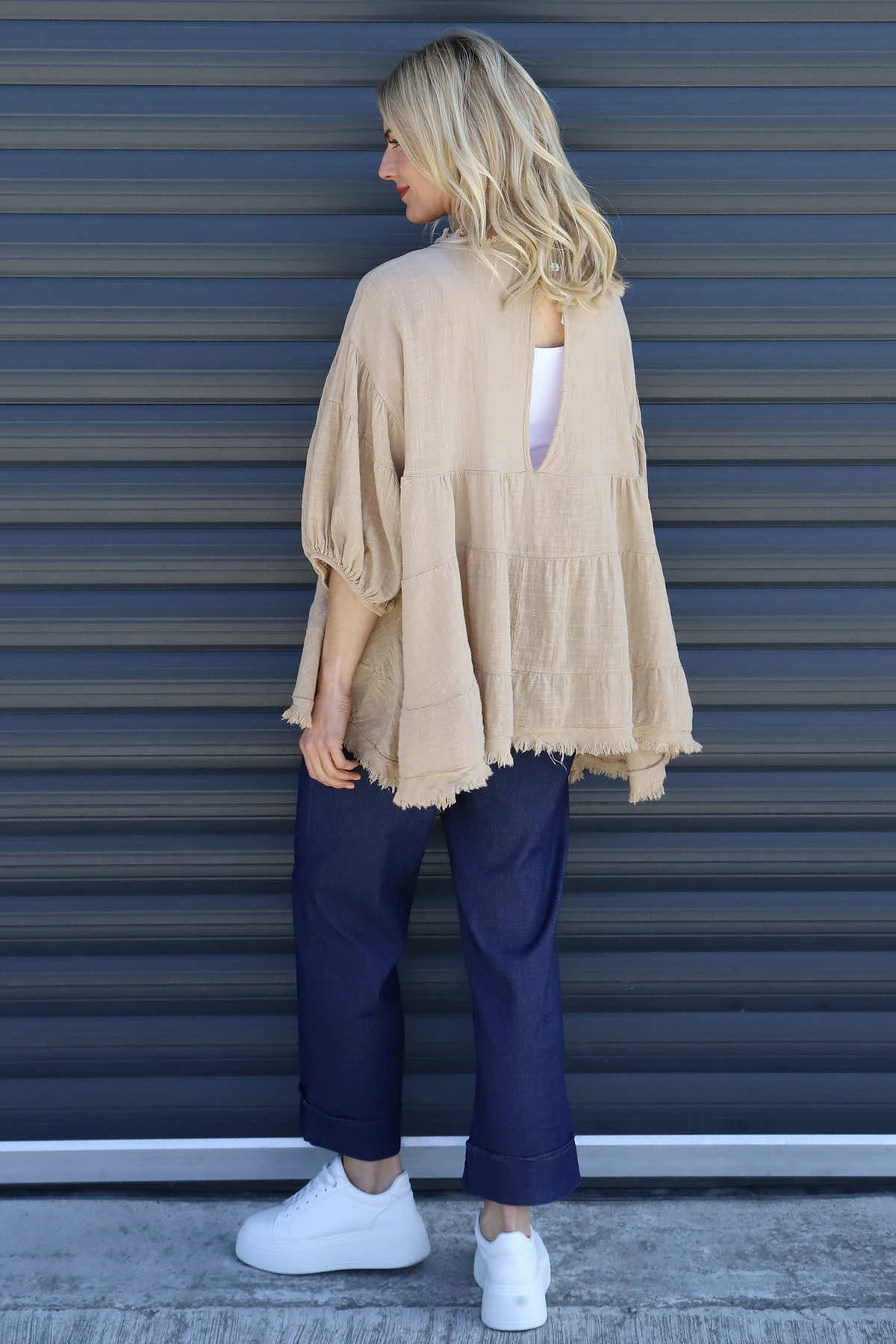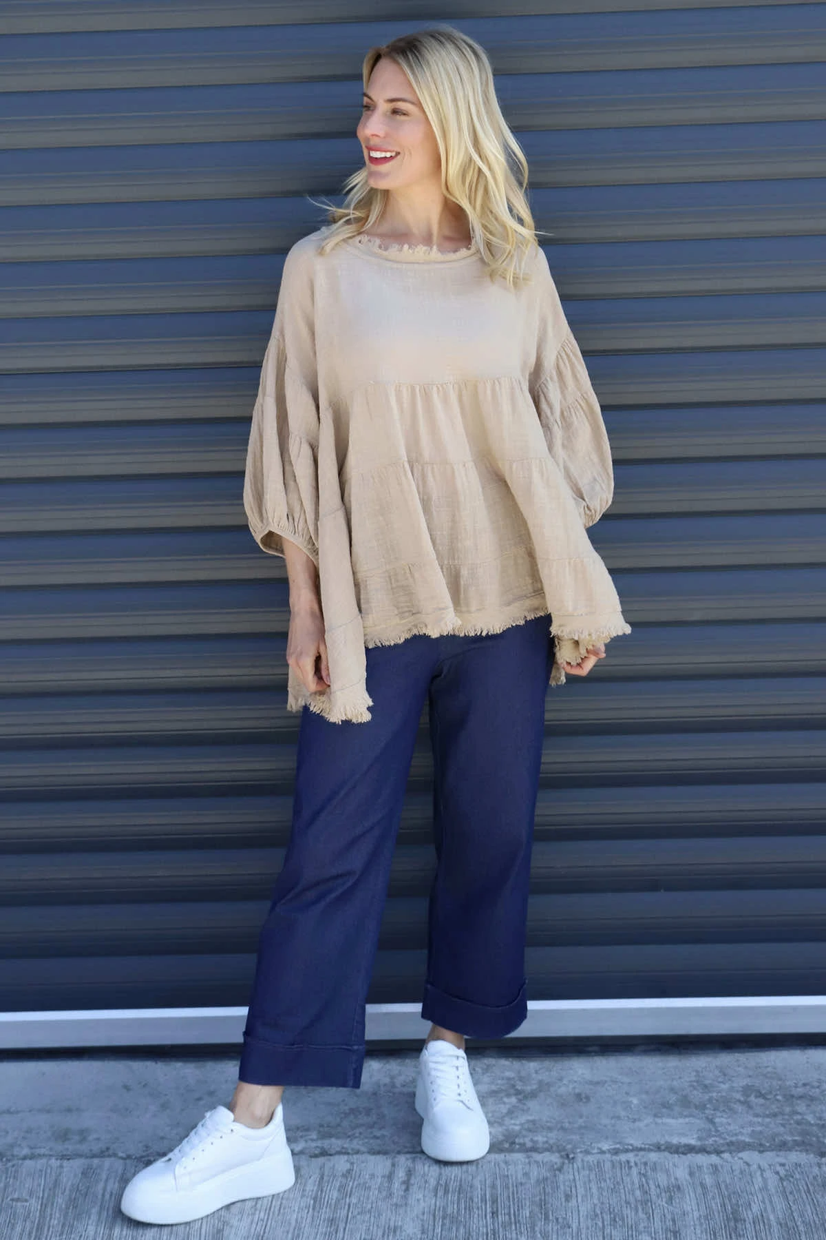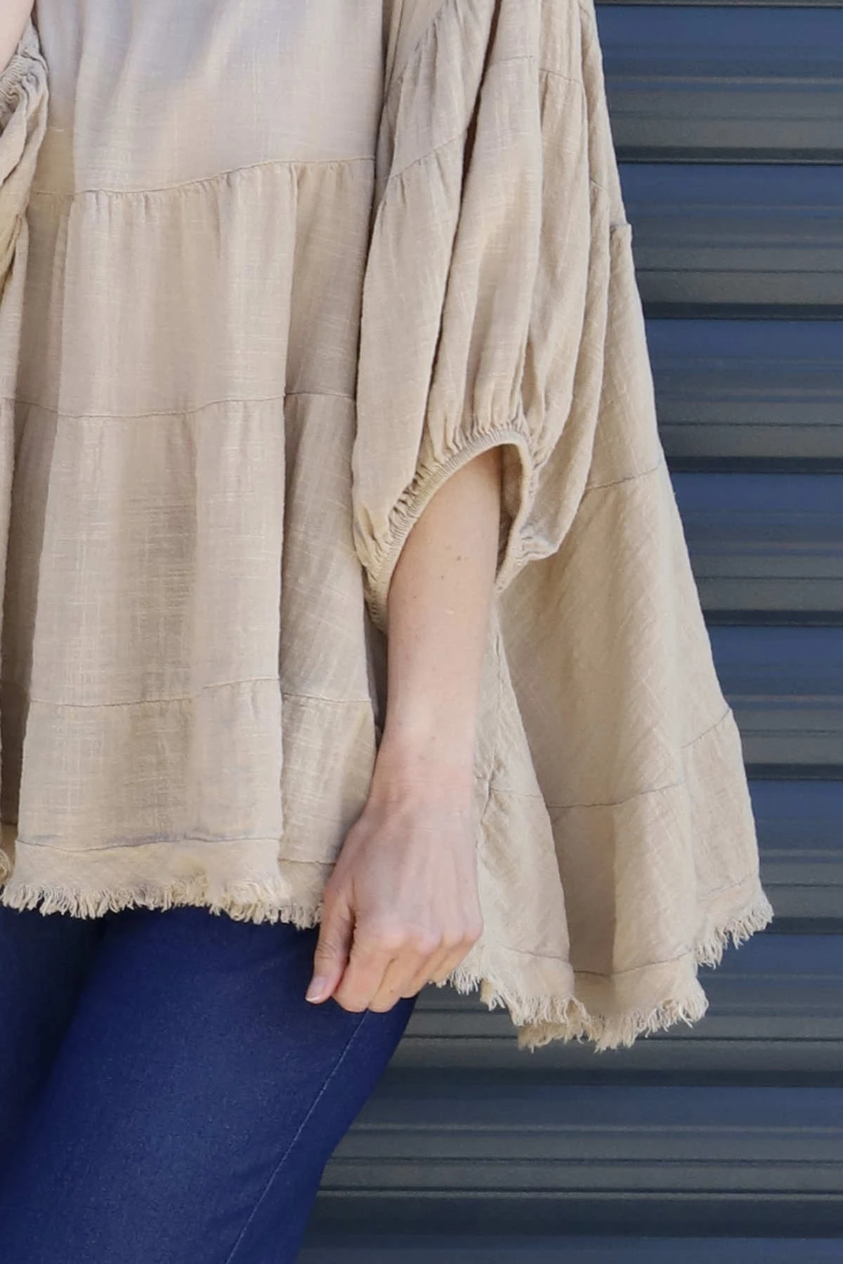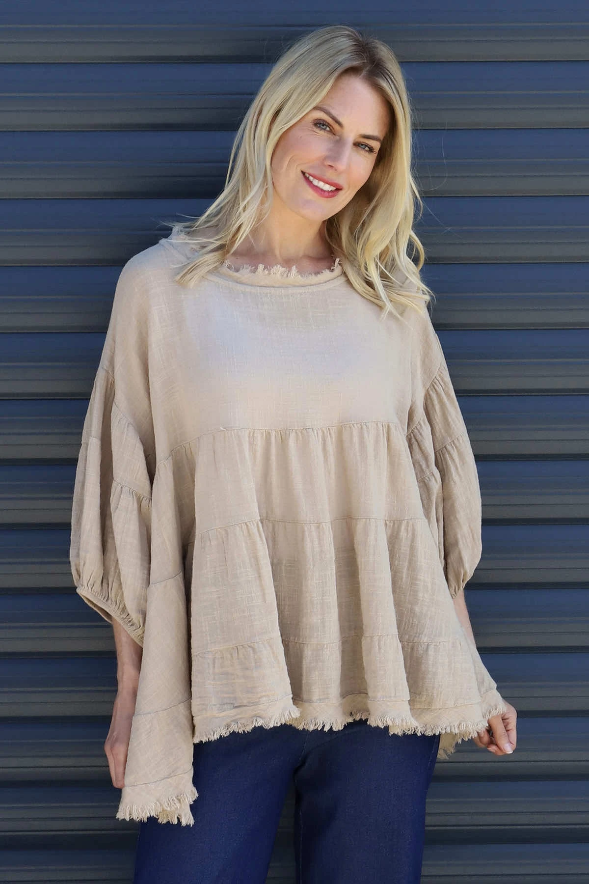 Dreamily soft and super stylish! The Made in Italy Bingham Tiered Top features frayed detailing around the neckline and hemline with statement puff sleeves. This gorgeous style can be paired with jeans. Crafted from 50% cotton 50% Linen.