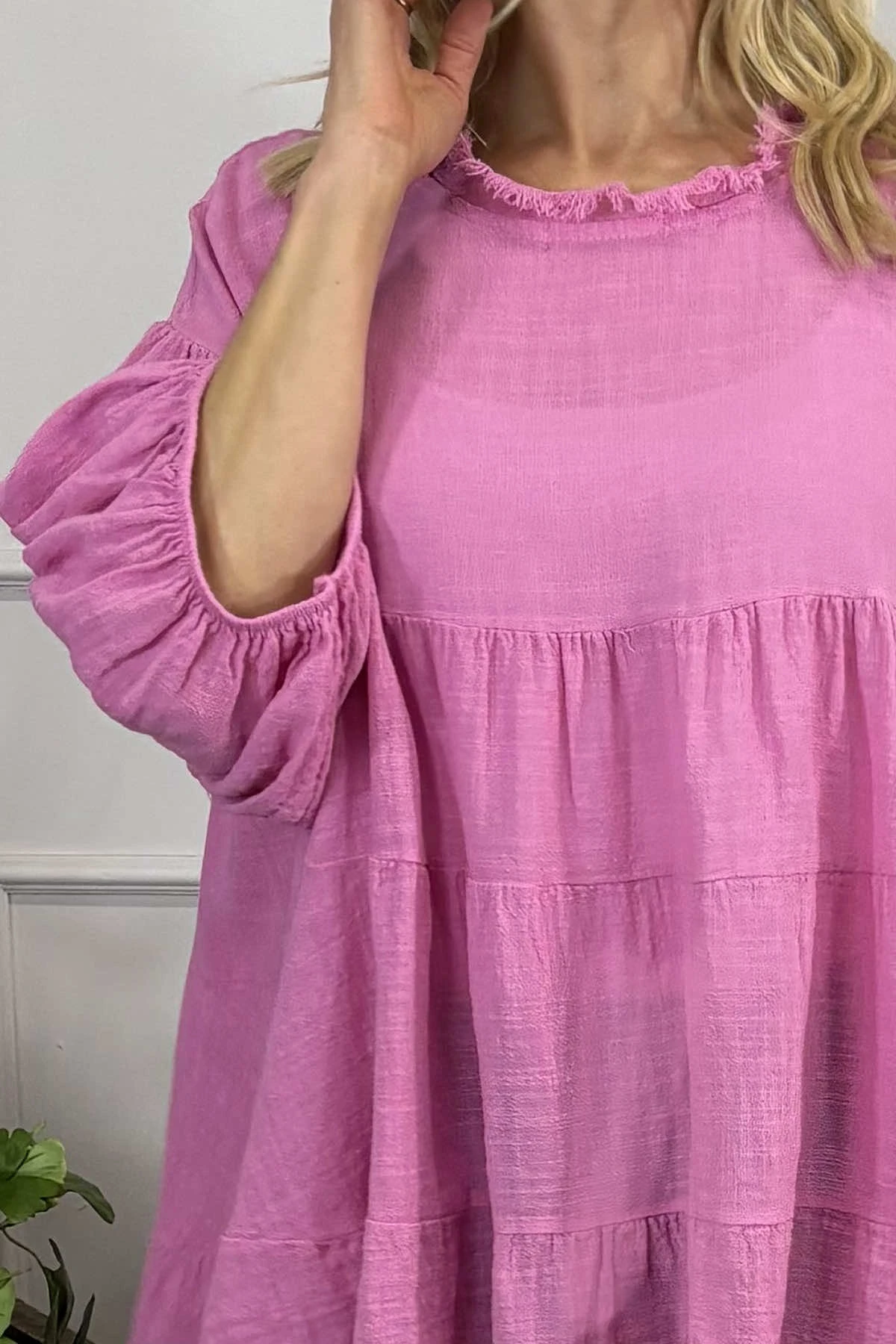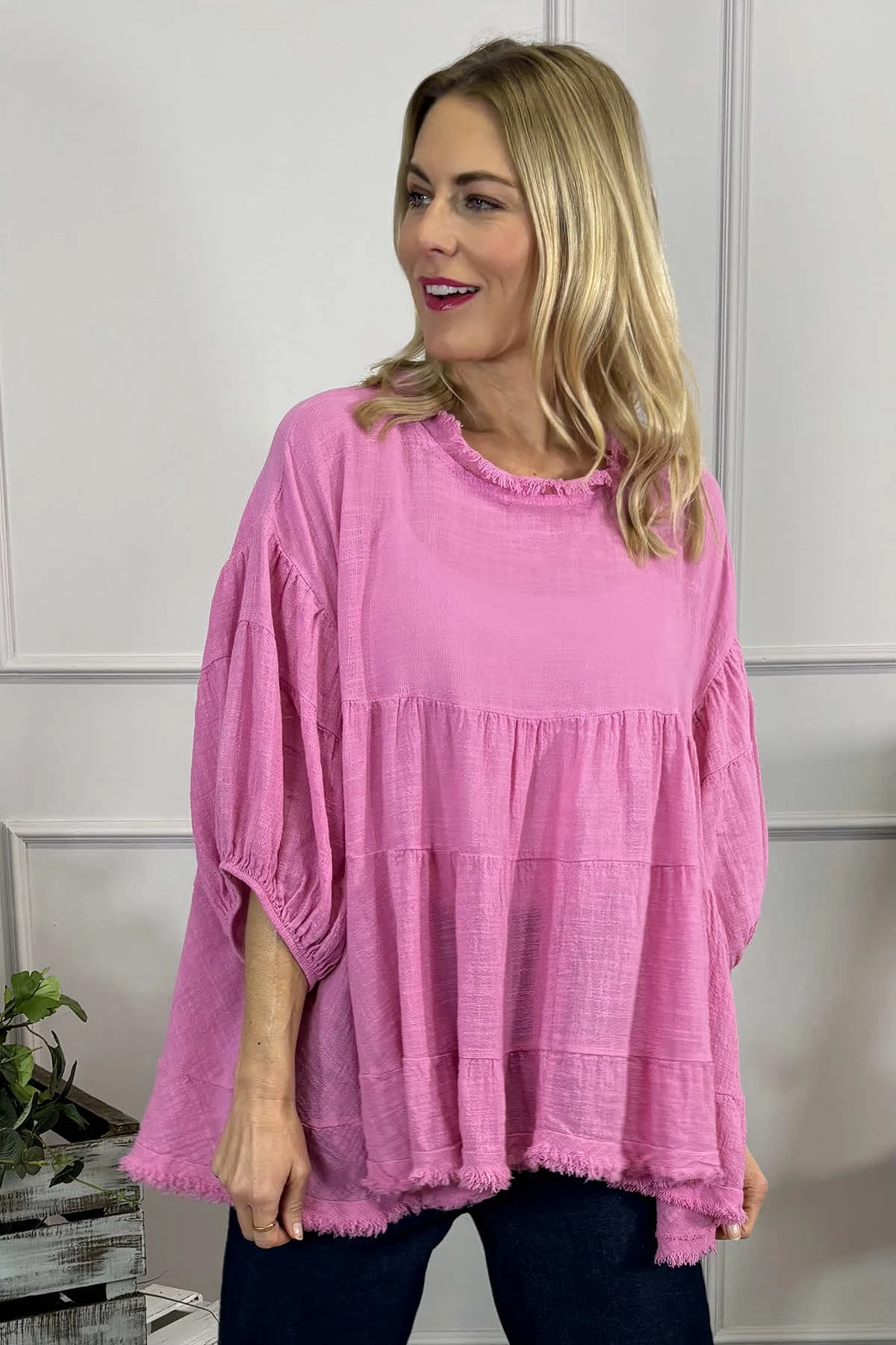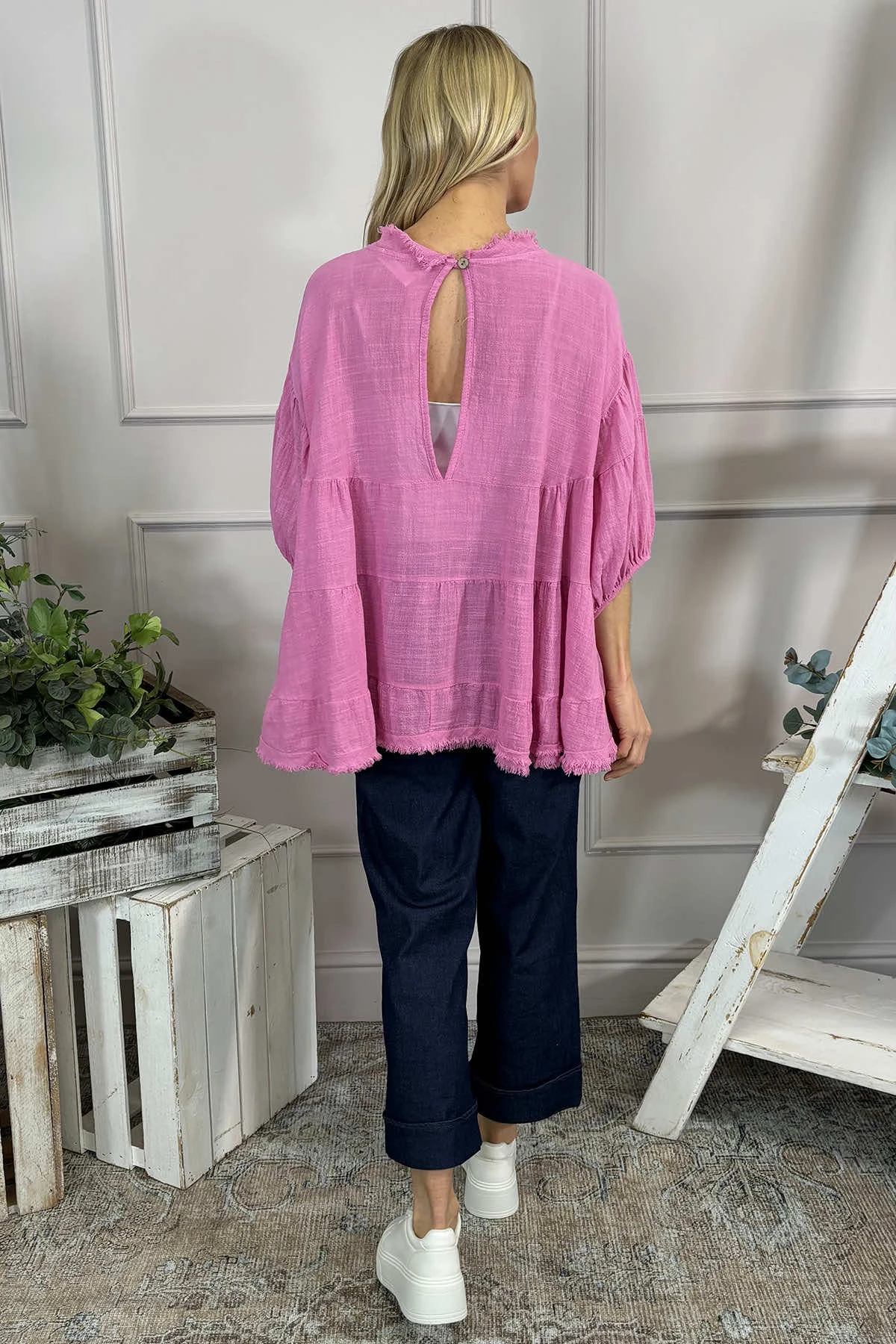 Dreamily soft and super stylish! The Made in Italy Bingham Tiered Top features frayed detailing around the neckline and hemline with statement puff sleeves. This gorgeous style can be paired with jeans. Crafted from 50% cotton 50% Linen.