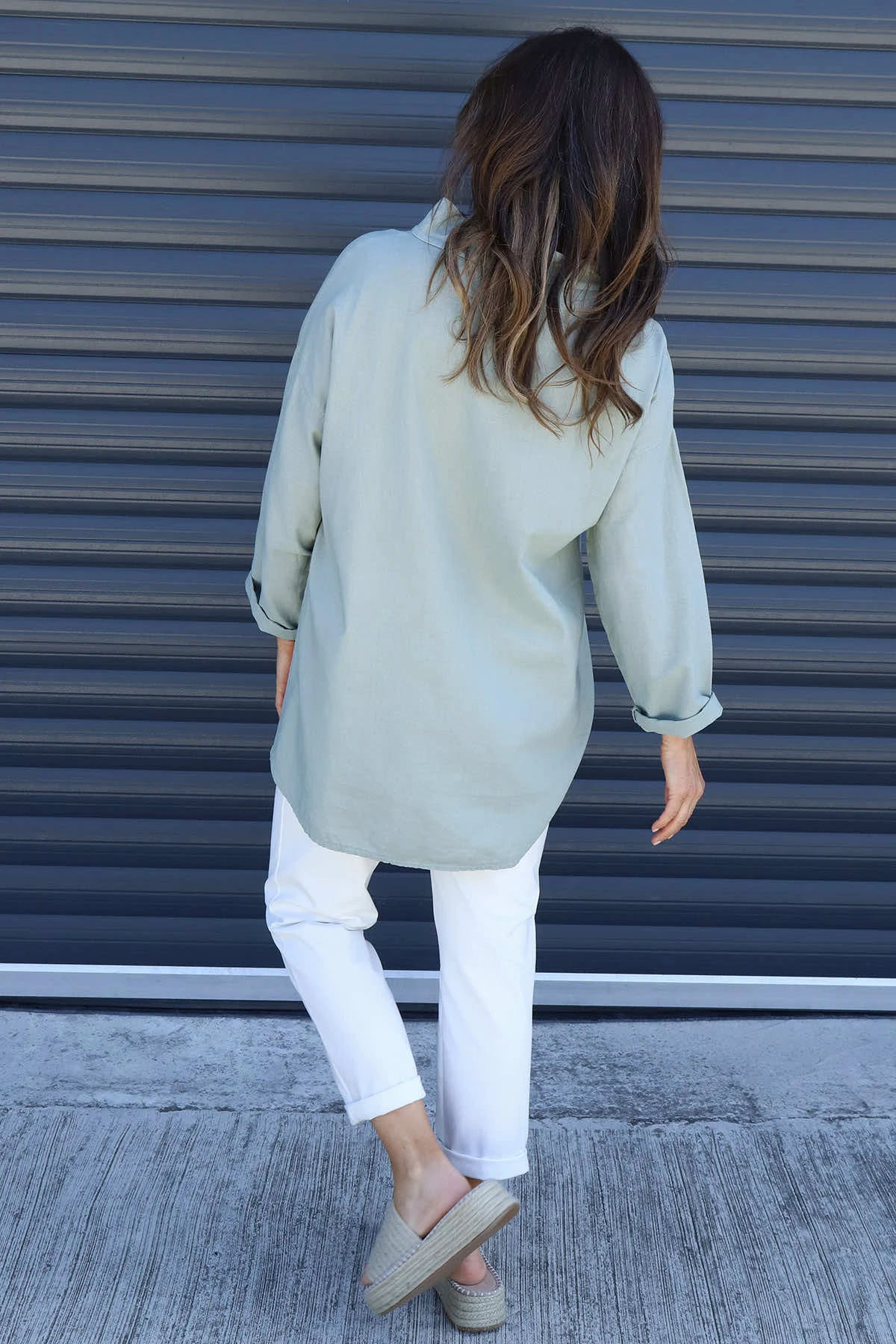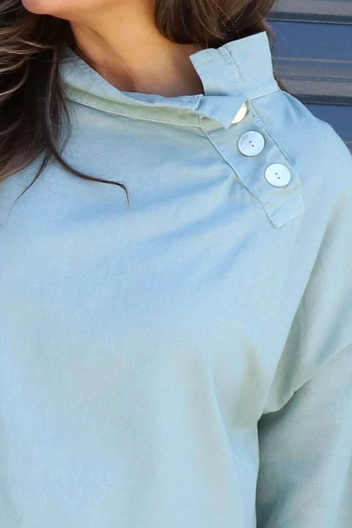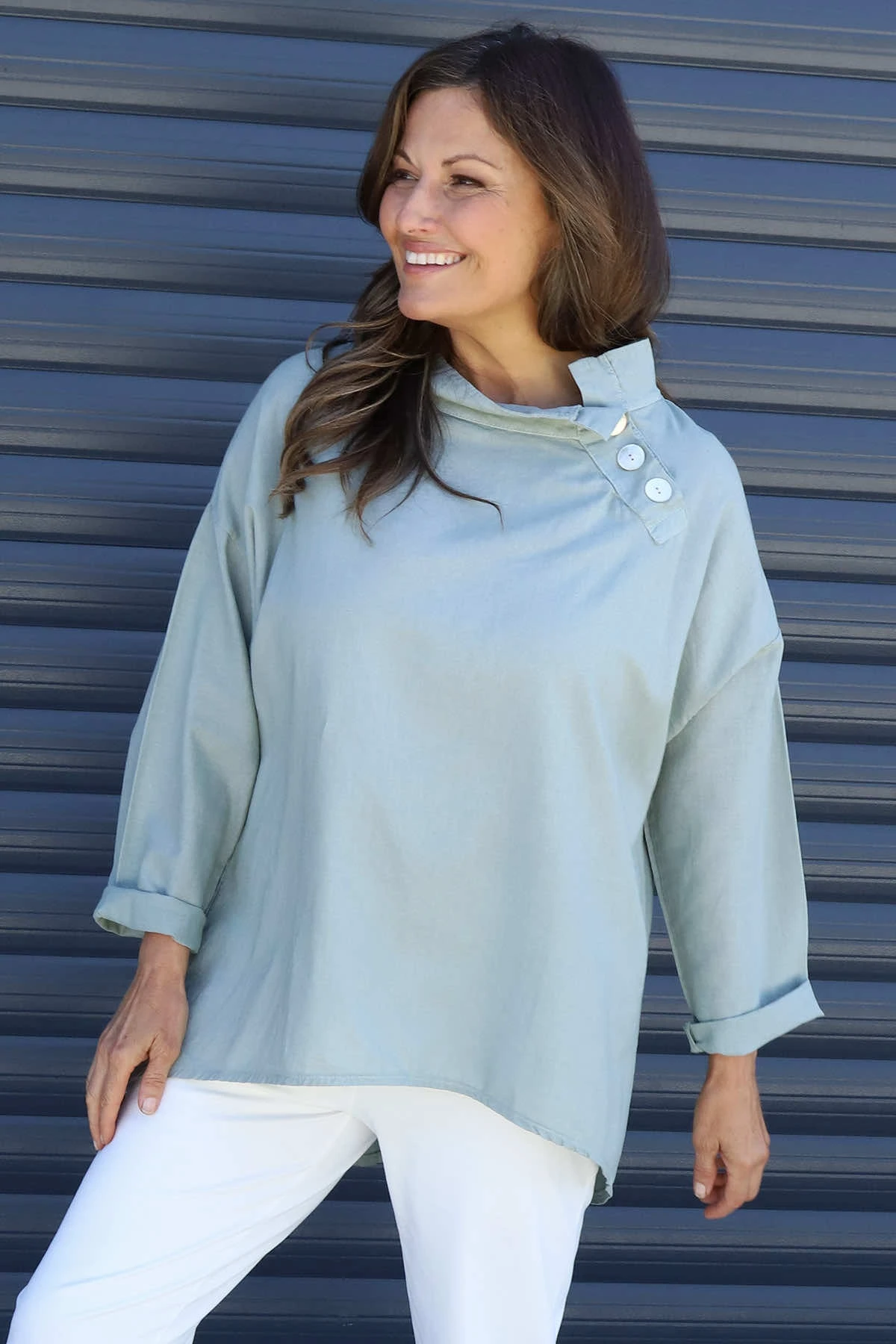 The finishing touch to any look. The Made in Italy Bradley Linen Top features a quirky button collar with full length sleeves and a dipped hemline. Pair with jeans.