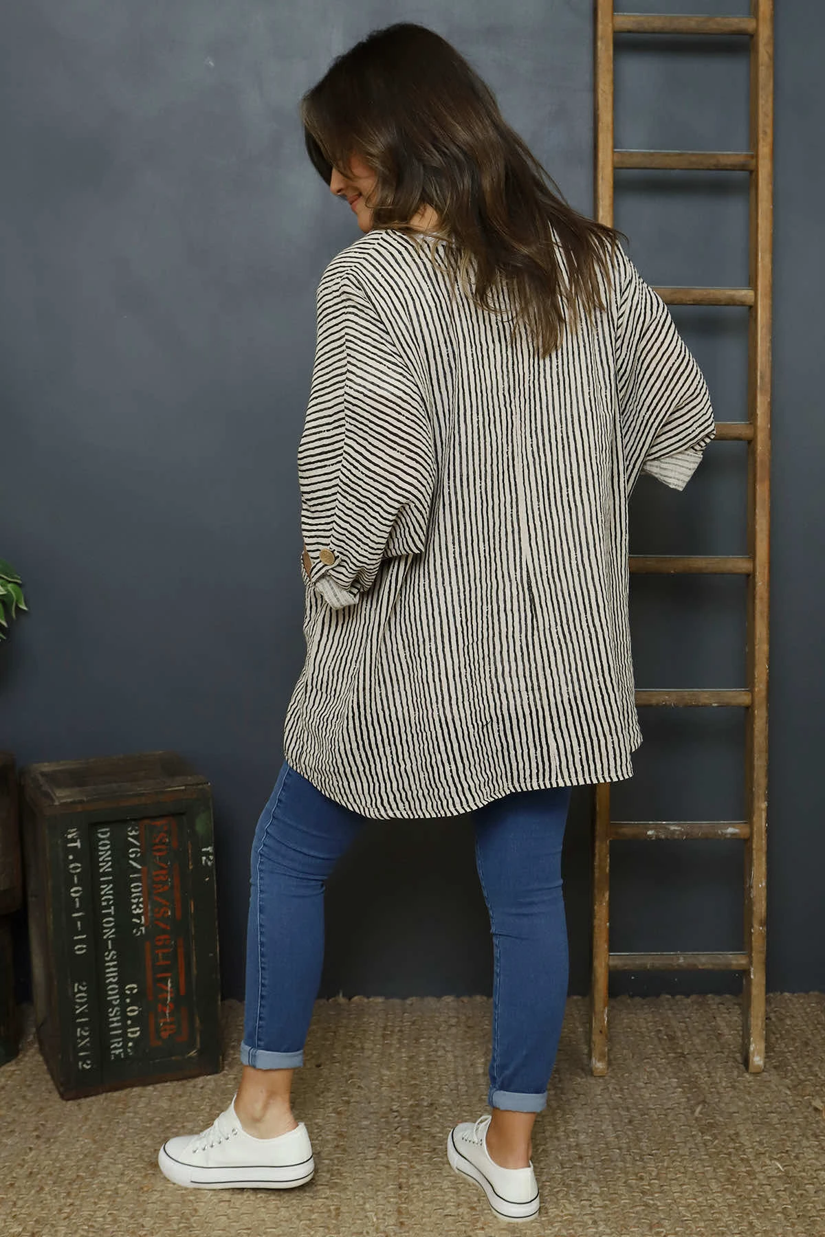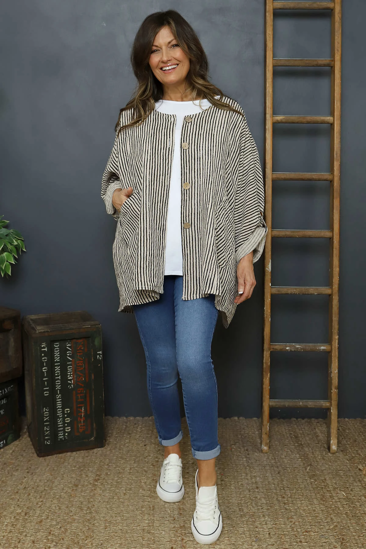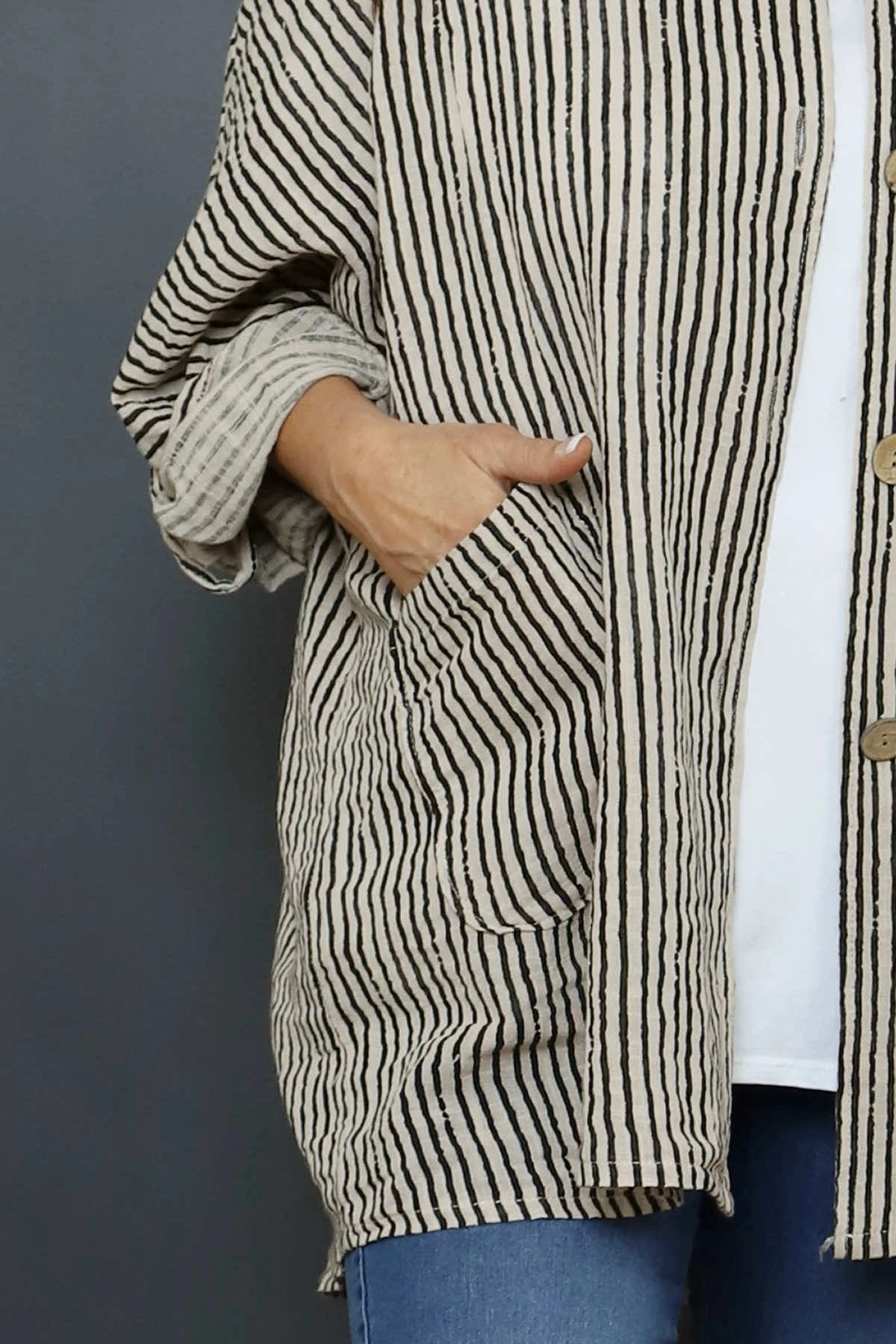 Stay cool and effortlessly chic with the Carlota Stripe Linen Jacket. Made from a luxurious linen and cotton blend, this jacket features stylish stripes, pockets with wooden buttons and a button back sleeve. A versatile and timeless addition to your wardrobe that will elevate any outfit.