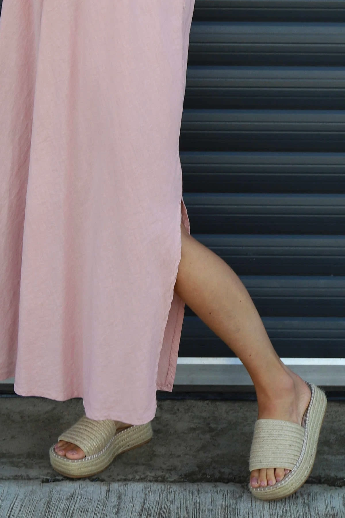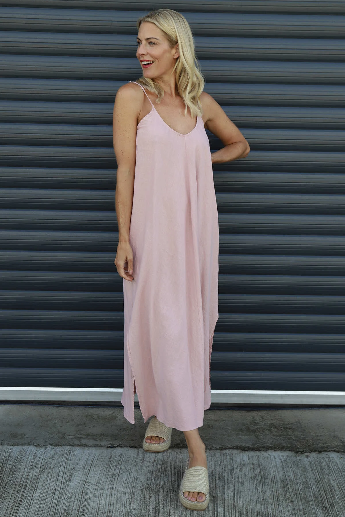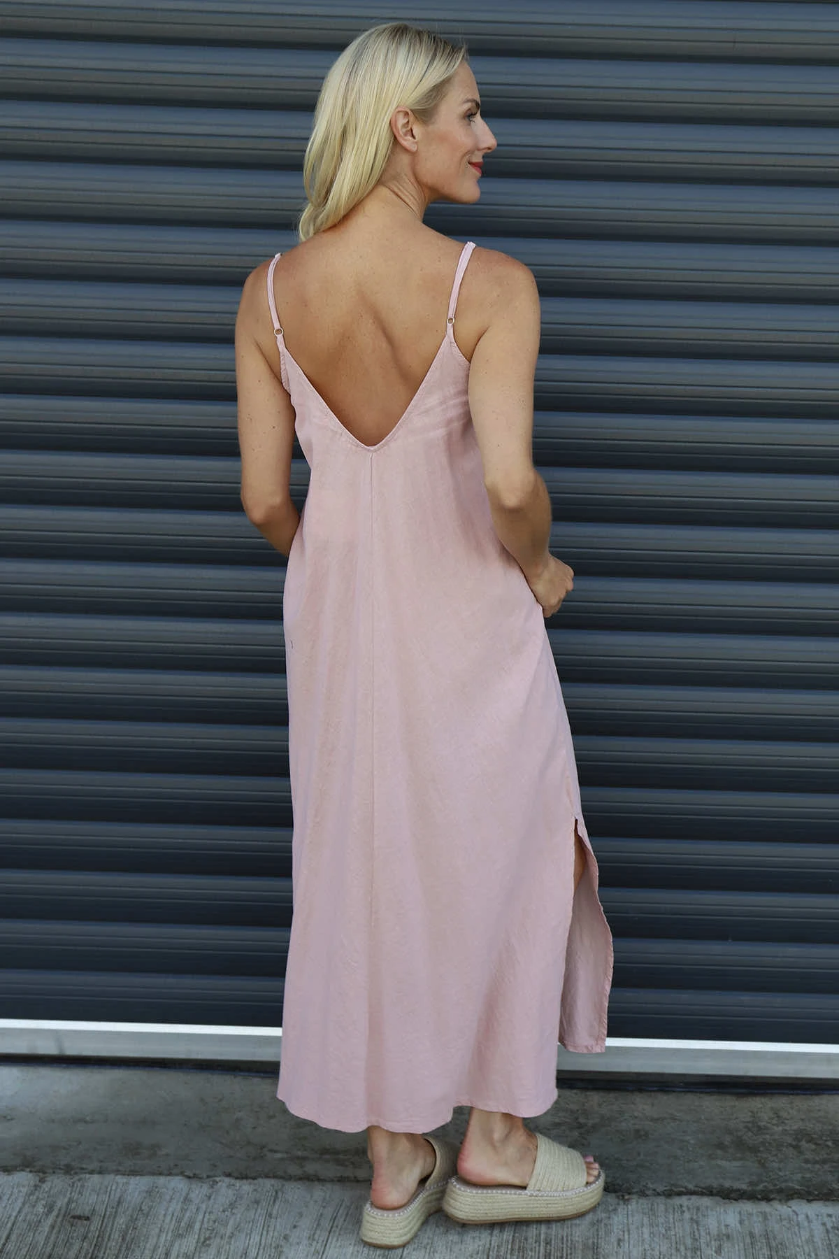 Experience all-day comfort with the Cesca Strap Linen Dress. Crafted from breathable linen, it features thin straps, a flattering V neckline, and a stylish V back for a light, airy feel. Side slits add ease of movement, making this dress perfect for warm days when you want to stay cool and comfortable without sacrificing style.