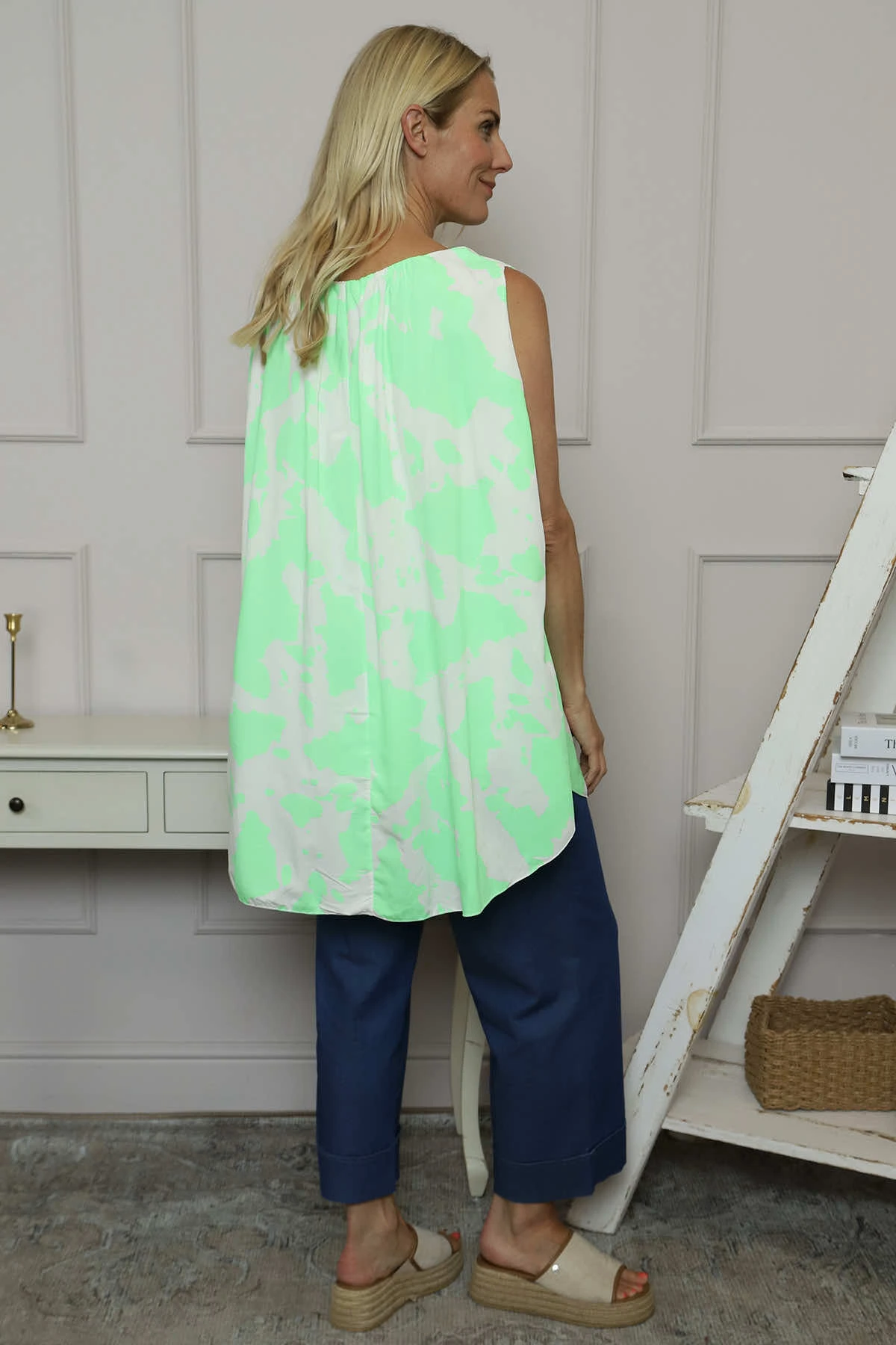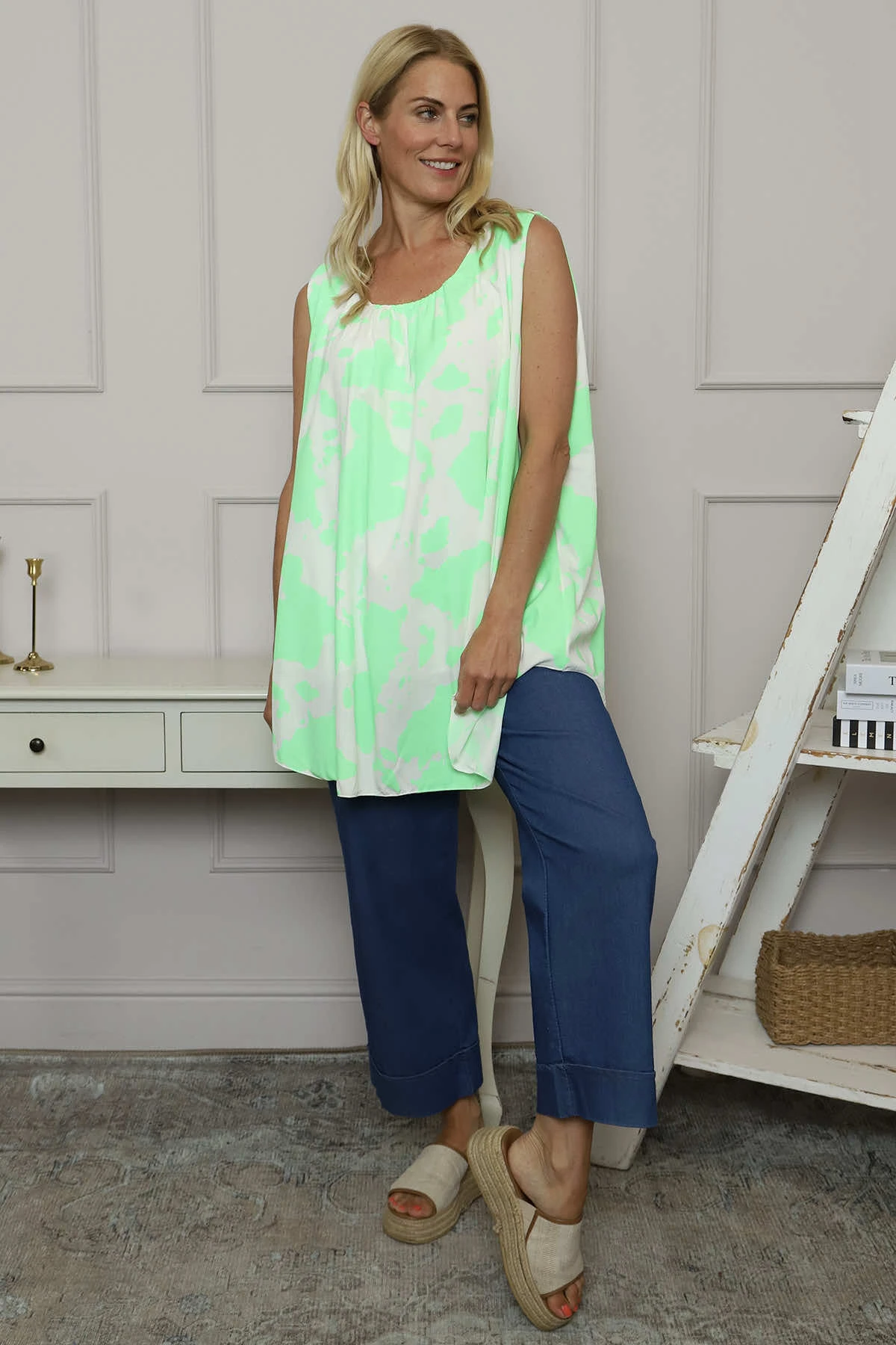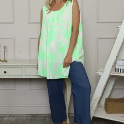 The Clarenza Print Top combines eye-catching bold pattern with a comfortable sleeveless design. Its flattering round neckline creates a versatile silhouette that works beautifully for both casual outings and dressier occasions. This statement piece effortlessly elevates your wardrobe while keeping you cool and confident all day long.