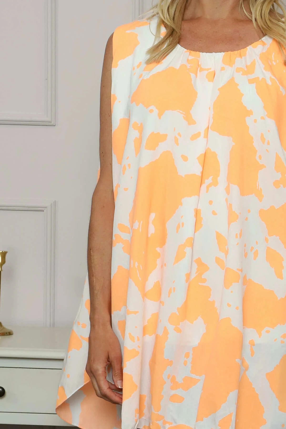 The Clarenza Print Top combines eye-catching bold pattern with a comfortable sleeveless design. Its flattering round neckline creates a versatile silhouette that works beautifully for both casual outings and dressier occasions. This statement piece effortlessly elevates your wardrobe while keeping you cool and confident all day long.