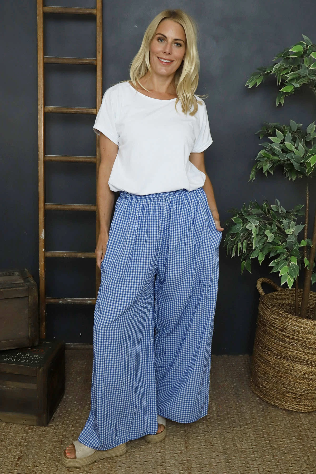 The Daphne Gingham Wide Leg Trousers combine comfort with classic style. Featuring a flattering wide leg silhouette and convenient elasticated waist for all-day ease. The timeless gingham print adds character to your wardrobe, while practical pockets enhance functionality. Perfect for creating effortlessly stylish outfits for any occasion.