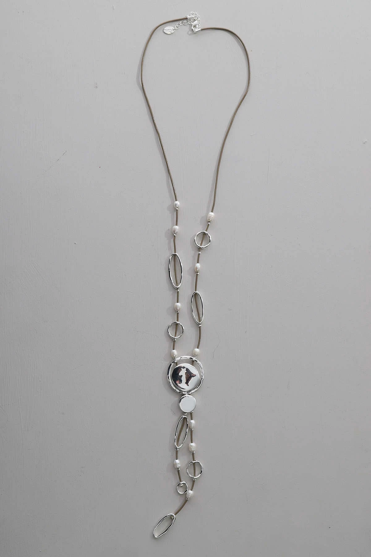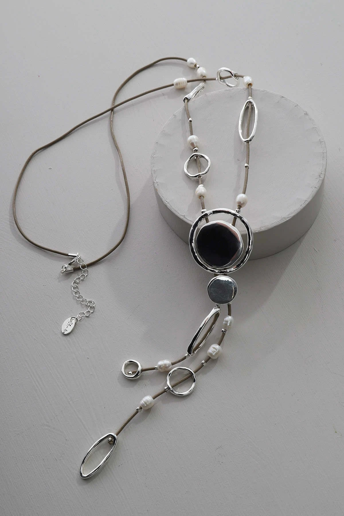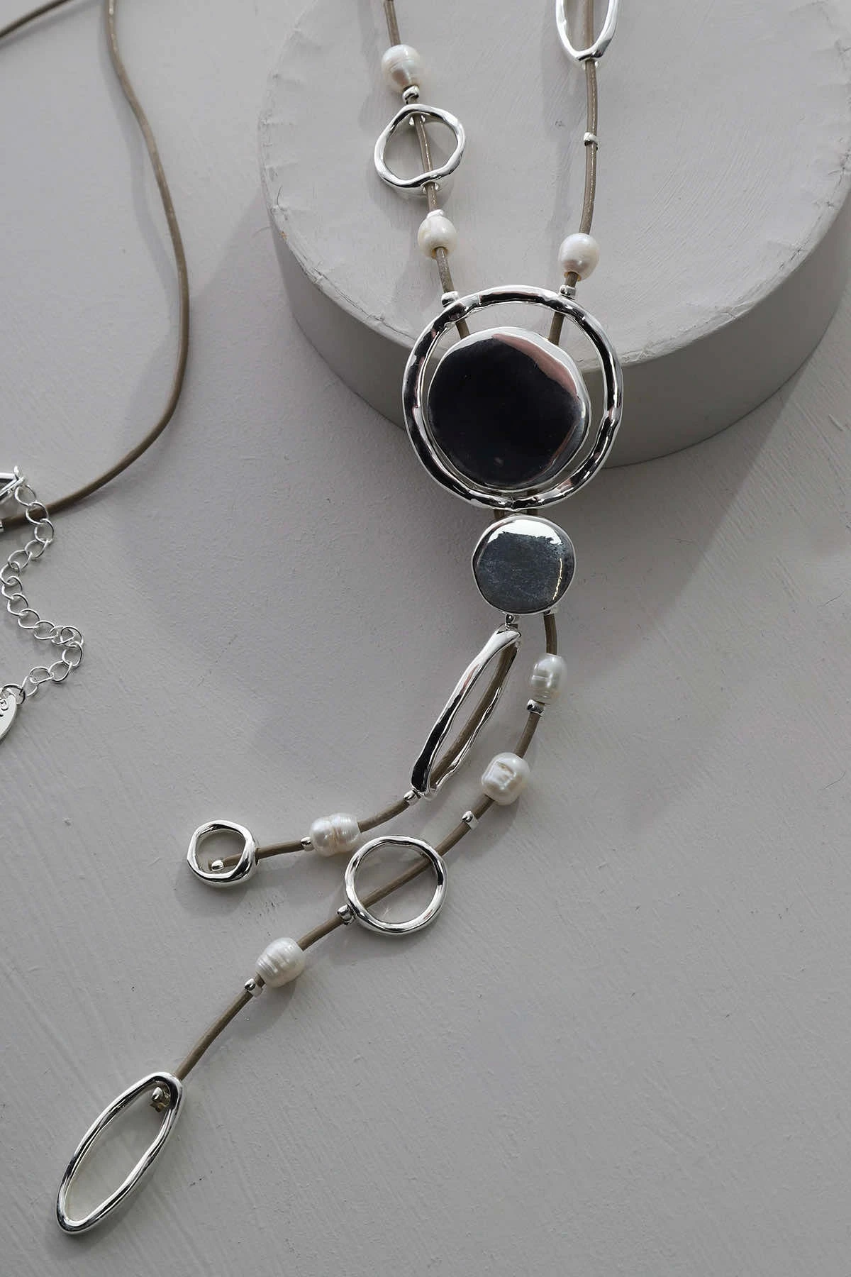 The Darla Necklace Silver adds a stunning touch to your look with its pearl details and abstract shapes. Add a luxe finish to your ensemble for an unforgettable look.