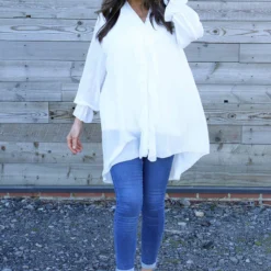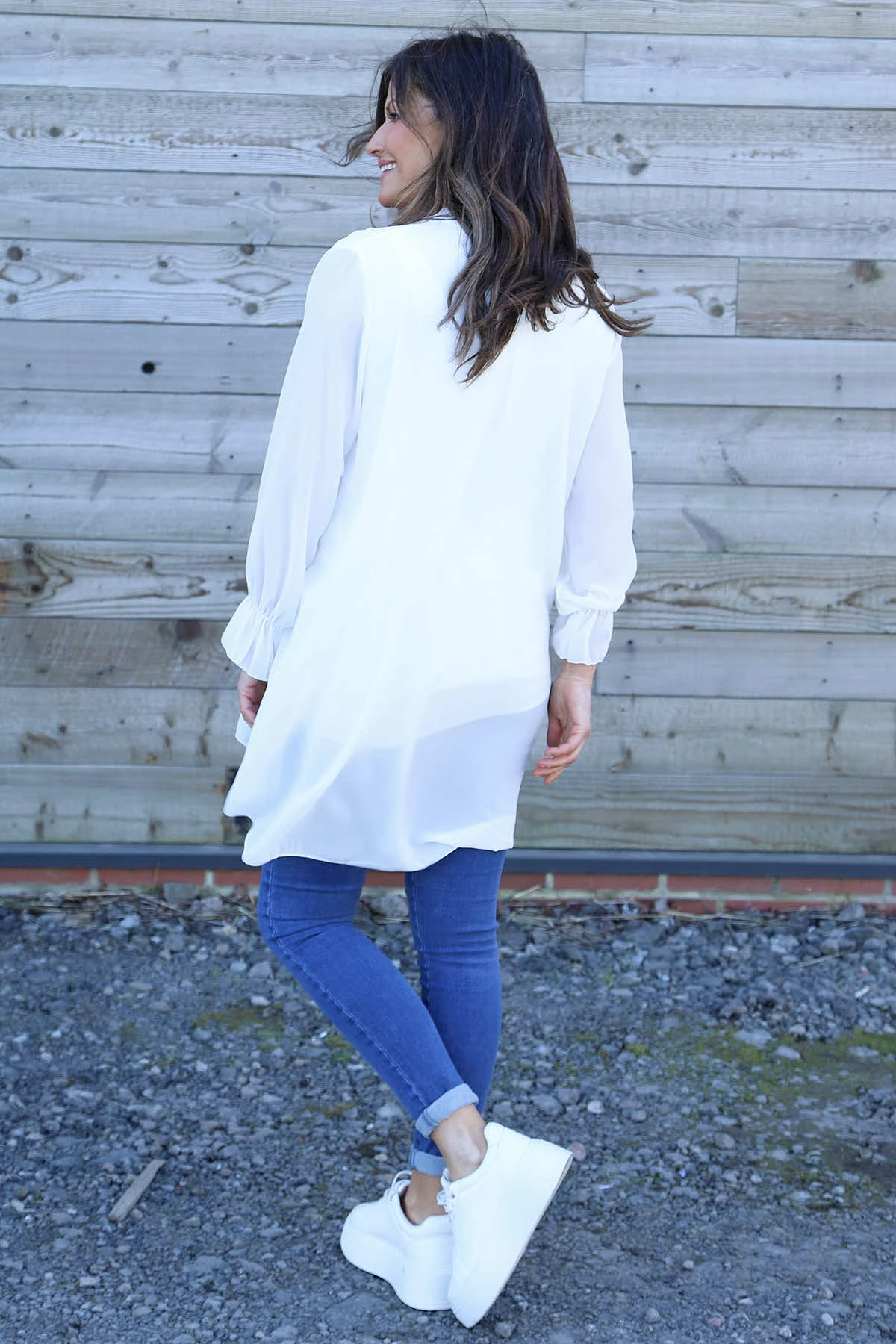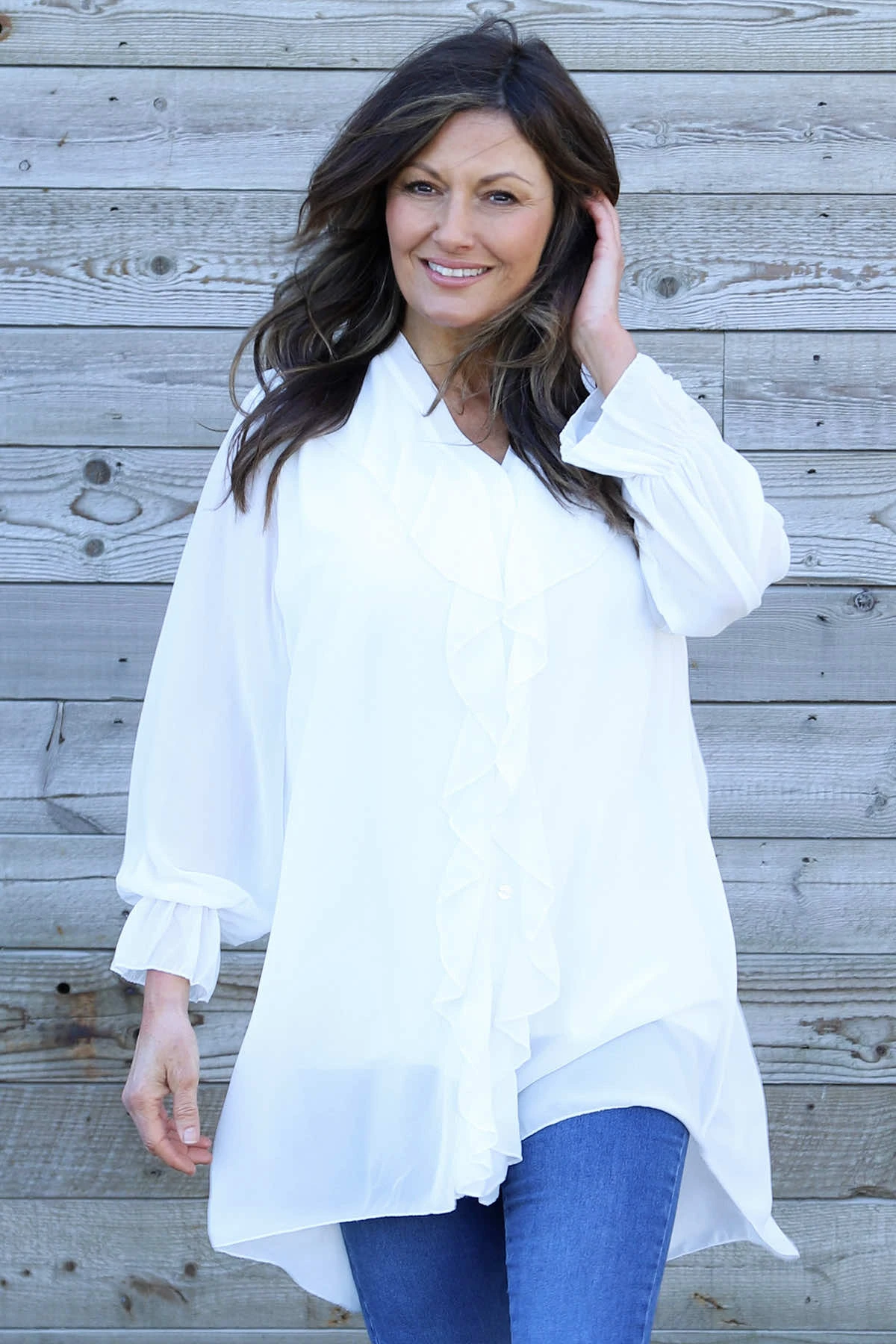 Do you need a look for all of your events this year? Then you need The Made in Italy Dorota Shirt Tunic! This elegant style is perfect for elevating your look for any occasion! Featuring a frill collar down to the hem with full length sleeves and button fastening which enables the tunic to be worn open as a jacket.