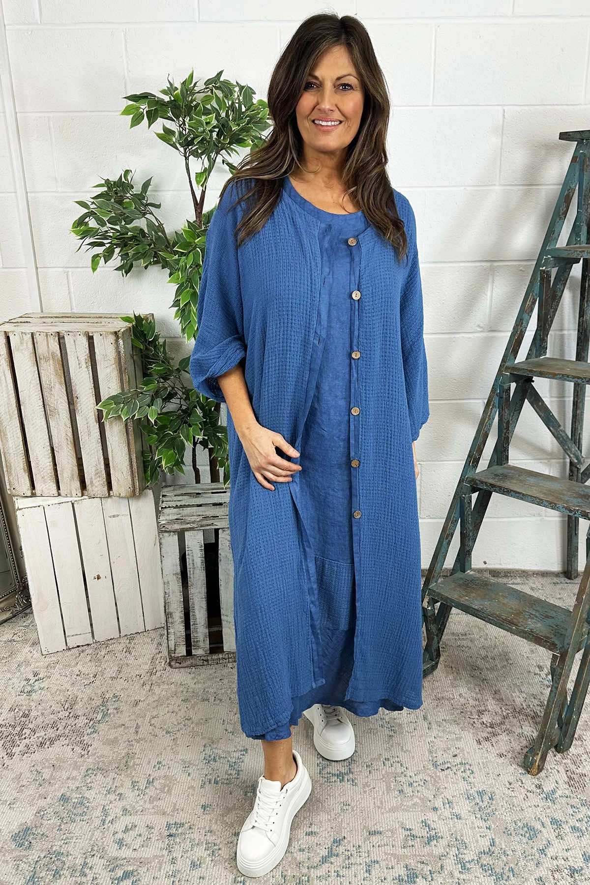 This Made in Italy Elvira Co-ord Set features a sleeveless linen dress paired with a lightweight cotton jacket. The dress is a classic piece with a cotton panel on the bottom, while the jacket can be worn open or fastened with buttons. A must-have for any wardrobe!