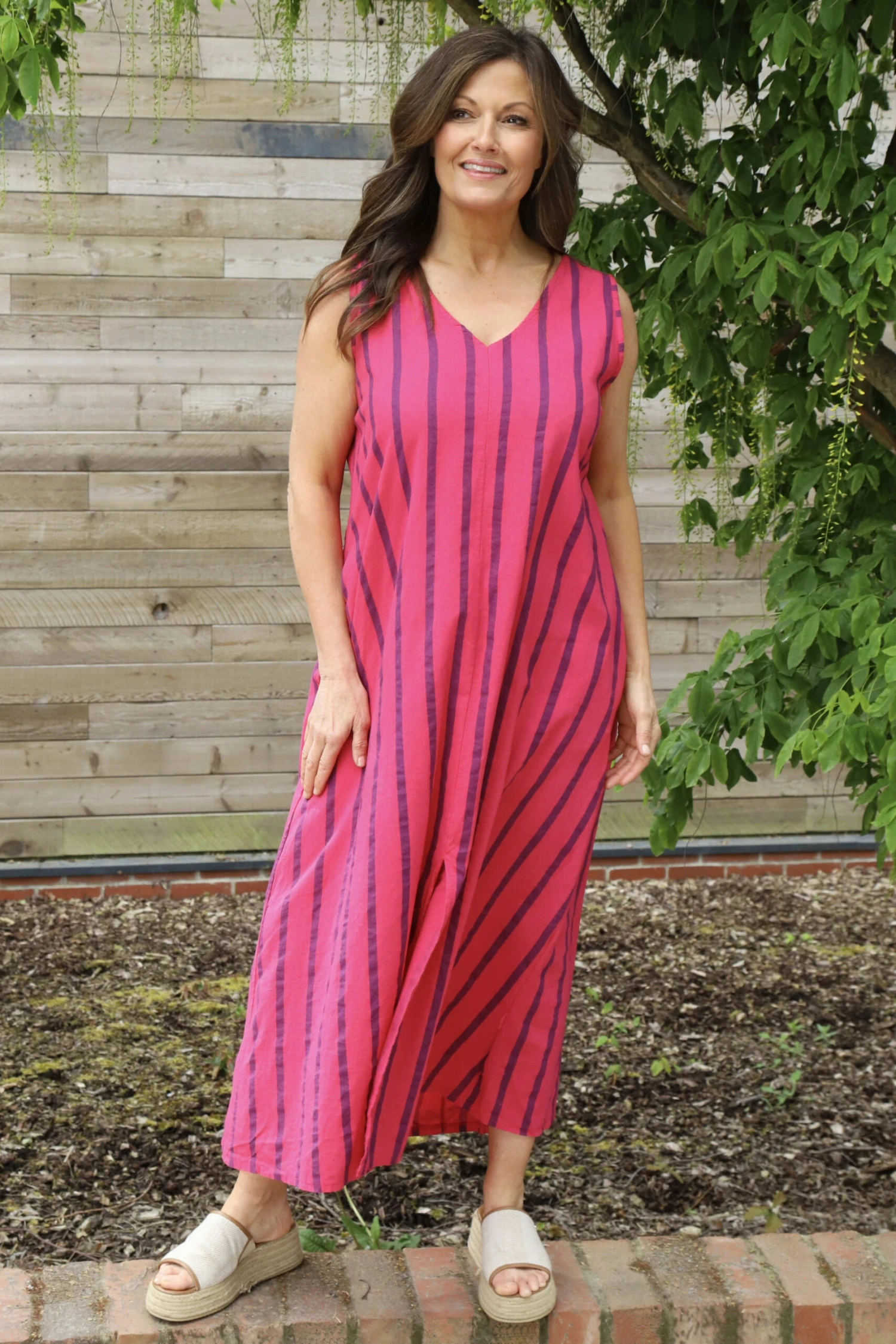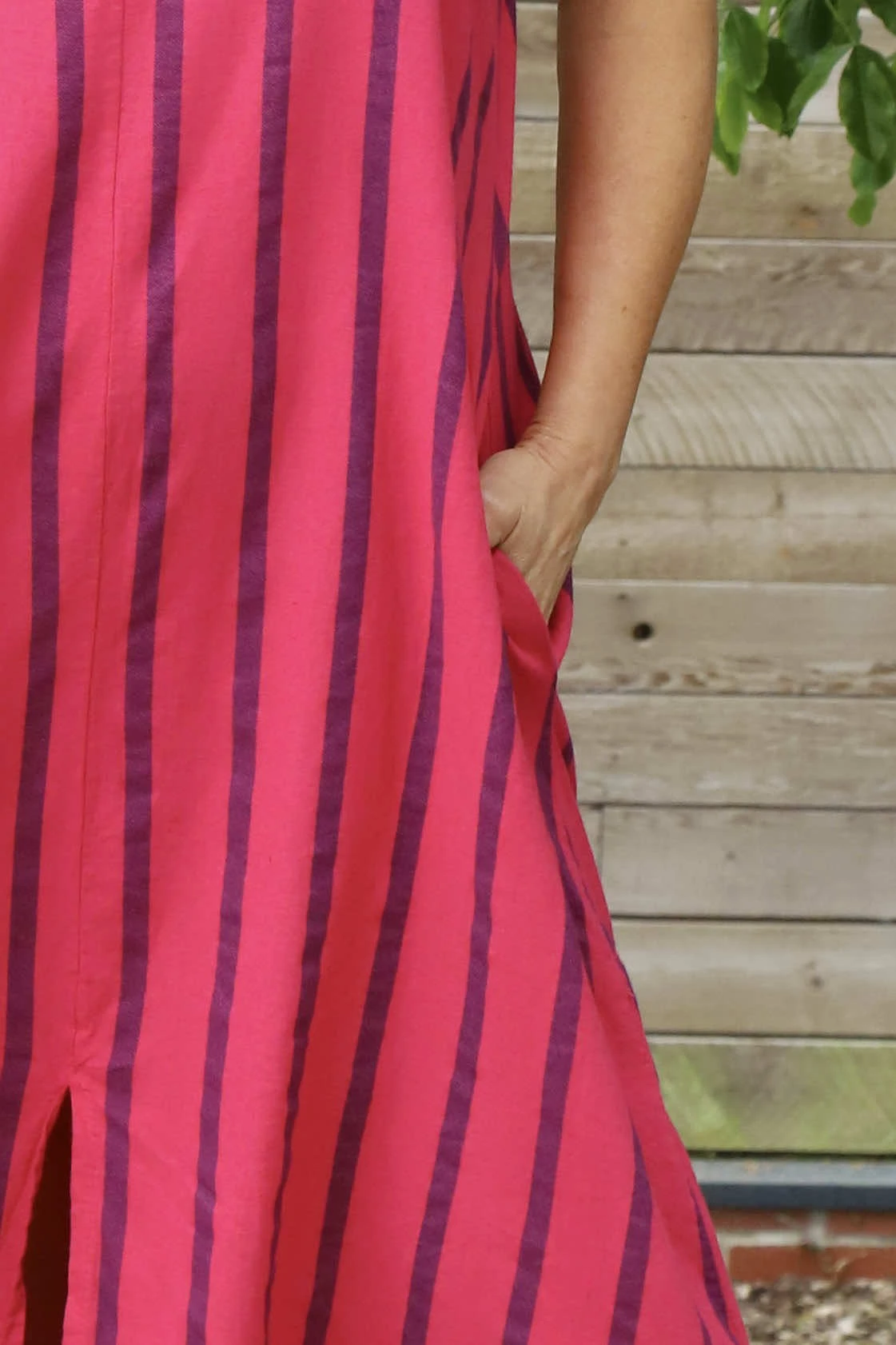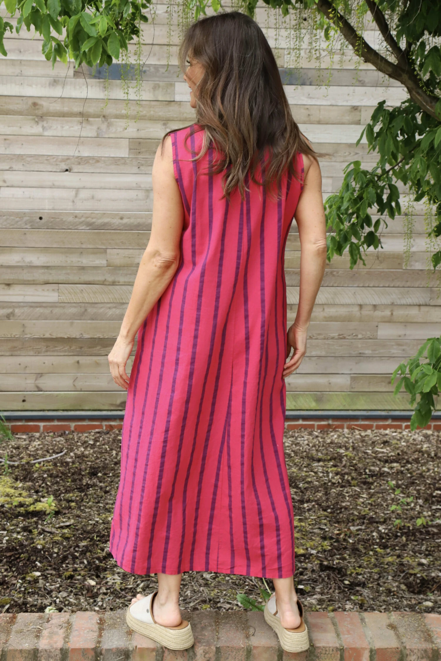 Enza Linen Sleeveless Stripe Dress Fuchsia