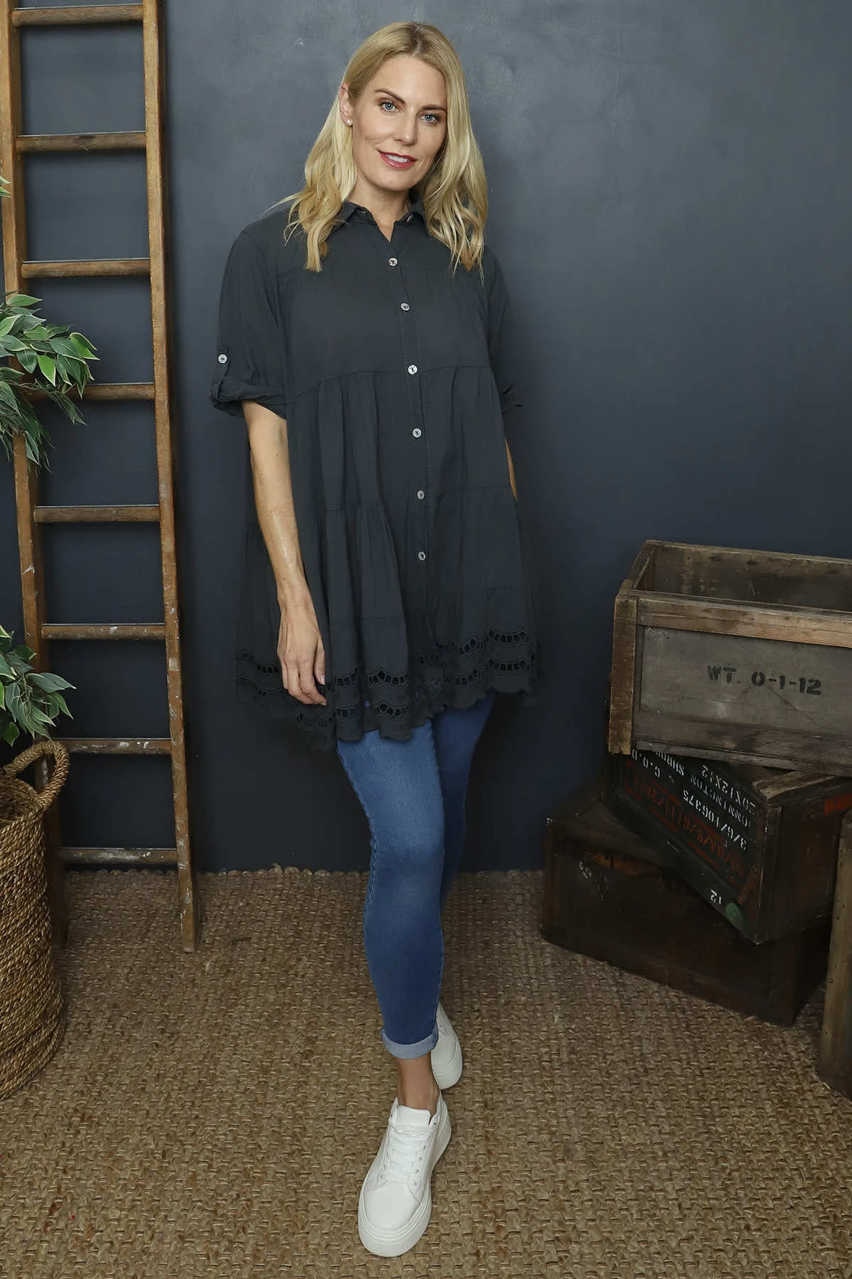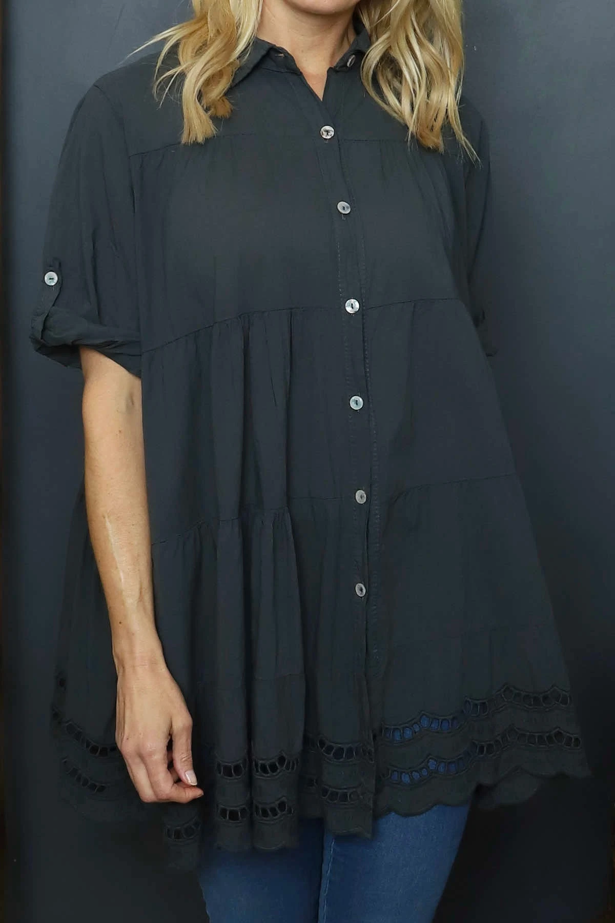 Introducing the Ermina Tiered Cotton Shirt! This classic shirt features elbow-length sleeves, a traditional collar, and a unique tiered design with delicate broderie anglaise accents along the hemline. Perfect for adding a touch of elegance to your wardrobe.