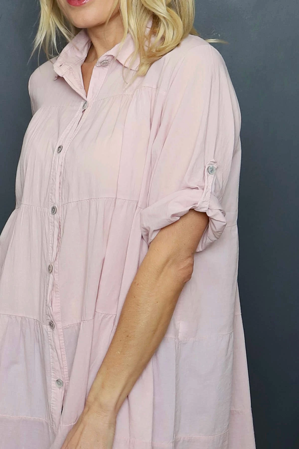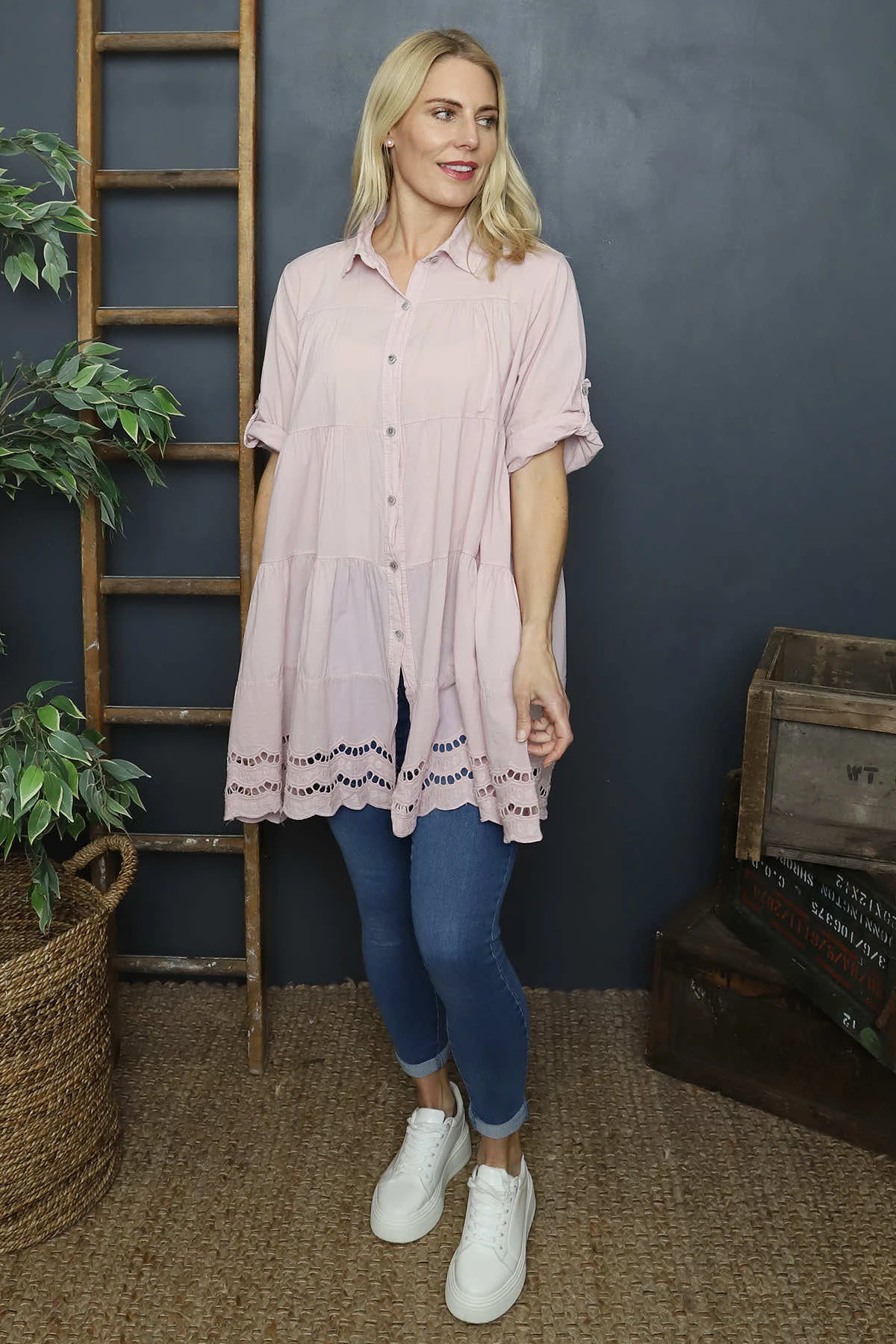 Introducing the Ermina Tiered Cotton Shirt! This classic shirt features elbow-length sleeves, a traditional collar, and a unique tiered design with delicate broderie anglaise accents along the hemline. Perfect for adding a touch of elegance to your wardrobe.