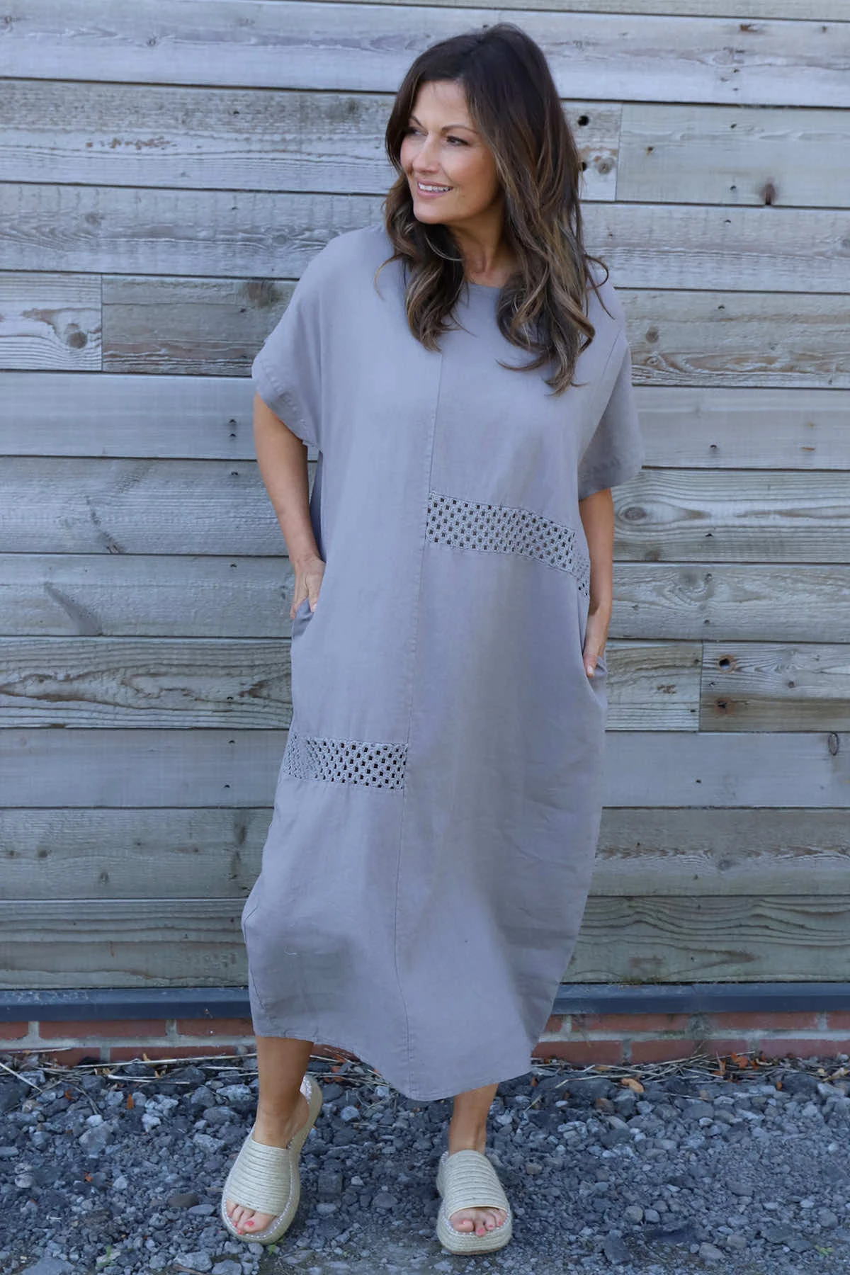 Embrace effortless style with the Felicia Crochet Detail Linen Dress. Featuring a flattering round neckline and comfortable short sleeves, this dress is enhanced by delicate crochet panels that add a touch of elegance. Practical pockets provide convenience without compromising on design. Perfect for warm days, its breathable linen blend fabric keeps you cool while looking chic. Step out confidently in a dress that combines comfort and fashion-forward details.