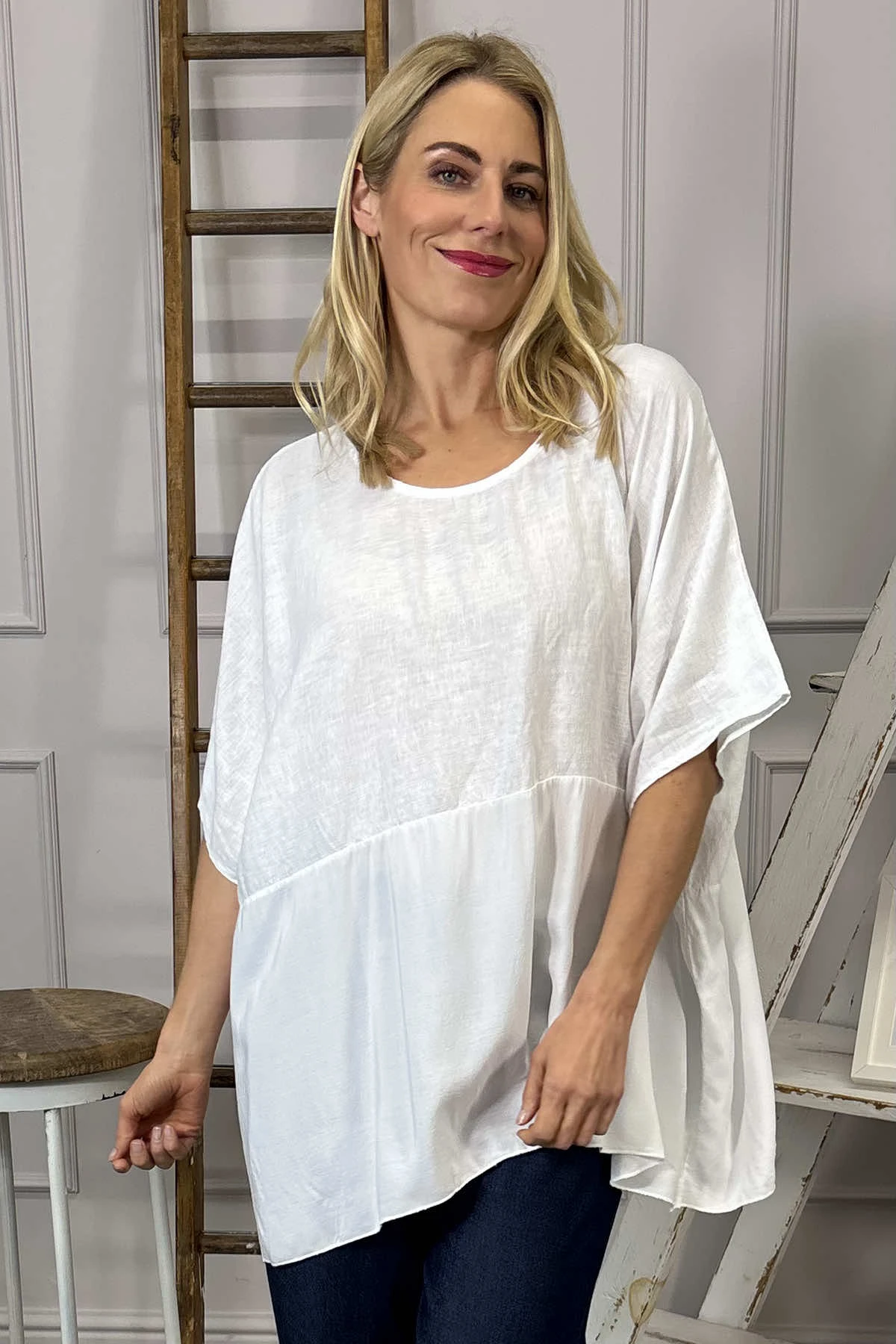 Discover the gorgeous Freya Top. A fabulous piece that does all the hard work for you. Featuring a round neckline, drop shoulder, short sleeves and contrasting fabric hemline. Made to flatter any shape.
