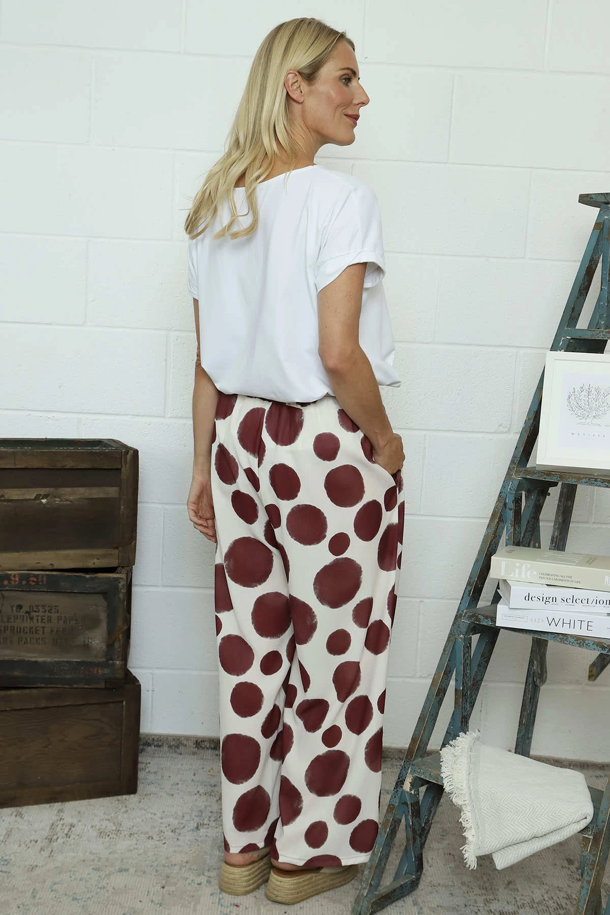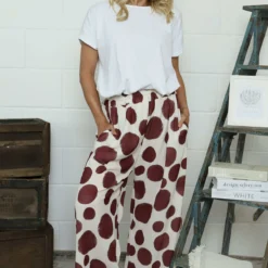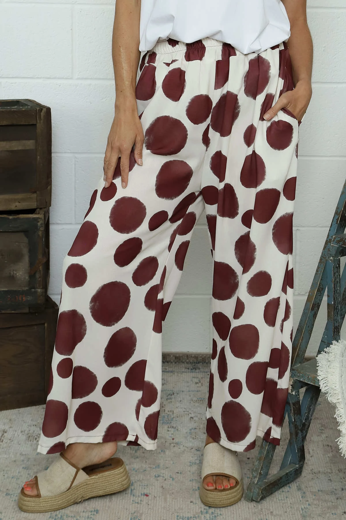 Embrace effortless style with our Hetty Wide Leg Print Trousers. Featuring a comfortable elasticated waist and practical pockets, these trousers offer both fashion and function. The playful spot pattern adds character to your outfit while the wide-leg silhouette ensures all-day comfort. Perfect for dressing up or down with your favourite Kit and Kaboodal pieces.