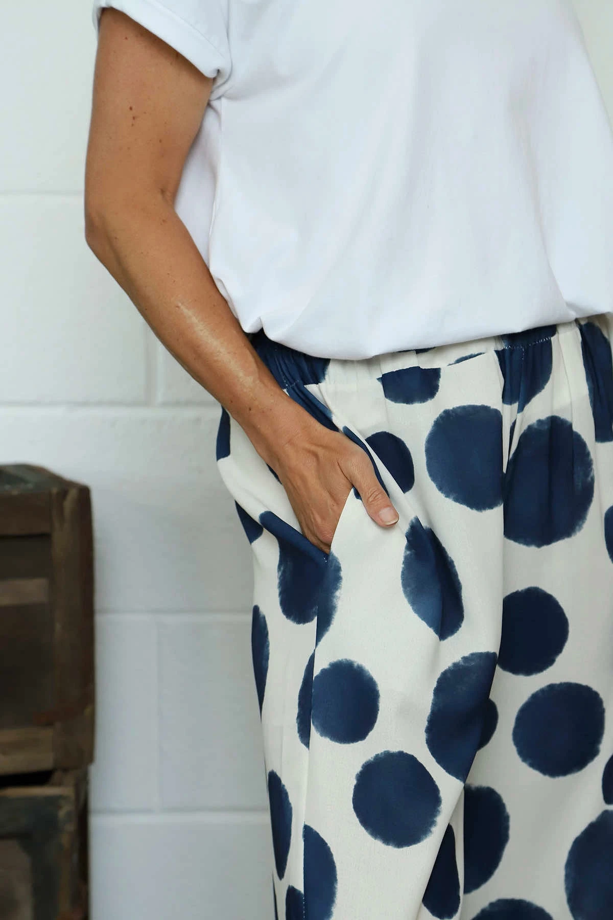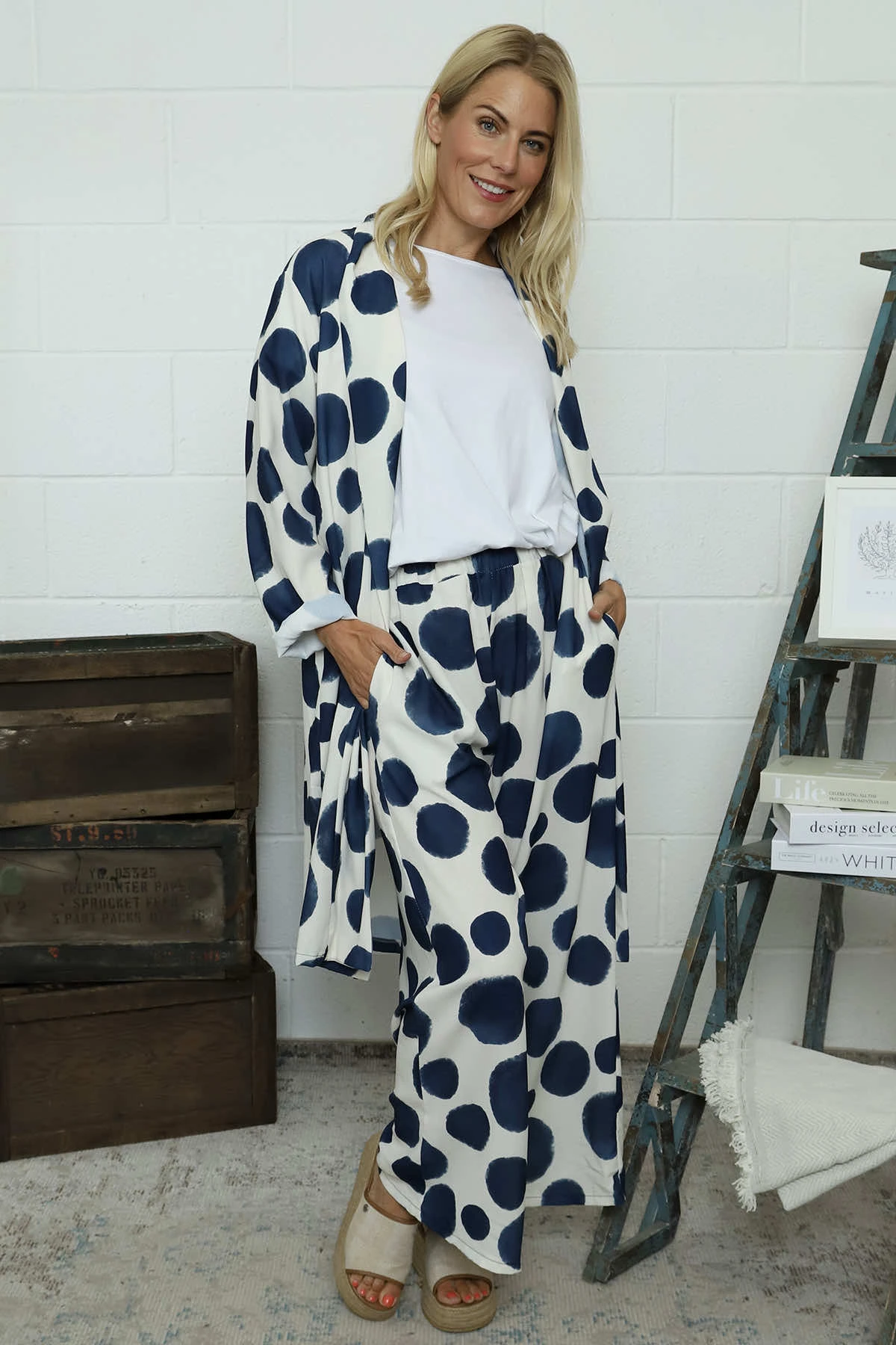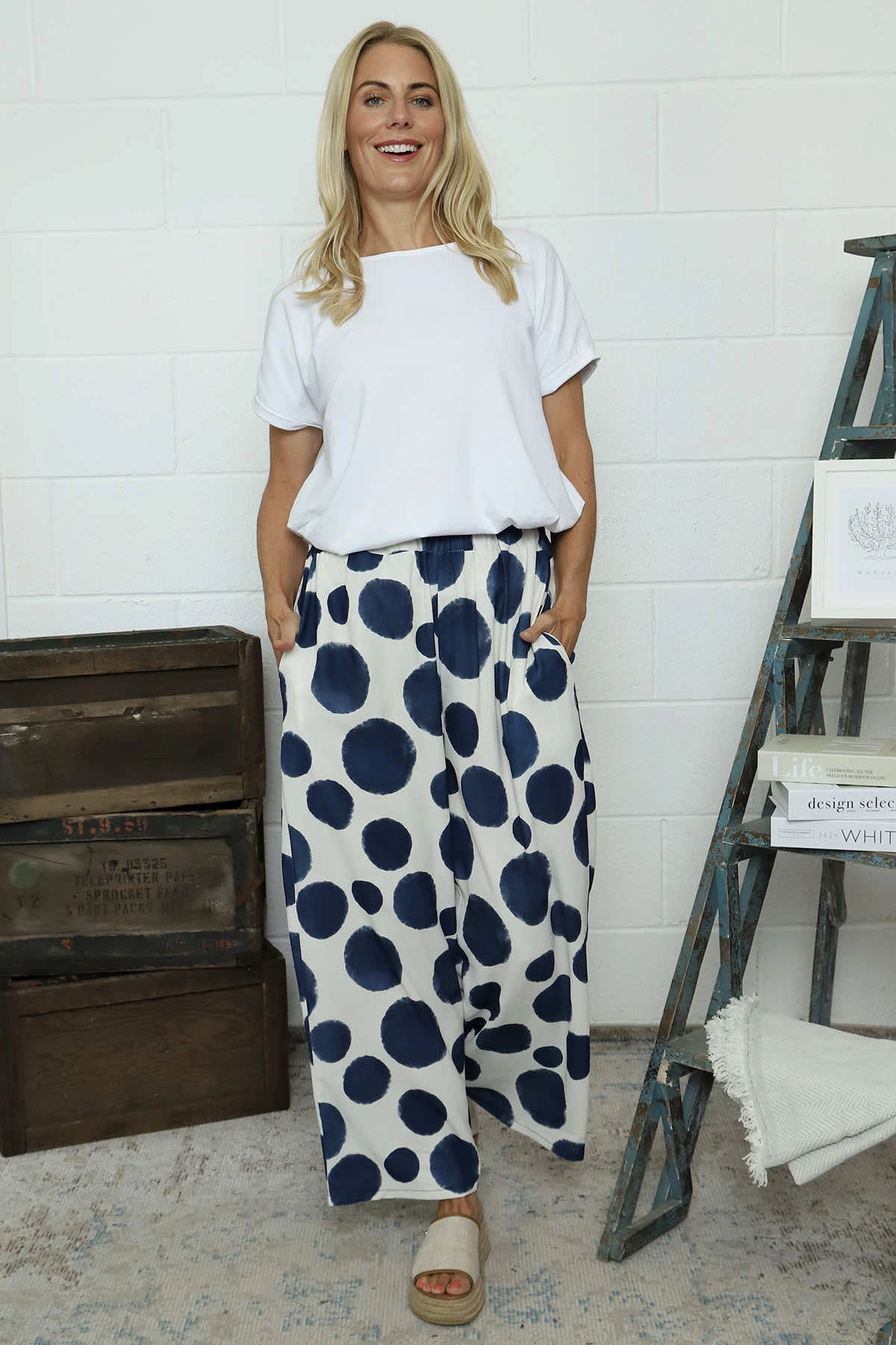 Embrace effortless style with our Hetty Wide Leg Print Trousers. Featuring a comfortable elasticated waist and practical pockets, these trousers offer both fashion and function. The playful spot pattern adds character to your outfit while the wide-leg silhouette ensures all-day comfort. Perfect for dressing up or down with your favourite Kit and Kaboodal pieces.