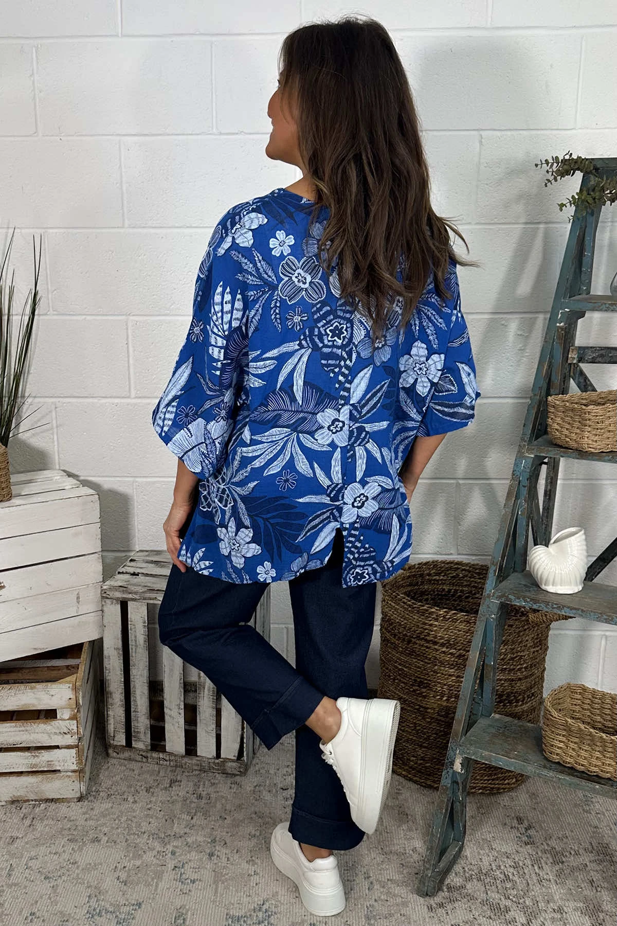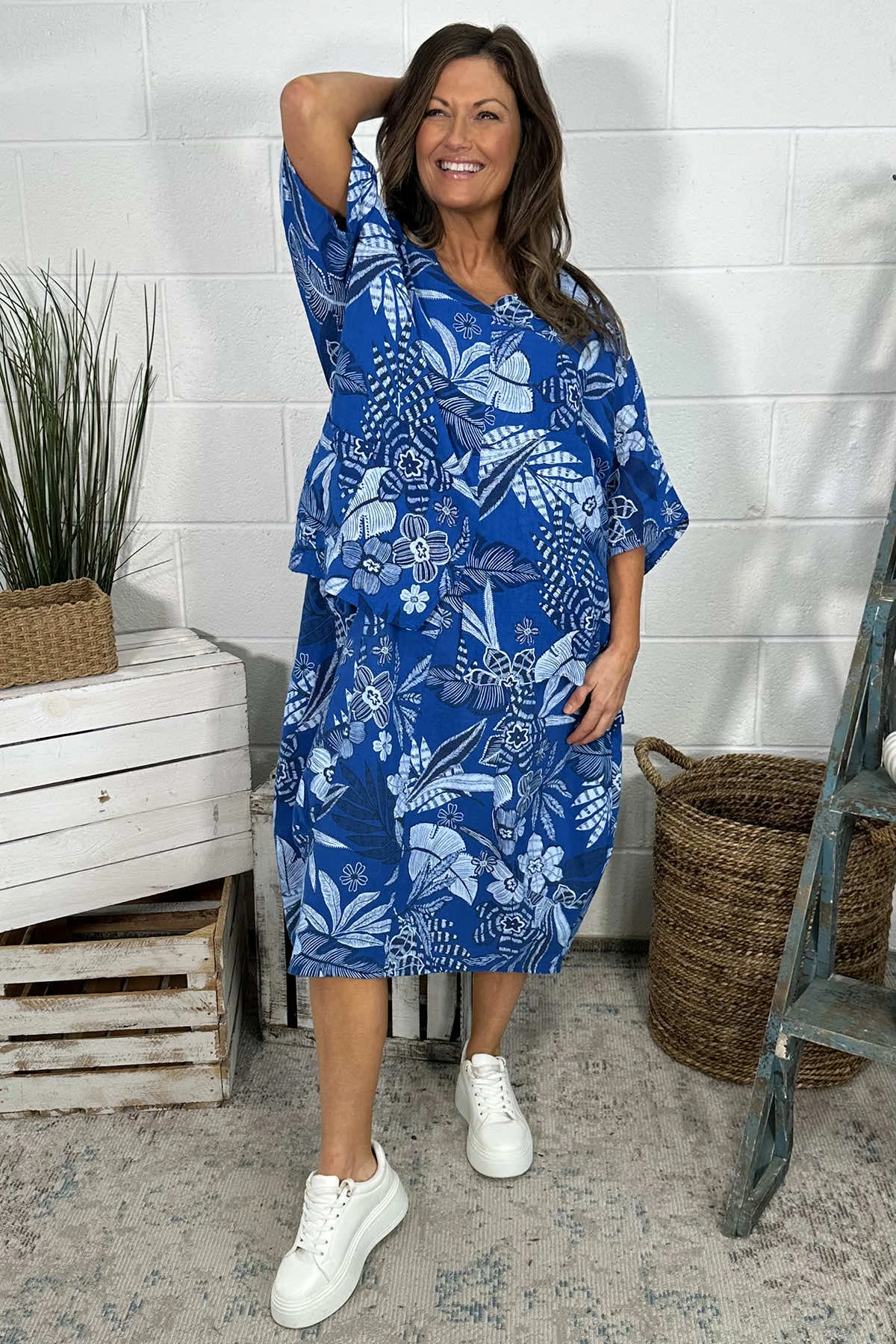 Indulge in luxury with our Isolde Print Linen Top. Featuring a slight v-neckline, batwing style sleeves, and an all over print. Crafted from a blend of linen and cotton, it also boasts a pocket, seam details, and stylish hemline splits. Elevate your wardrobe with this piece.