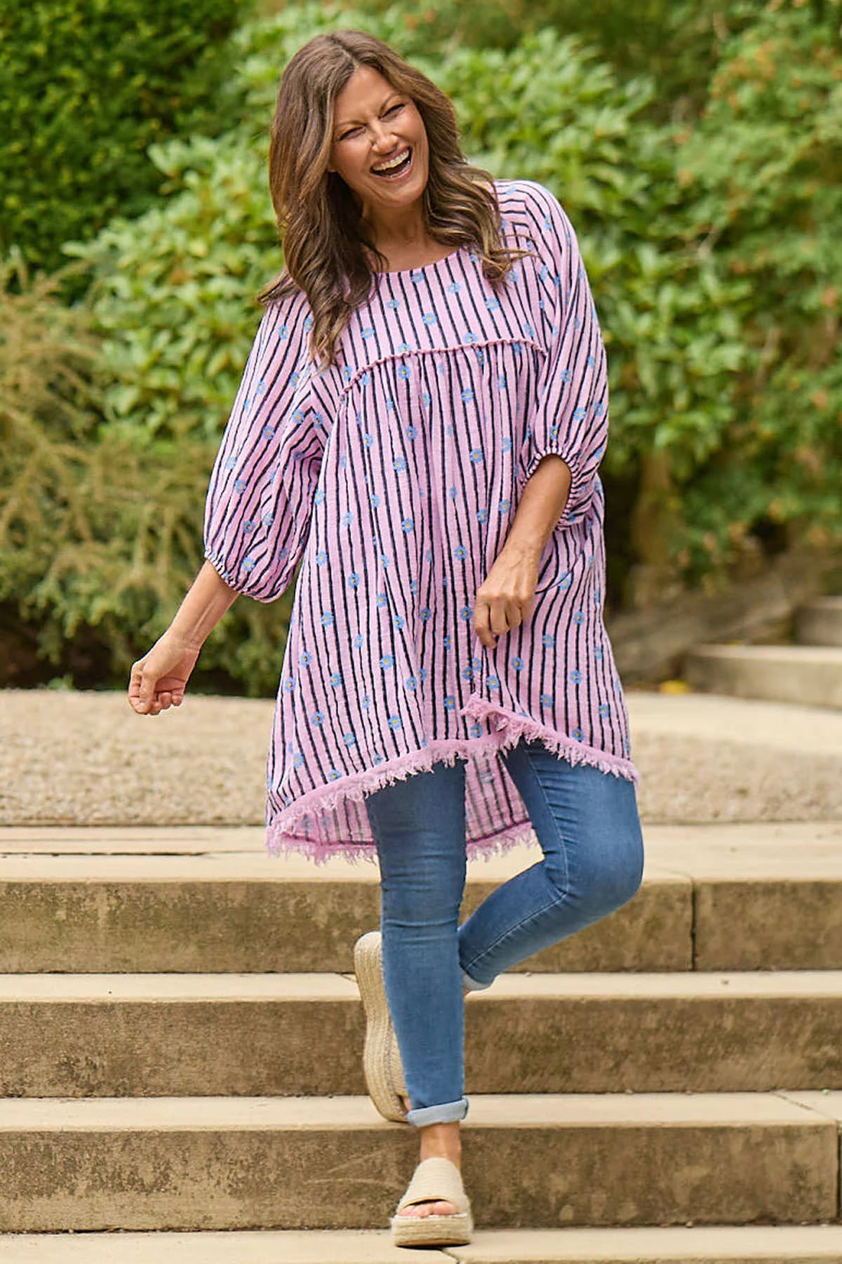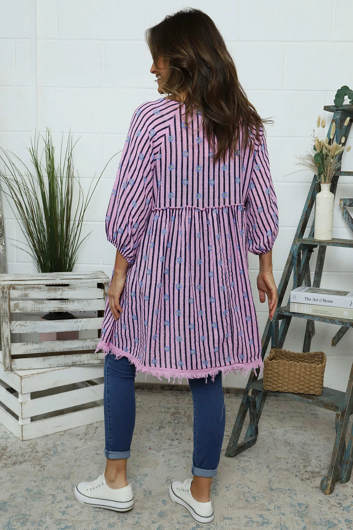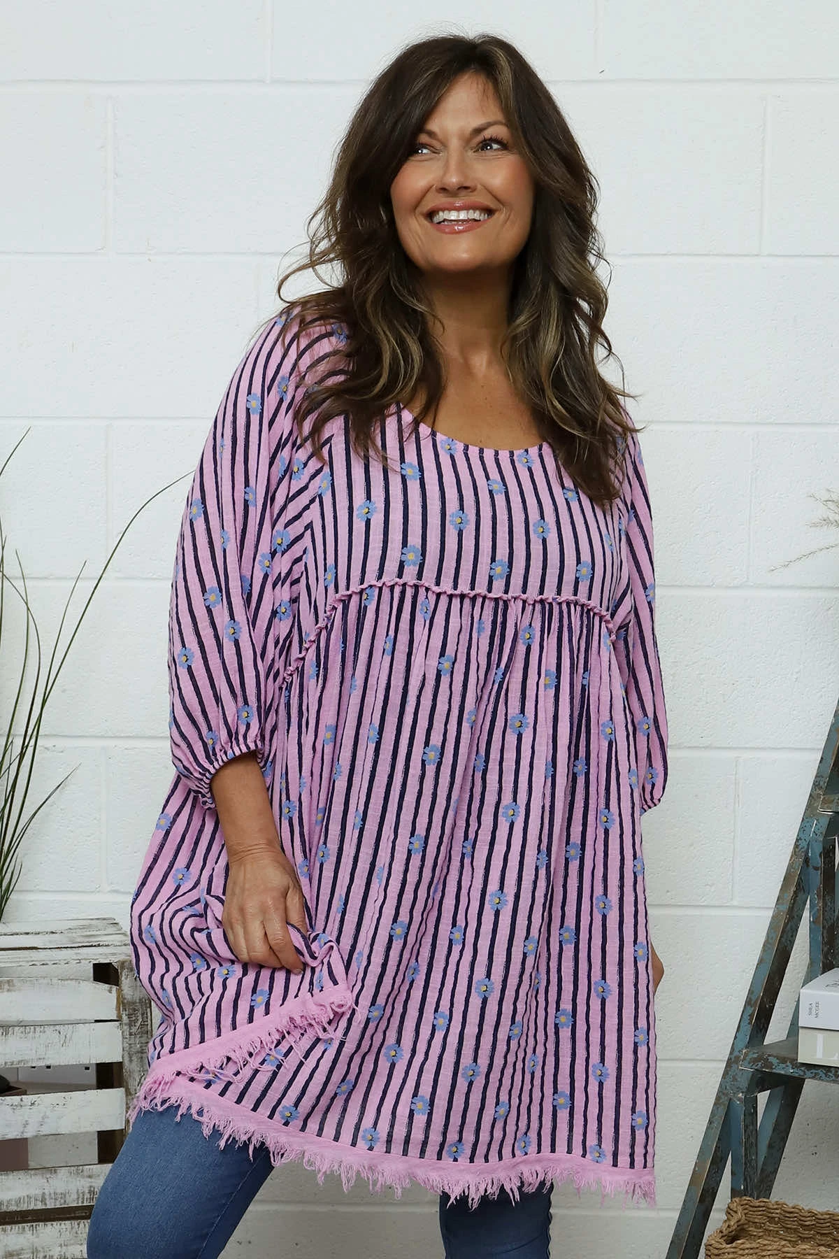 Discover a new take on our beloved Kadenzia tunic with this version featuring small flower details and stripes. Stand out in style with this fun and unique pattern, while enjoying all the original features that make this tunic a must-have. Made with soft and breathable cotton for all-day comfort.