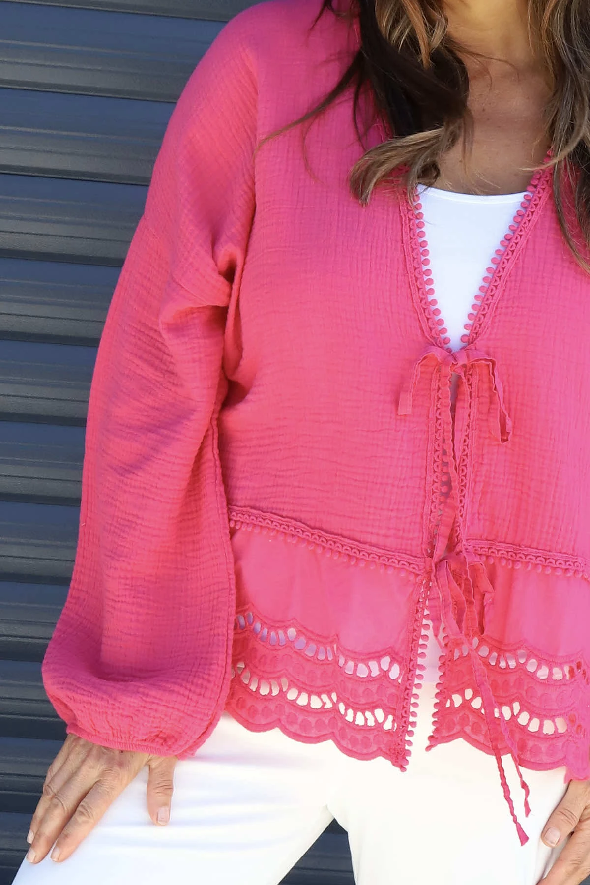 Stay stylish all summer with the Kalkan Crinkle Cotton Jacket. Featuring a trendy tie front and a unique crinkle texture, this jacket adds effortless charm to any outfit. The delicate embroidered hem brings a touch of elegance, while the long sleeves offer light coverage for cooler evenings. Perfect for layering, it combines comfort and style to keep you looking and feeling great throughout the season.