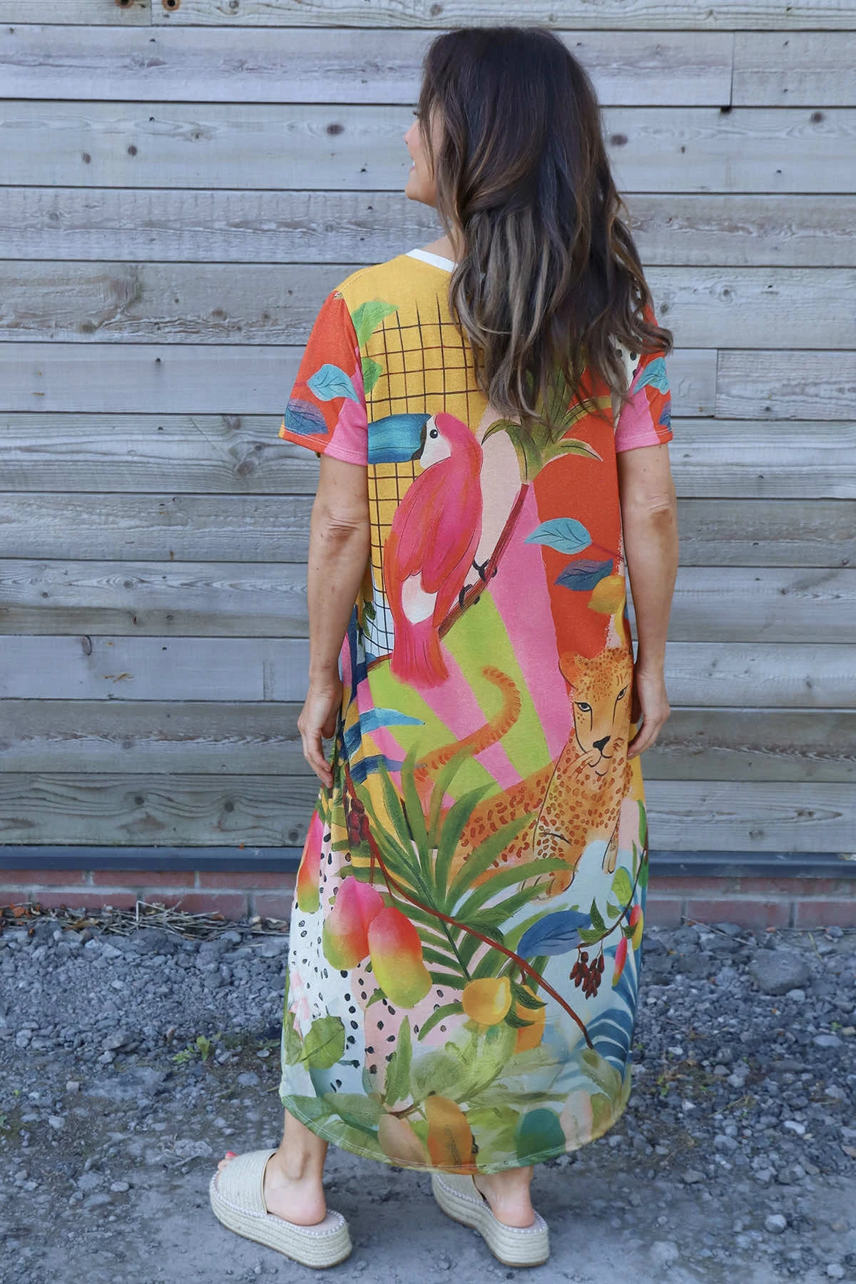 Get ready for summer with the Lima Print Dress. Featuring a flattering V neckline and short sleeves, this dress offers a breezy fit perfect for warm days. The all-over eye-catching print is enhanced with a subtle sparkle, adding a touch of shimmer that catches the light beautifully. Ideal for sunny outings or relaxed evenings, this dress combines comfort with a hint of glamour to support your summer wardrobe effortlessly.