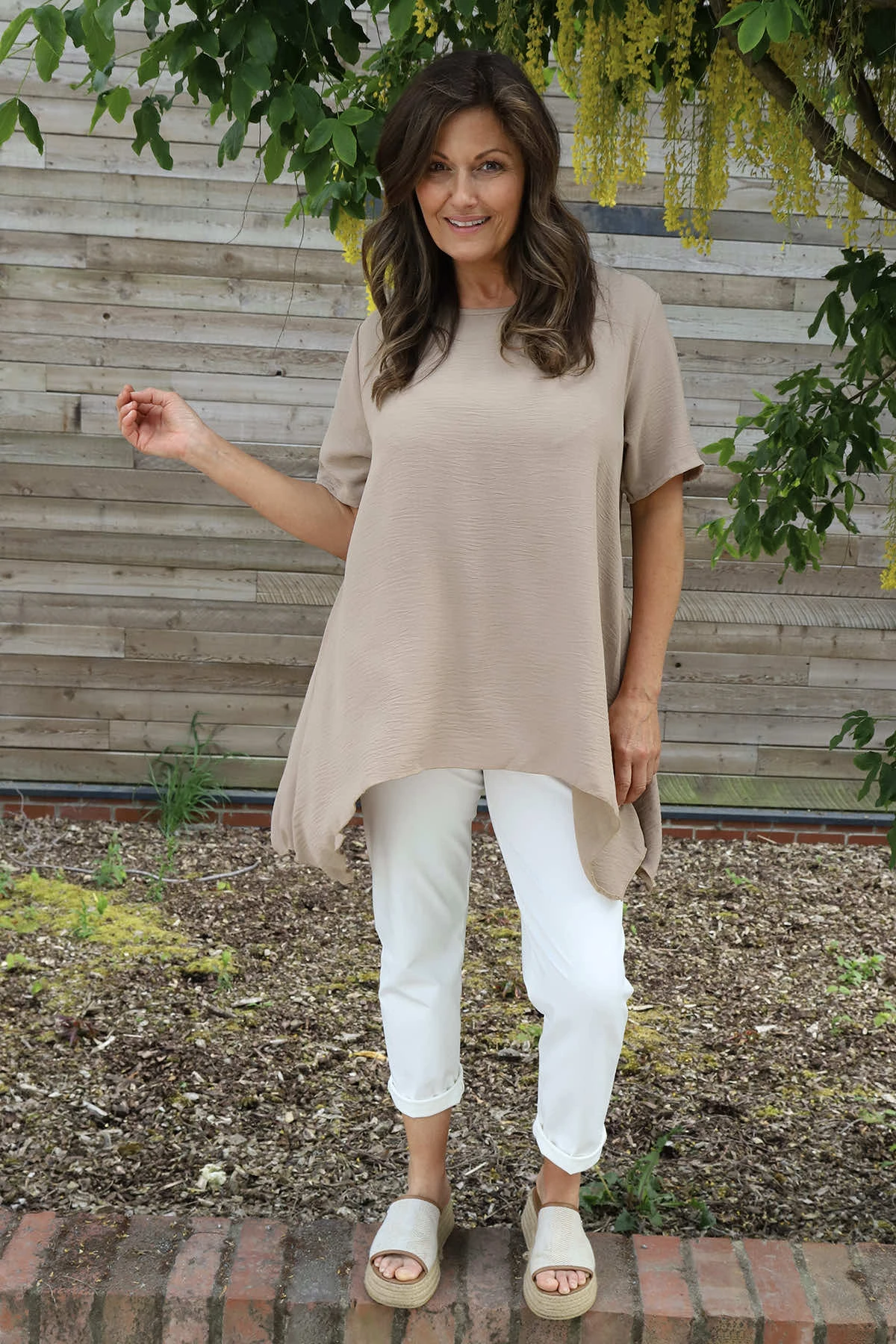 The Loreleigh Dipped Side Top features a flattering round neckline and short sleeves, designed with a dipped side that enhances your silhouette beautifully. This versatile piece can be effortlessly dressed up or down, making it a perfect addition to your wardrobe for any occasion. Comfortable and stylish, it supports your shape while offering easy elegance throughout the day.