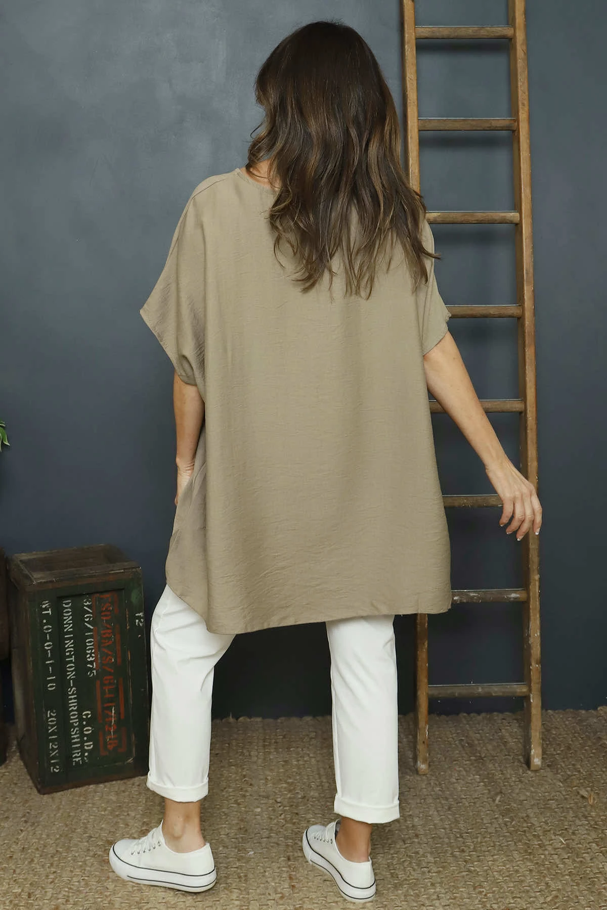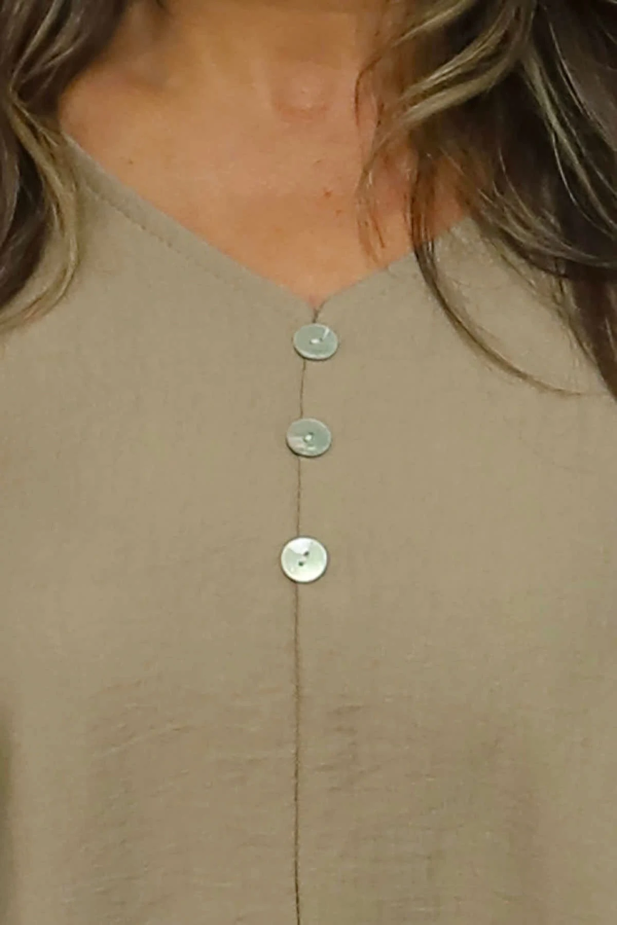 Elevate your wardrobe with our Lotus Button Top. Versatile enough to dress up or down, this top features a flattering v-neckline, button detail, and a stylish dipped hemline with seam detailing. Perfect for any occasion, this top will be a staple in your closet.
