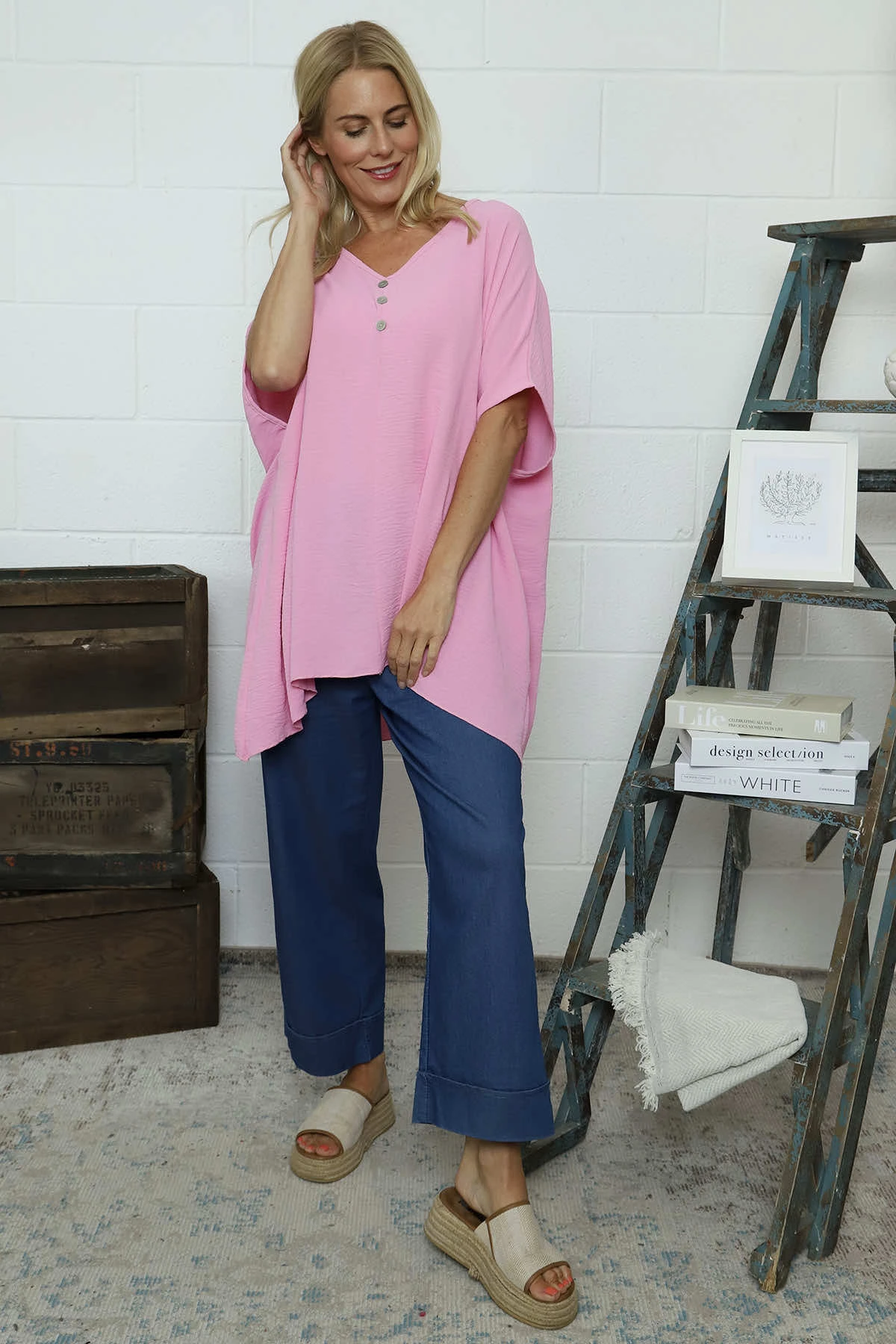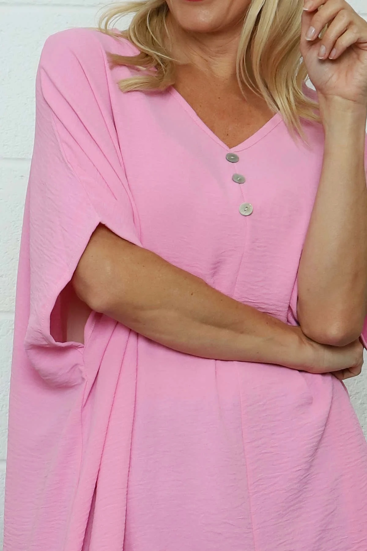 Elevate your wardrobe with our Lotus Button Top. Versatile enough to dress up or down, this top features a flattering v-neckline, button detail, and a stylish dipped hemline with seam detailing. Perfect for any occasion, this top will be a staple in your closet.
