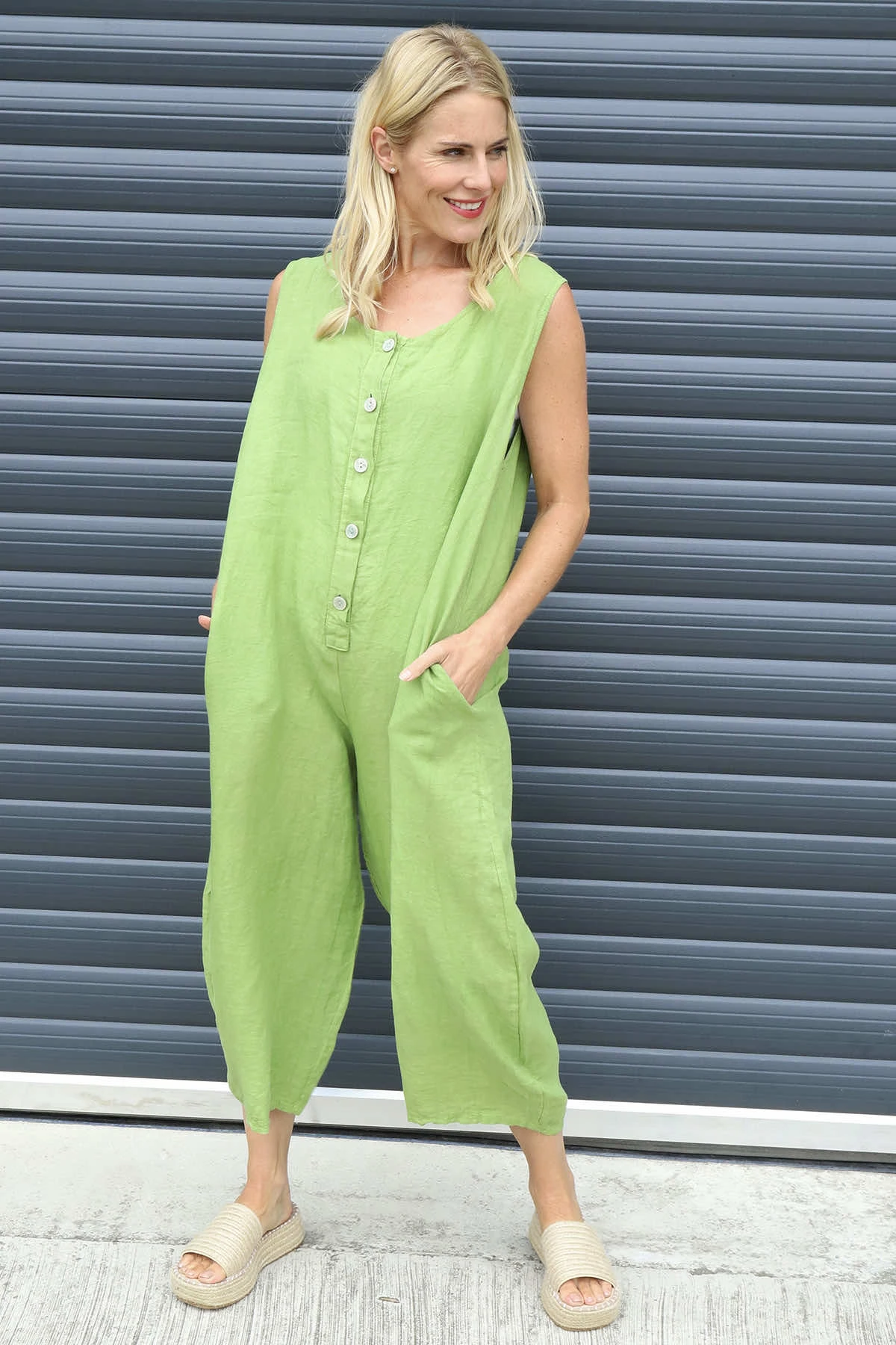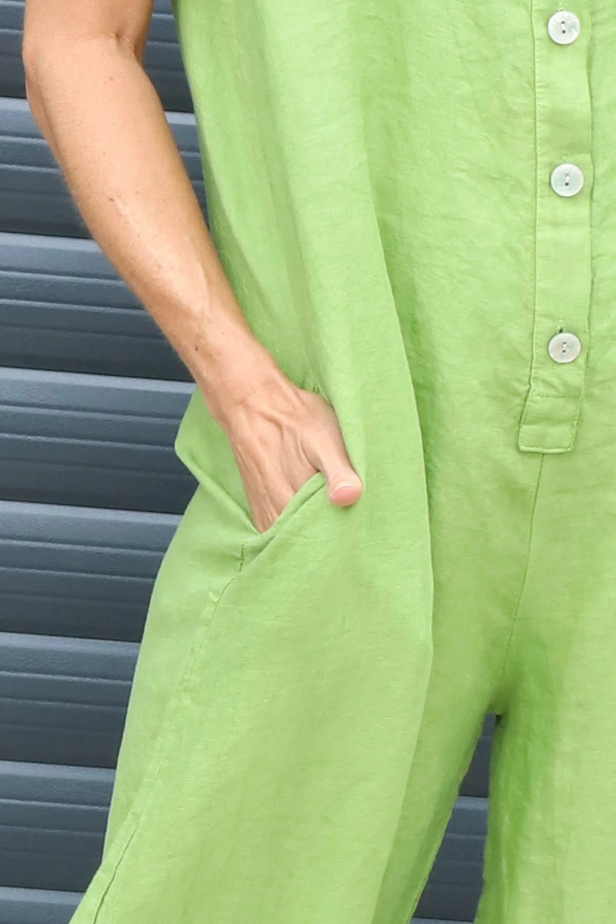 The Margot Sleeveless Linen Jumpsuit is a fresh addition to your wardrobe, designed for comfort and style. Made from breathable linen, it features a button-front closure and practical pockets for convenience. Its wide-leg cut offers ease of movement and a flattering silhouette, perfect for warm days or layering. This jumpsuit combines effortless elegance with everyday functionality.