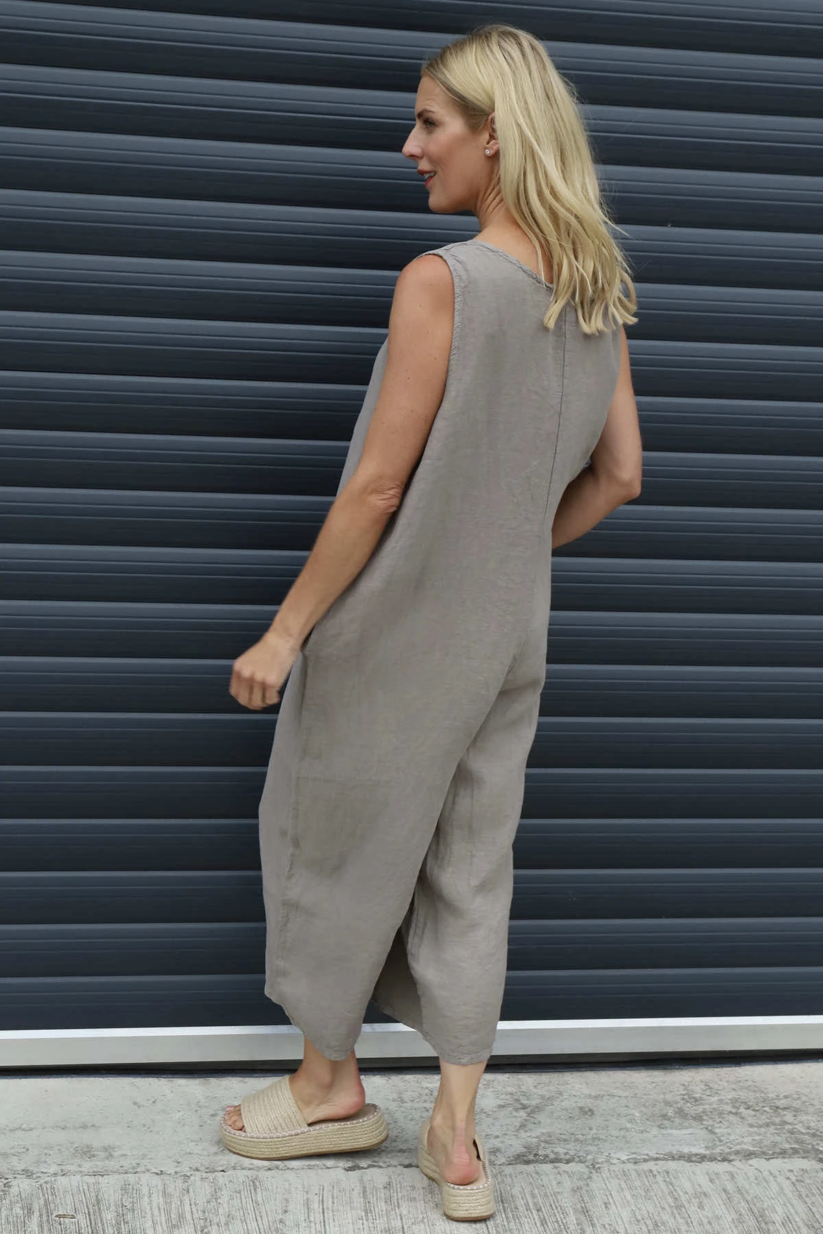 The Margot Sleeveless Linen Jumpsuit is a fresh addition to your wardrobe, designed for comfort and style. Made from breathable linen, it features a button-front closure and practical pockets for convenience. Its wide-leg cut offers ease of movement and a flattering silhouette, perfect for warm days or layering. This jumpsuit combines effortless elegance with everyday functionality.