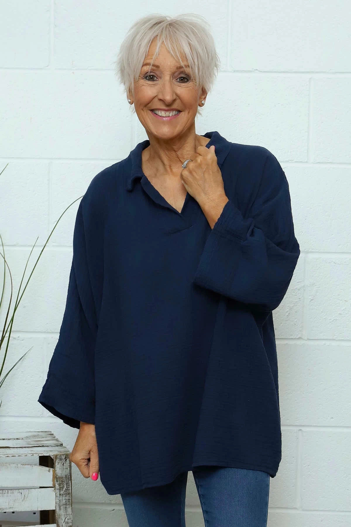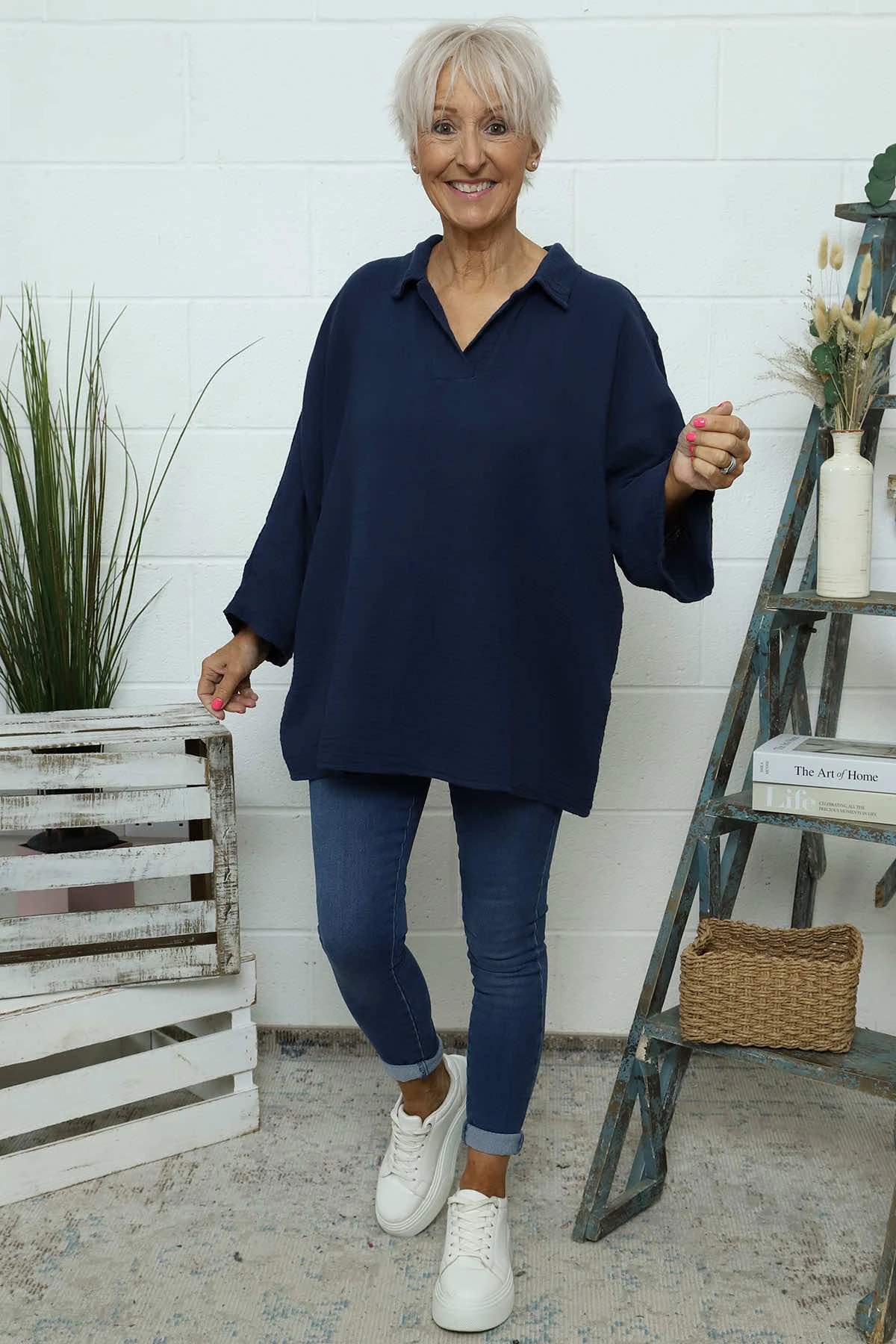 The perfect piece to take you from day to night. The Made in Italy Marsha Crinkle Cotton Top is made for comfort and style, featuring a classic collar, v neckline and rolled back sleeves. And crafted from crinkle effect cotton fabric.