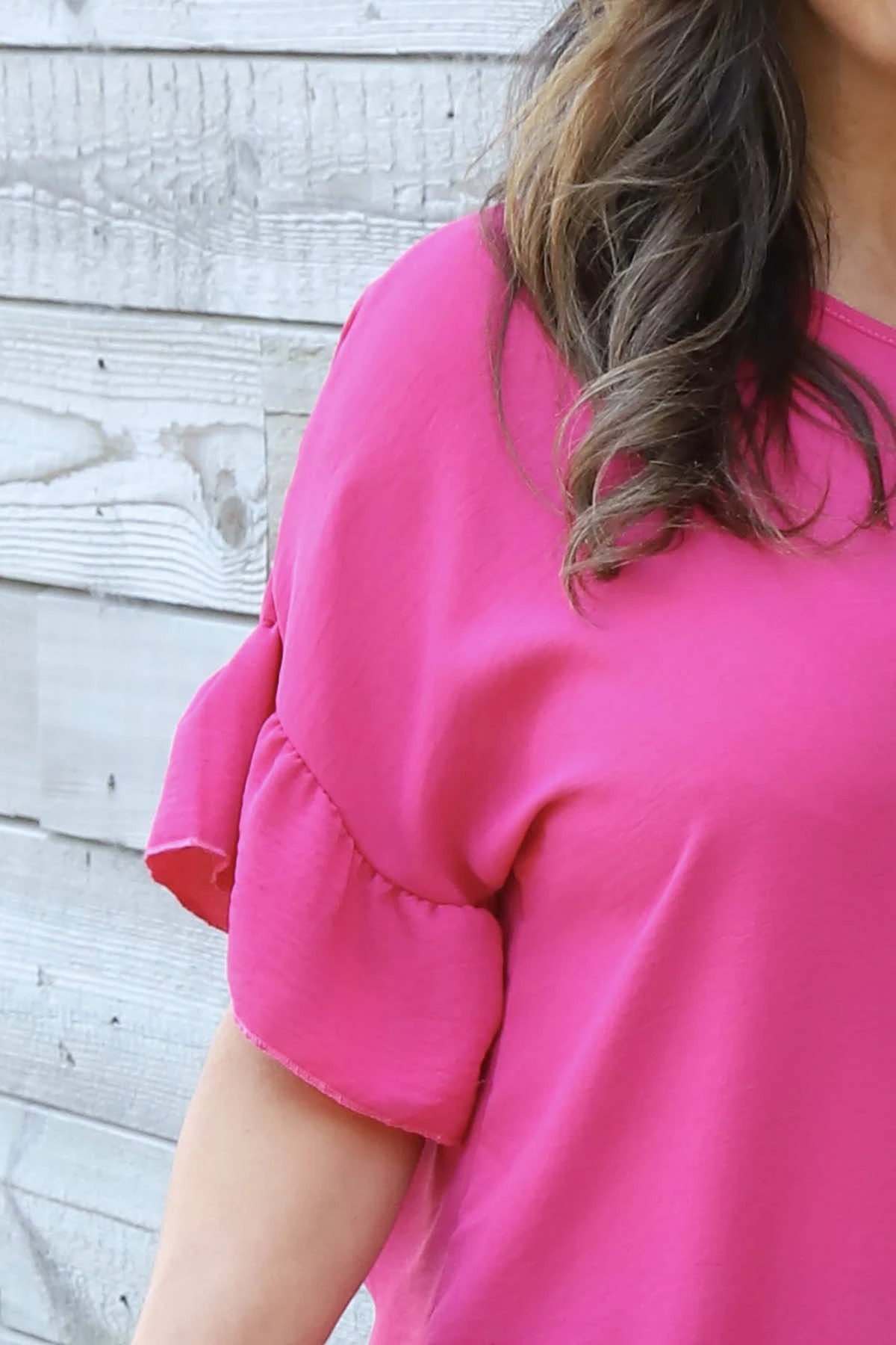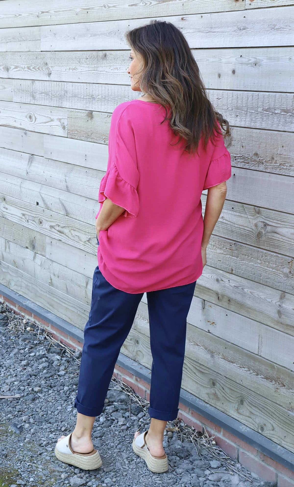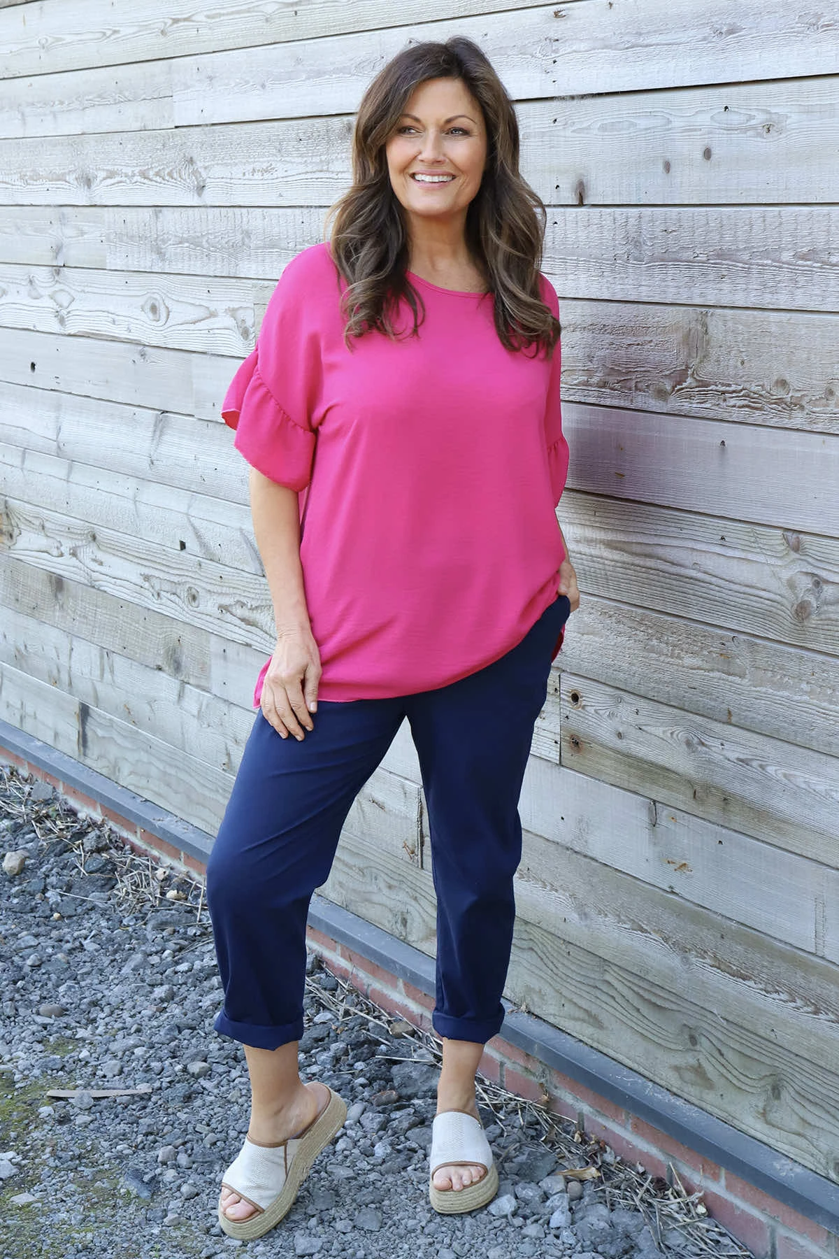 The Neola Frill Sleeve Top features delicate frill sleeves and a classic round neckline, offering a flattering and comfortable fit. Its block colour design makes it easy to pair with any outfit, while the short sleeves keep you cool and stylish throughout the day. Perfect for adding a touch of feminine charm to your wardrobe with effortless ease.