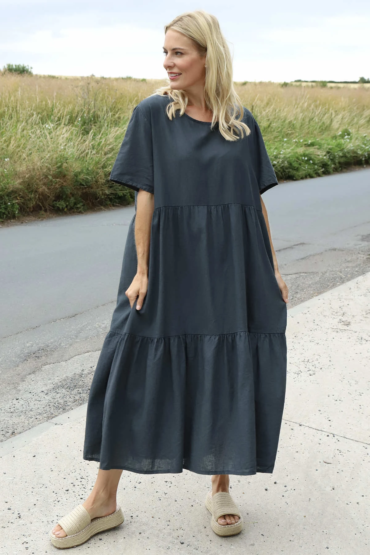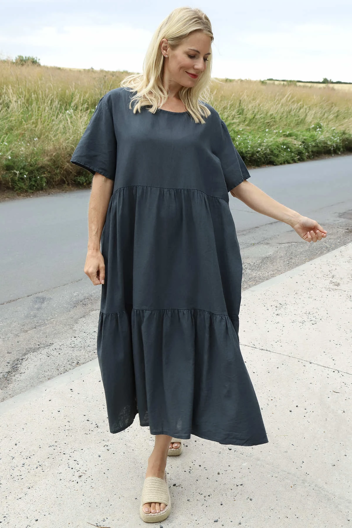 Introducing the Nova Linen Dress. The Nova Linen Dress is crafted from a breathable linen-cotton blend for all-day comfort. Featuring a flattering round neckline and short sleeves, this dress offers effortless style and ease. The tiered skirt adds a touch of playful movement, making it perfect for both casual outings and relaxed gatherings. Embrace comfort and confidence with this versatile wardrobe essential.