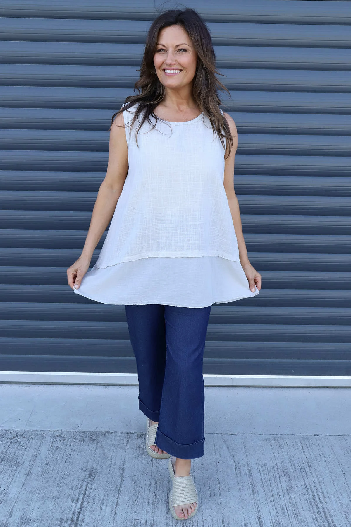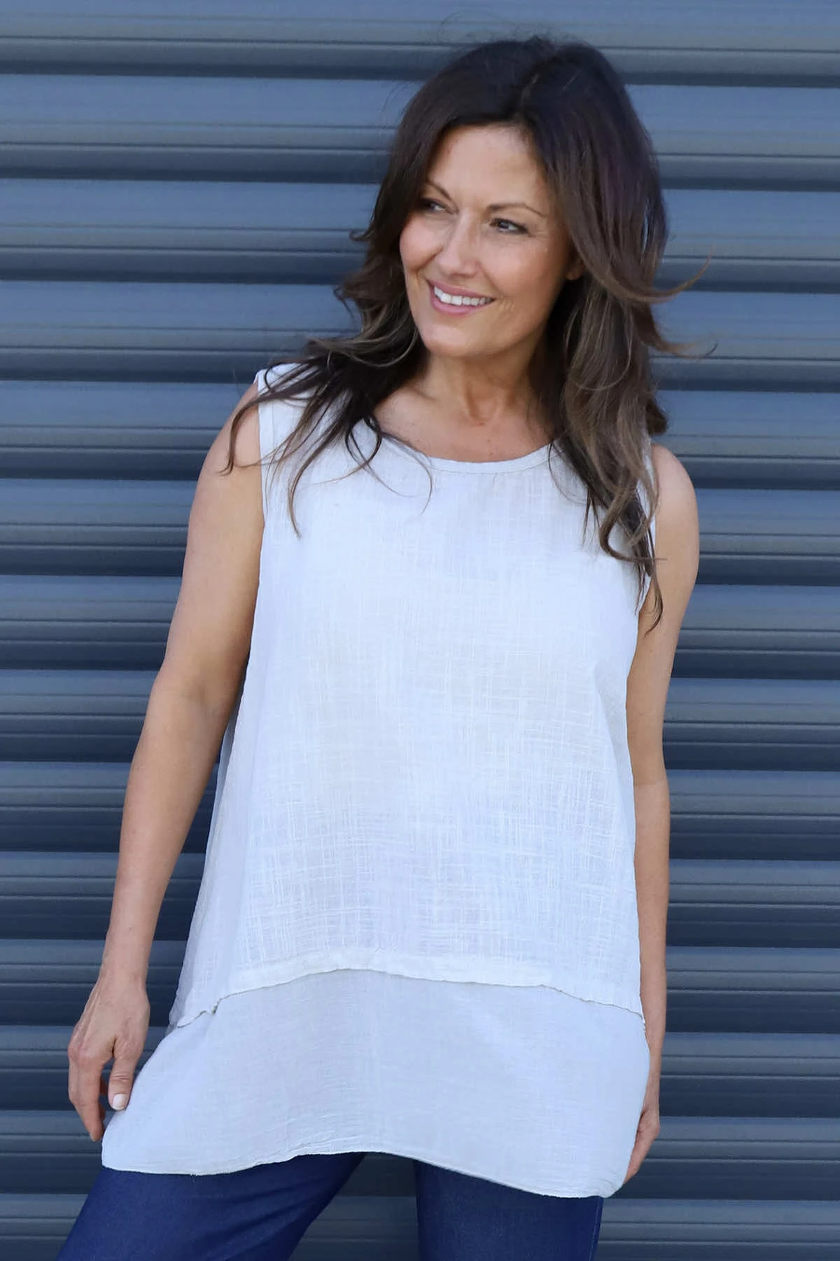 Get ready for summer with the Perla Sleeveless Cotton Top. Crafted from soft, breathable cotton, this top keeps you cool and comfortable on warm days. Its sleeveless design and round neckline offer a flattering fit that’s perfect for layering or wearing alone. Ideal for casual outings or relaxed weekends, it’s a versatile addition to your summer wardrobe.