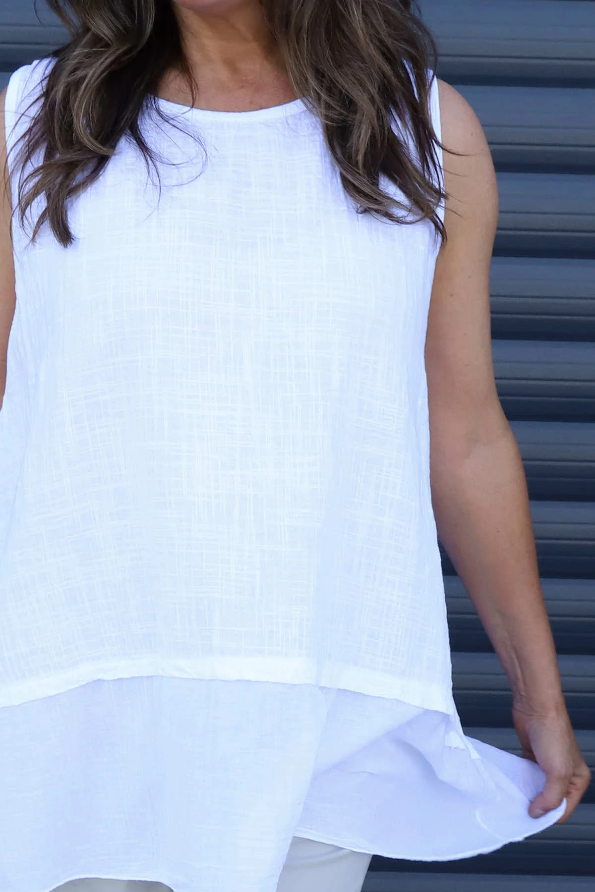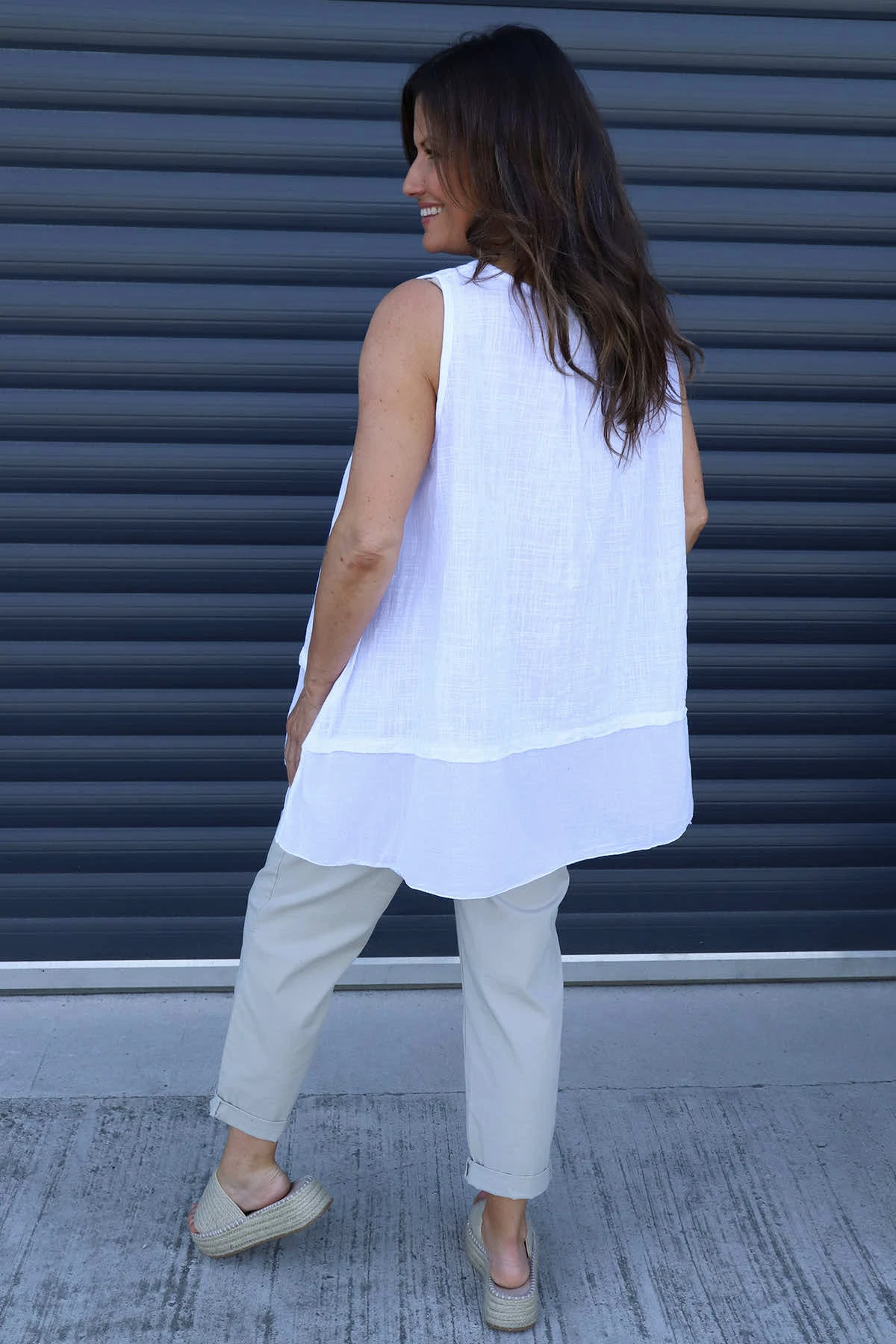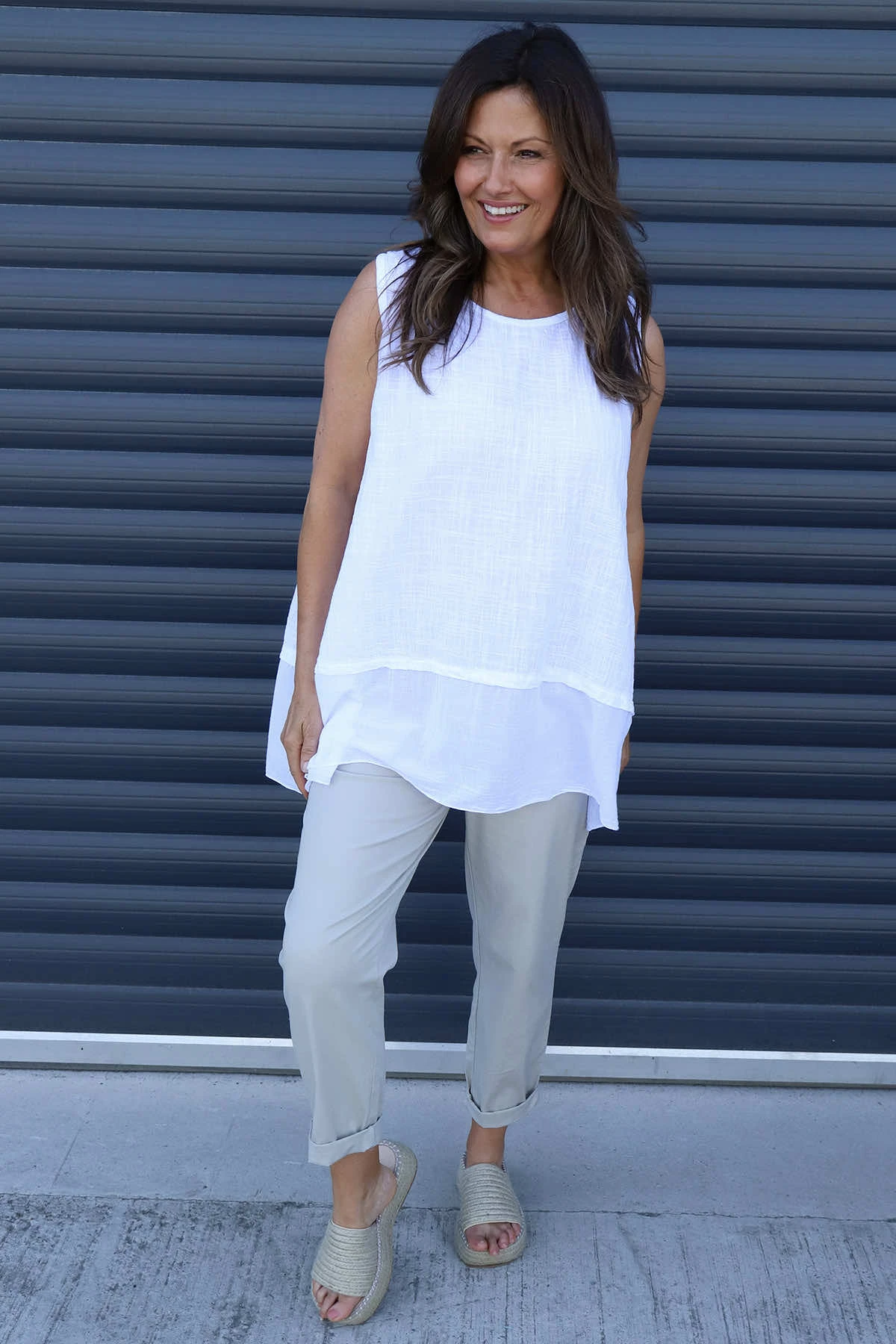Get ready for summer with the Perla Sleeveless Cotton Top. Crafted from soft, breathable cotton, this top keeps you cool and comfortable on warm days. Its sleeveless design and round neckline offer a flattering fit that’s perfect for layering or wearing alone. Ideal for casual outings or relaxed weekends, it’s a versatile addition to your summer wardrobe.