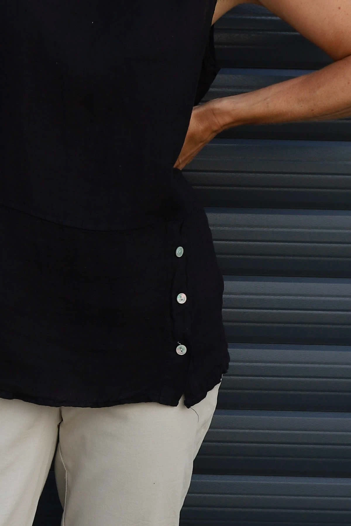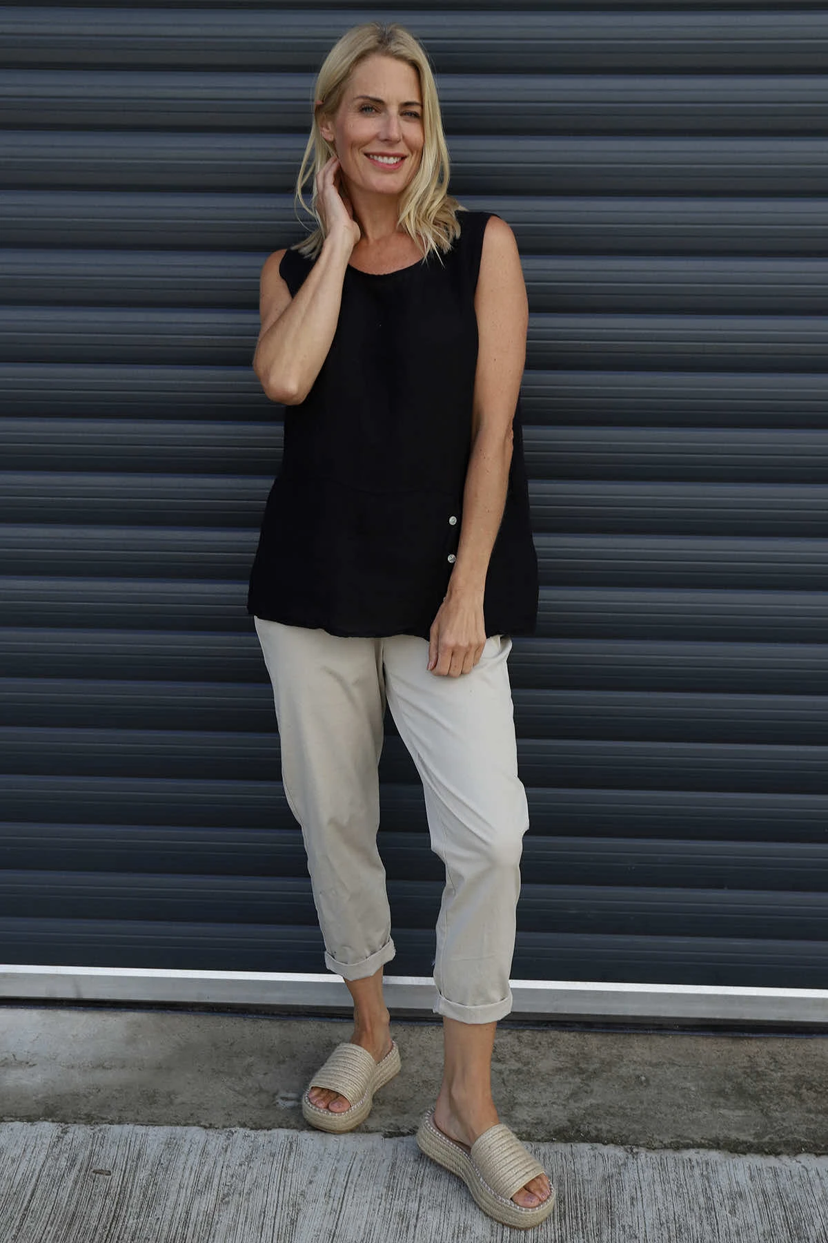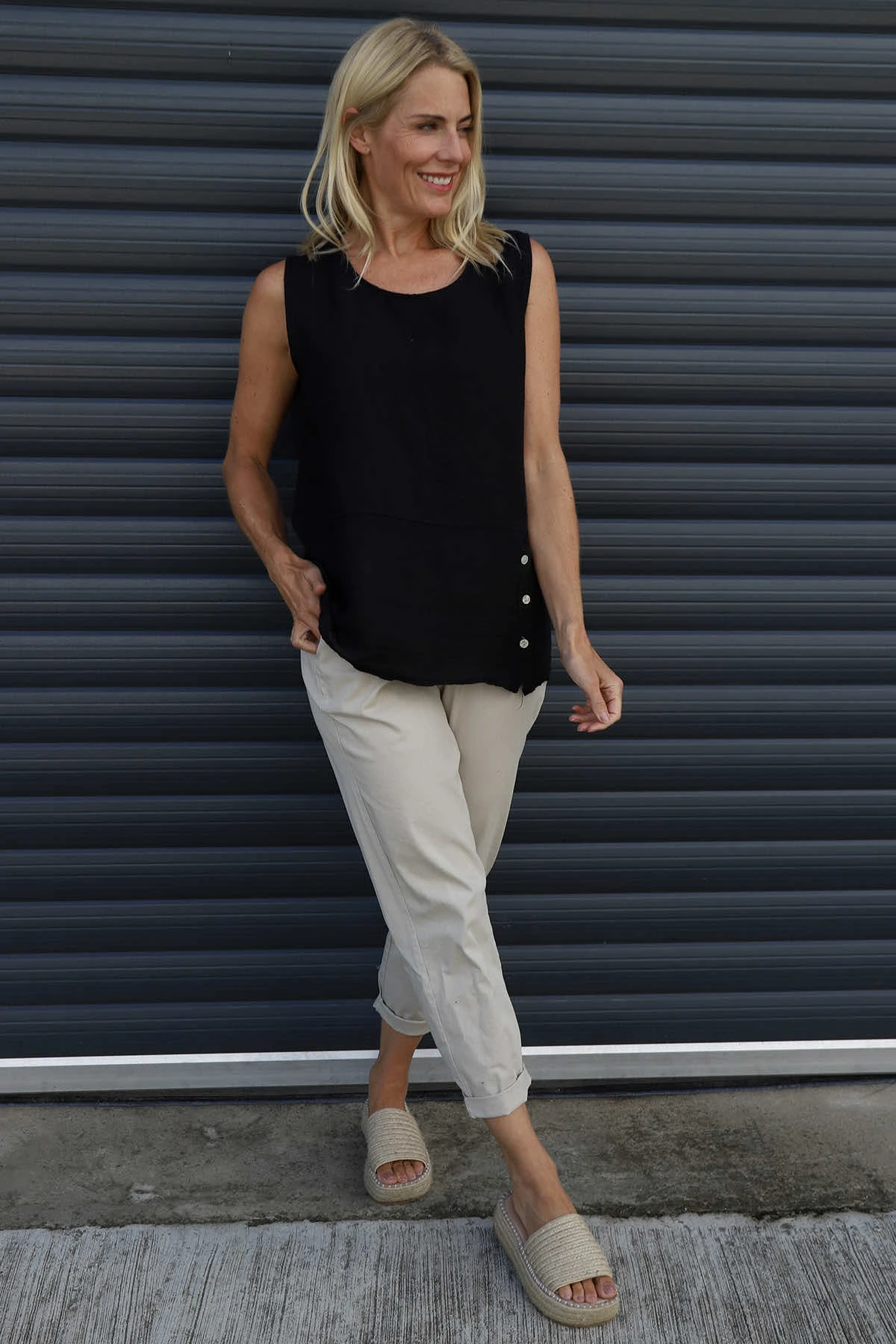 Update your wardrobe with the Persephone Sleeveless Linen Top, designed for effortless style and comfort. Crafted from breathable linen, it features a flattering round neckline and delicate button details that add subtle charm. Its sleeveless design keeps you cool and versatile for layering, making it an essential piece for any season.