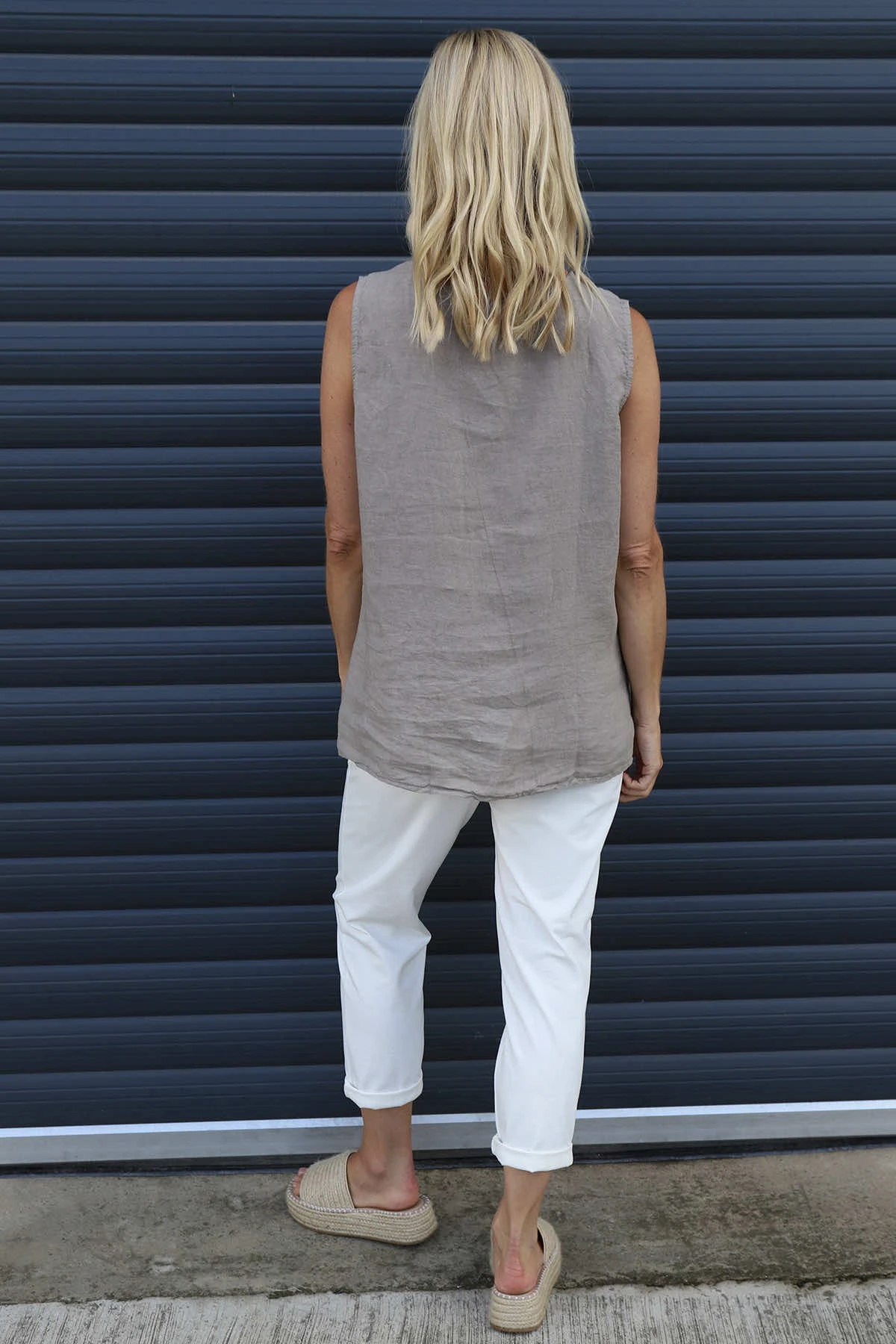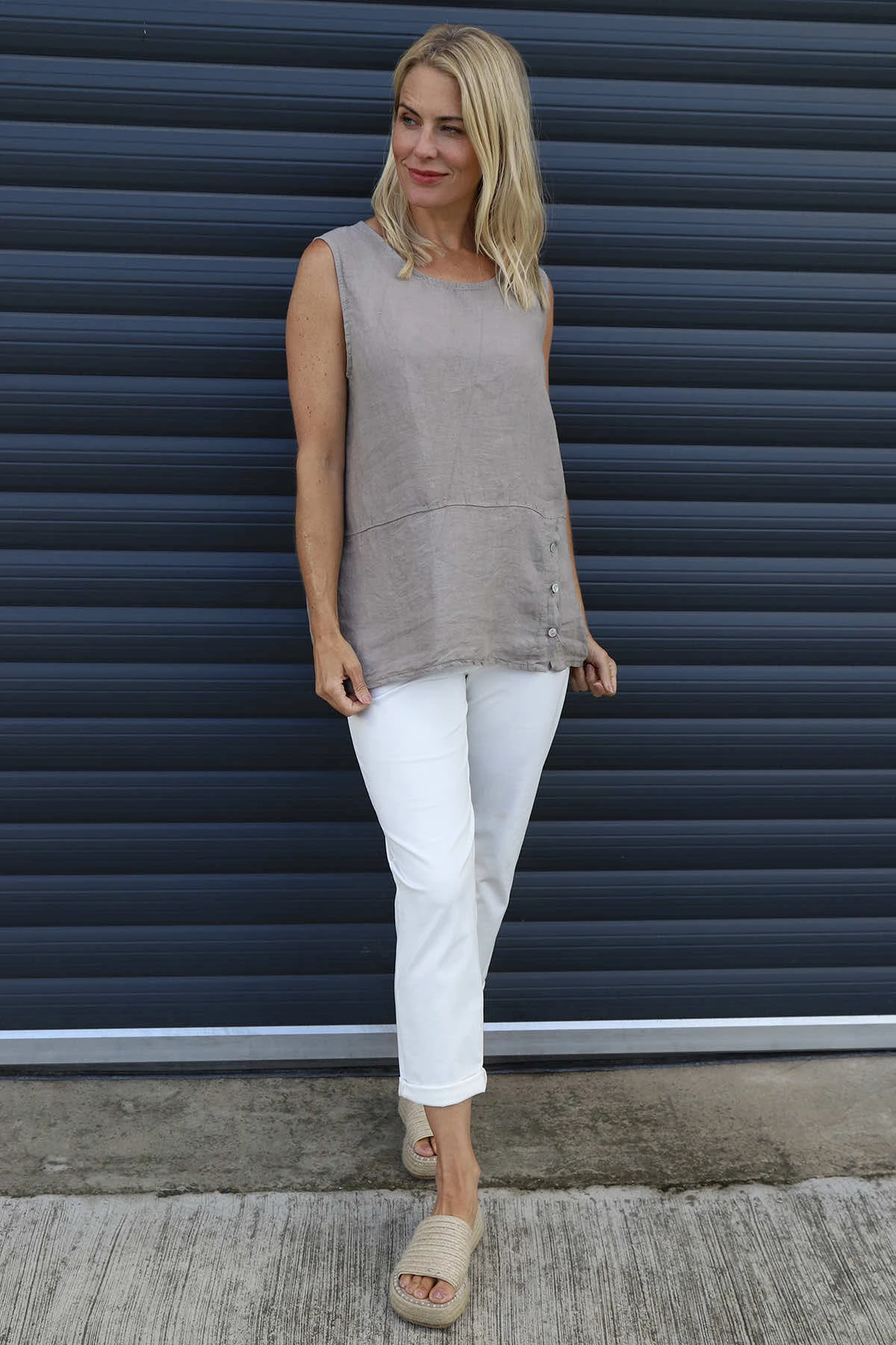 Update your wardrobe with the Persephone Sleeveless Linen Top, designed for effortless style and comfort. Crafted from breathable linen, it features a flattering round neckline and delicate button details that add subtle charm. Its sleeveless design keeps you cool and versatile for layering, making it an essential piece for any season.