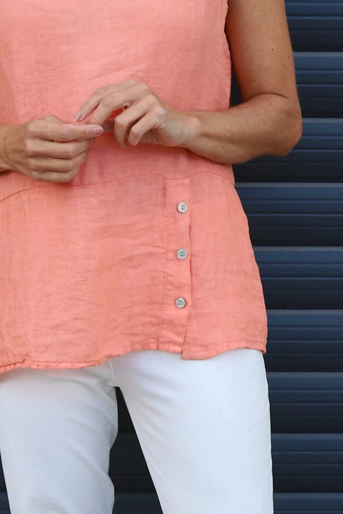 Update your wardrobe with the Persephone Sleeveless Linen Top, designed for effortless style and comfort. Crafted from breathable linen, it features a flattering round neckline and delicate button details that add subtle charm. Its sleeveless design keeps you cool and versatile for layering, making it an essential piece for any season.