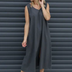 Olaya V-Neck Linen Dress Charcoal