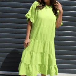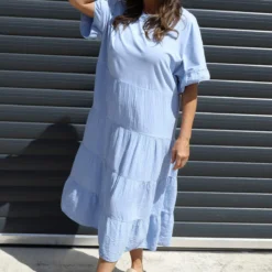 Soleil Tiered Crinkle Cotton Dress Light Blue