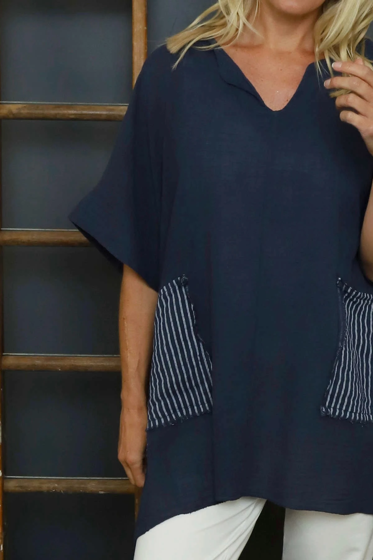 This comfortable V-neck cotton top features charming striped pockets and practical short sleeves. The Sabina design combines breathable fabric with thoughtful details, making it a versatile addition to your wardrobe that you’ll reach for again and again.