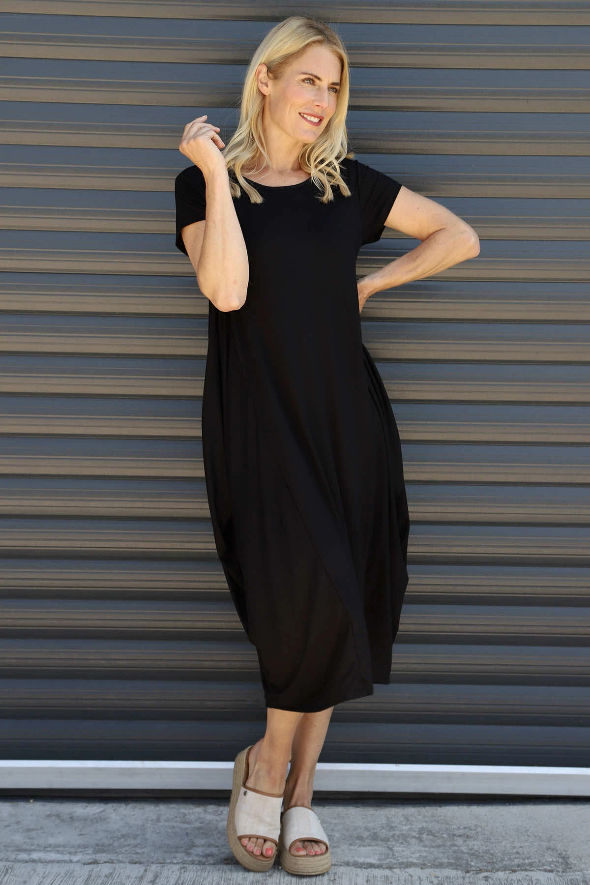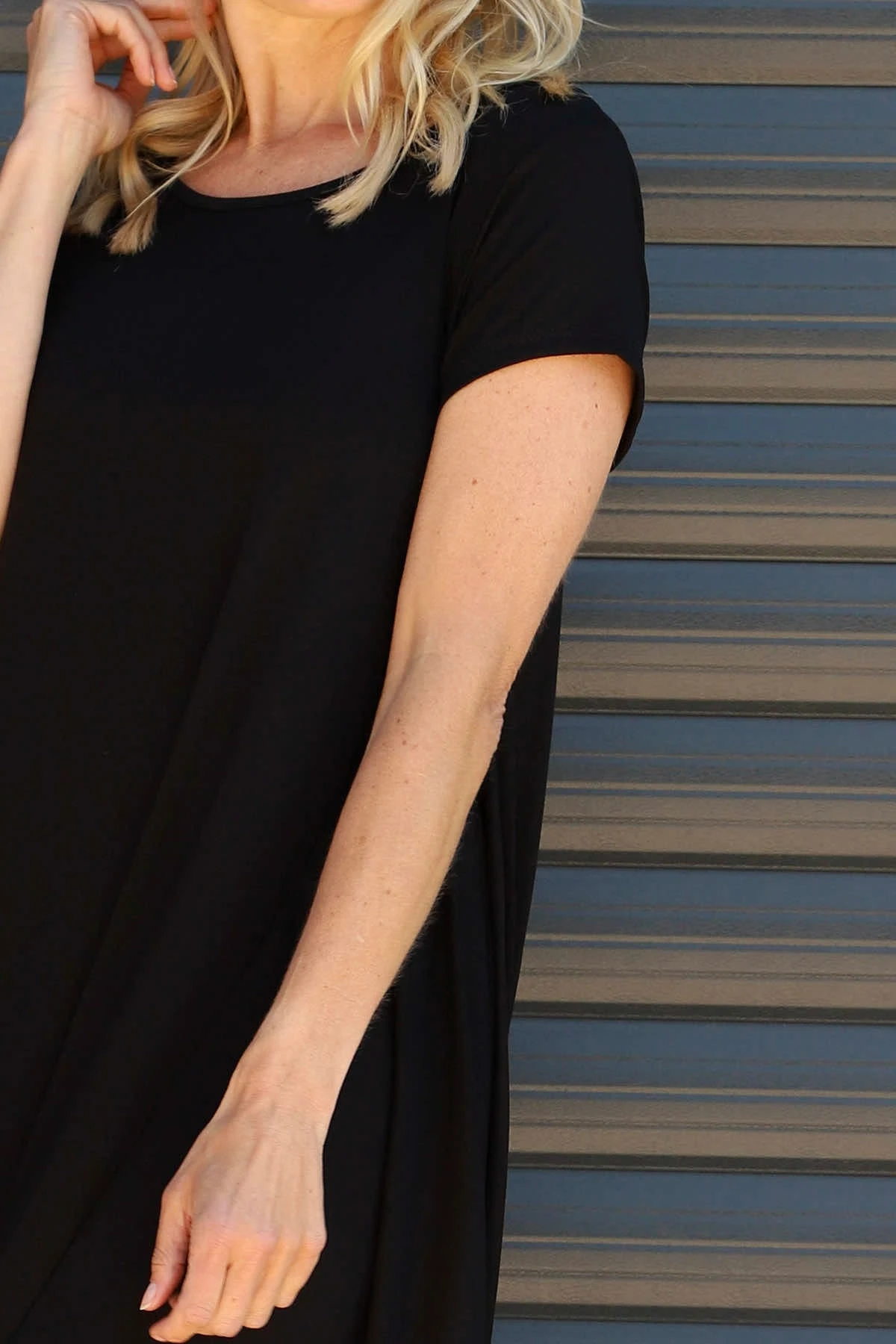 The Sariah Short Sleeve Dress features a soft round neckline that elegantly frames your face with care. Its thoughtfully designed short sleeves offer comfortable movement throughout your day, never restricting but always flattering. This dress provides the perfect foundation for your personal style.