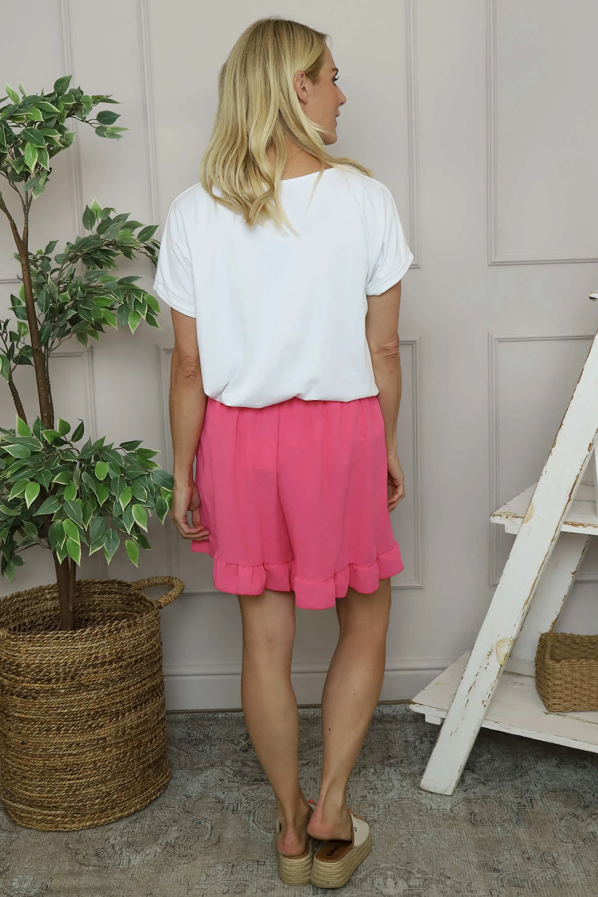 Embrace comfort and style with our Stellina Frill Shorts. Featuring a playful frill hem that adds a feminine touch to your casual wardrobe. The elasticated waist ensures a comfortable fit that moves with you, while the solid colour design offers versatile styling options for any summer outfit. Perfect for warm days when you want to look effortlessly chic.