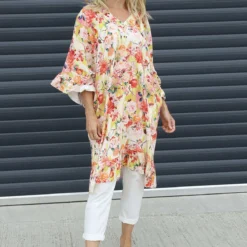 The Tahlia Floral Linen Tunic combines elegance with comfort through its thoughtful design elements. Featuring a flattering V neckline, charming ruffle sleeves, and a delicate ruffle hem that adds movement to your silhouette. The convenient tie-back detail ensures a perfect fit for your unique shape. Crafted from breathable linen mix with a beautiful floral pattern that brightens any occasion.