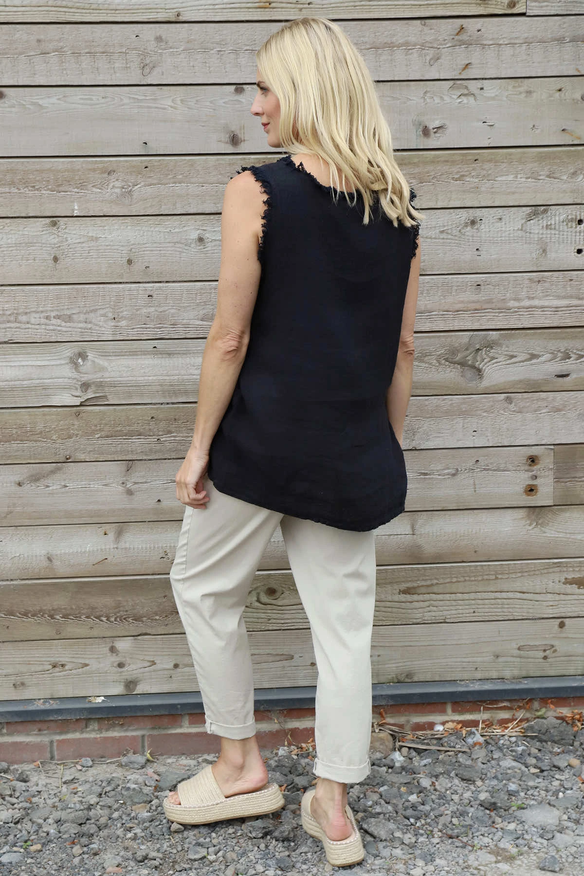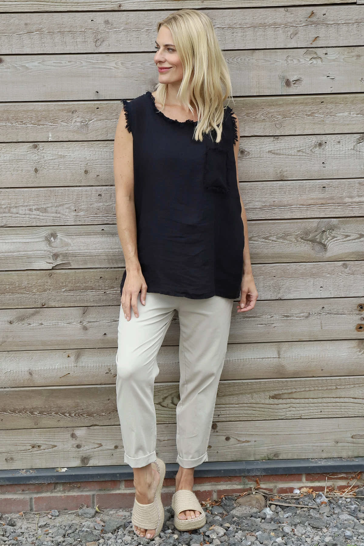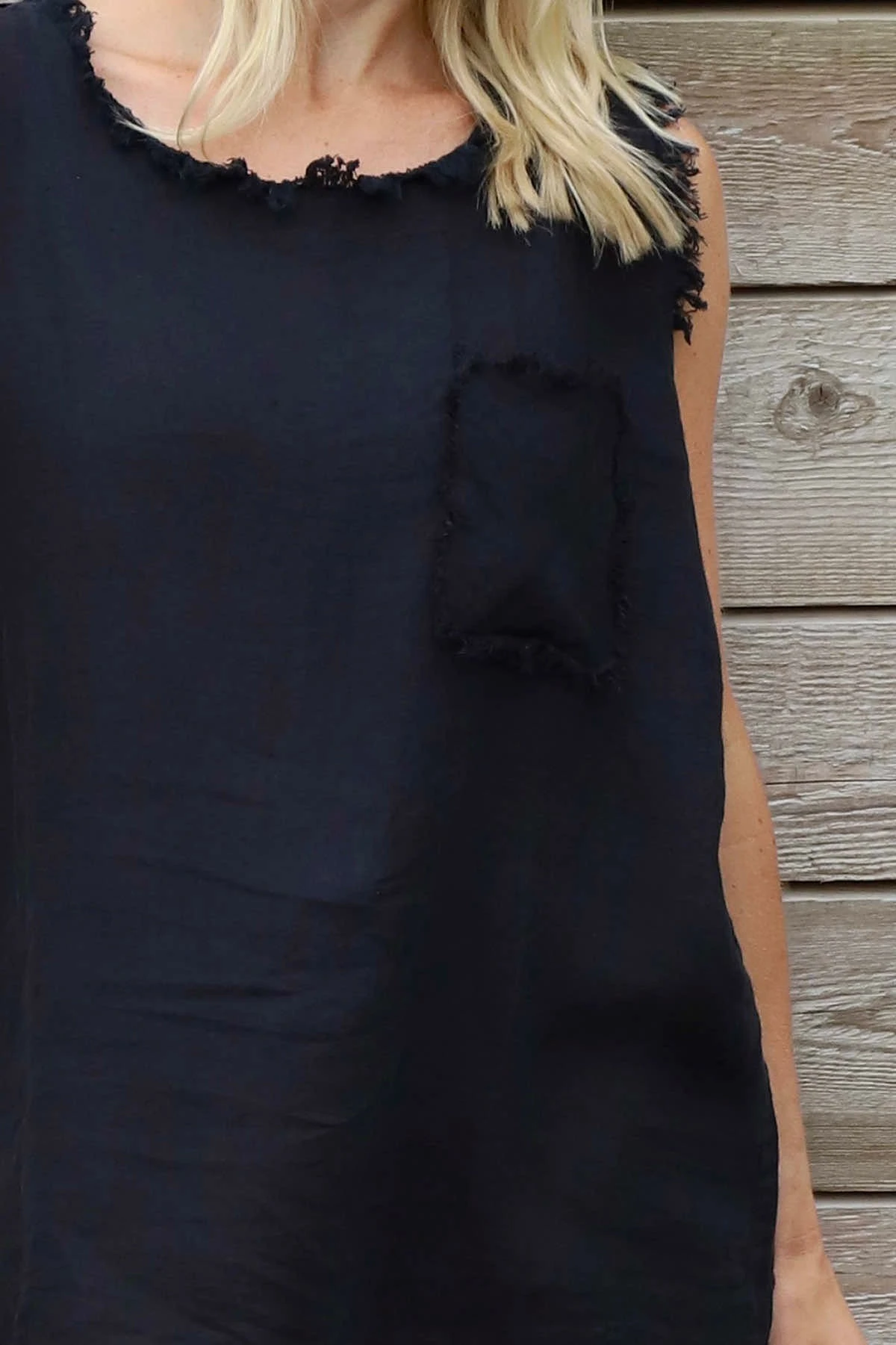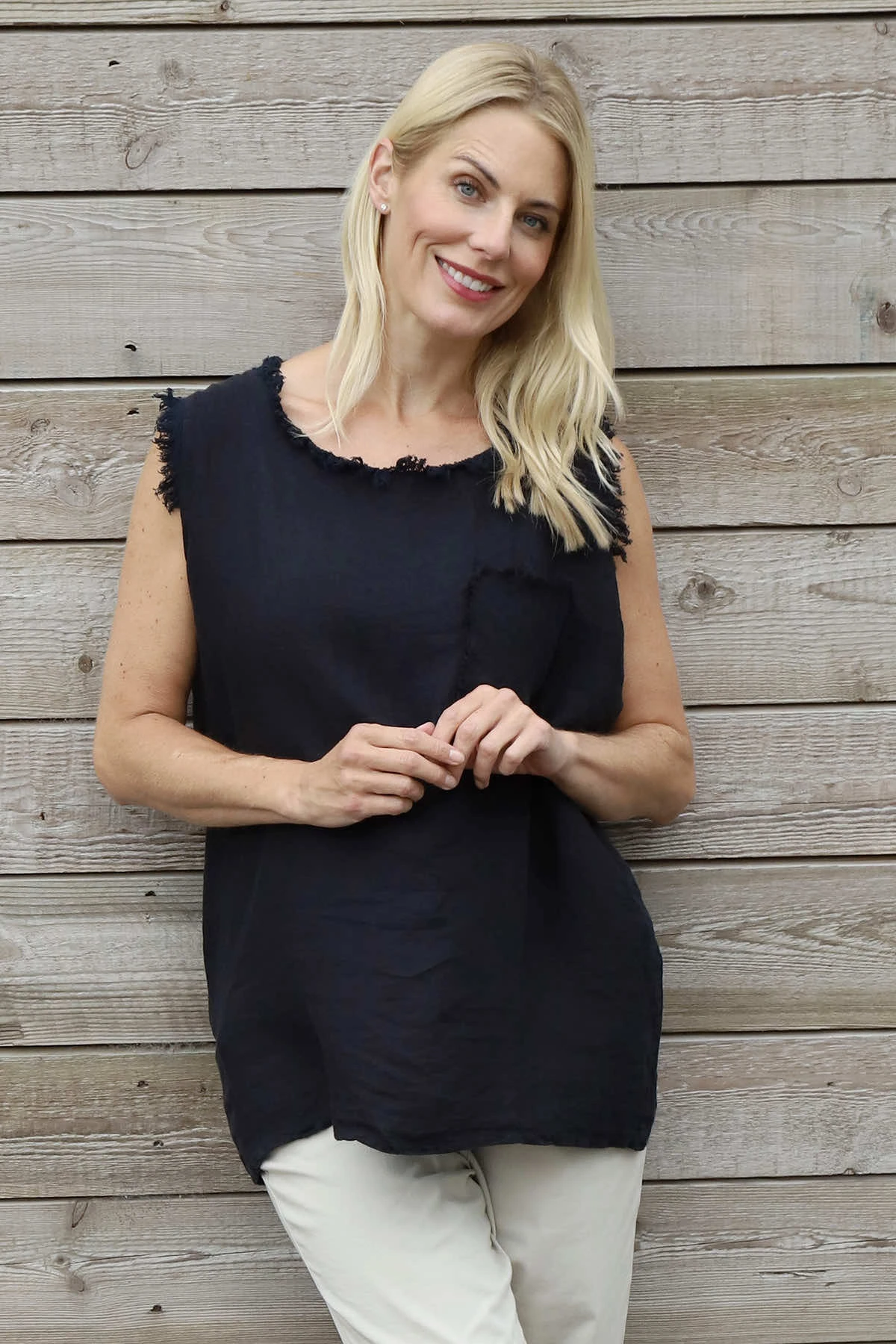 Embrace effortless style with the Therese Sleeveless Linen Top. Crafted from breathable linen, it features elegant tufted detailing and a practical pocket for added charm. The sleeveless design and round neckline offer a comfortable, flattering fit perfect for warm days. This top combines timeless simplicity with thoughtful touches to keep you looking and feeling confident.