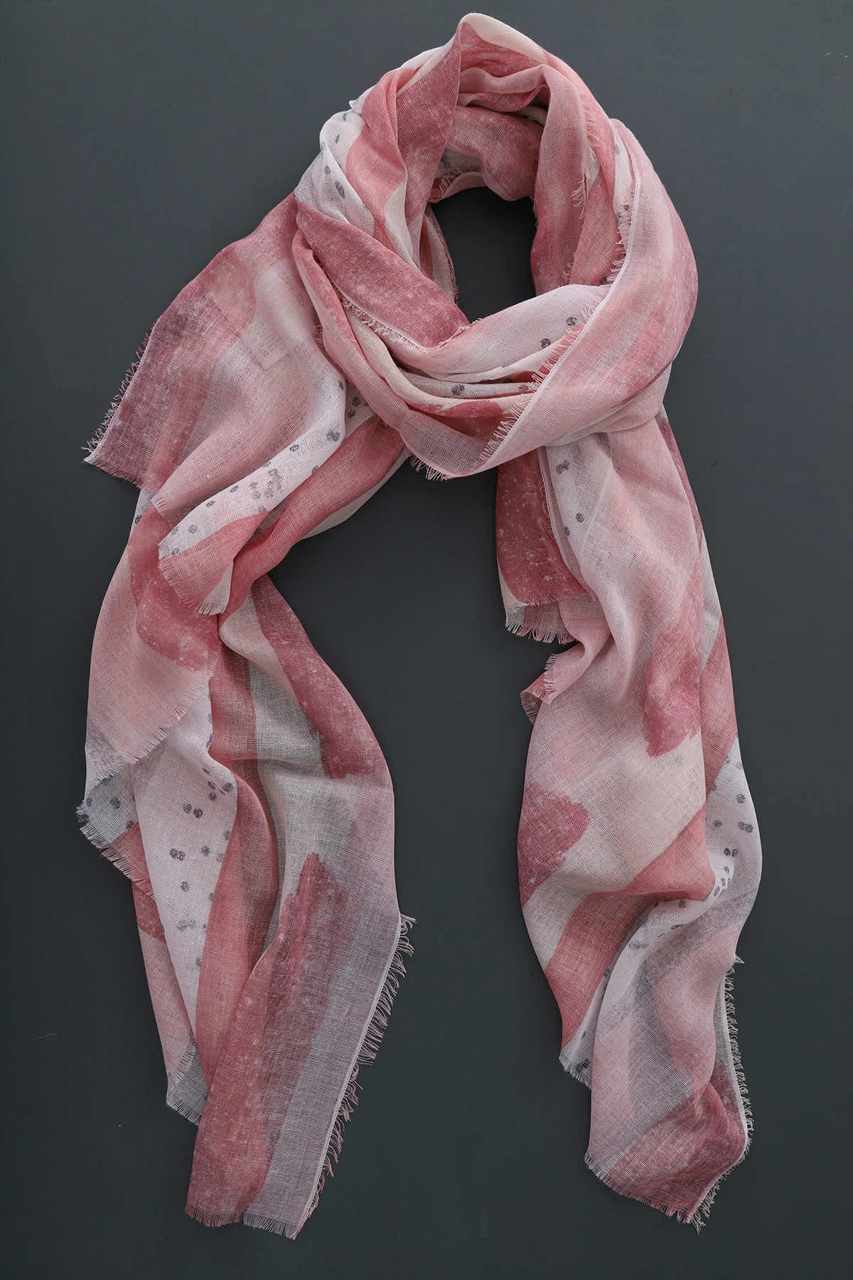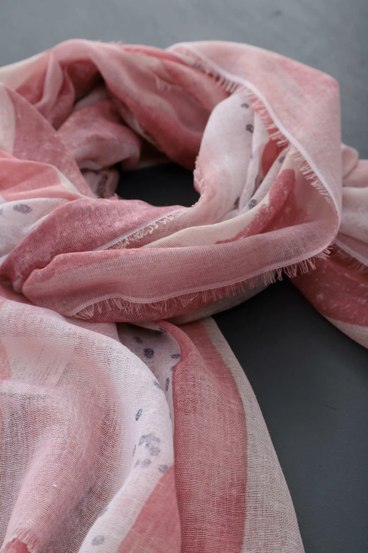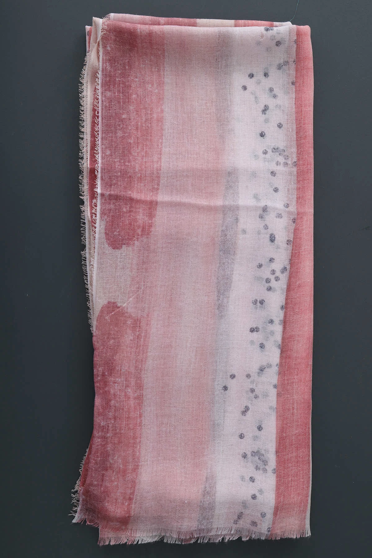 Wrap yourself in style with our Turin Scarf. The painted stripe and small dots add a touch of whimsy, while the raw edge gives it a trendy, casual look. Perfect for staying warm and fashionable on chilly days.