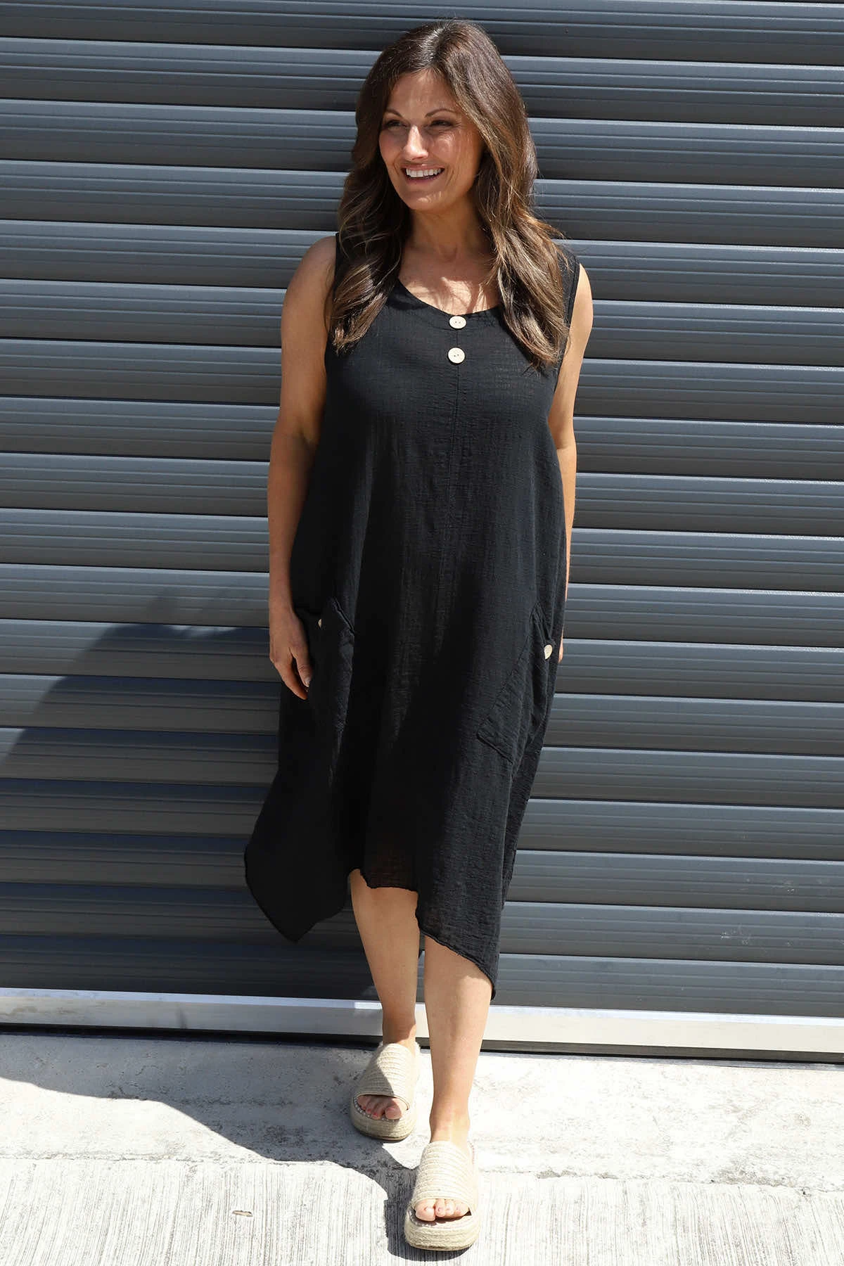 Embrace effortless style with the Vanna Sleeveless Cotton Dress. Featuring a comfortable round neckline and button details, this dress combines simplicity with subtle charm. Its sleeveless design and breathable cotton fabric keep you cool and comfortable all day, while convenient pockets add functionality without sacrificing style. Perfect for easy, confident dressing every day.