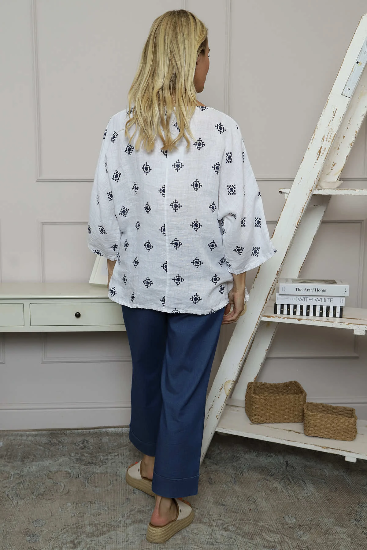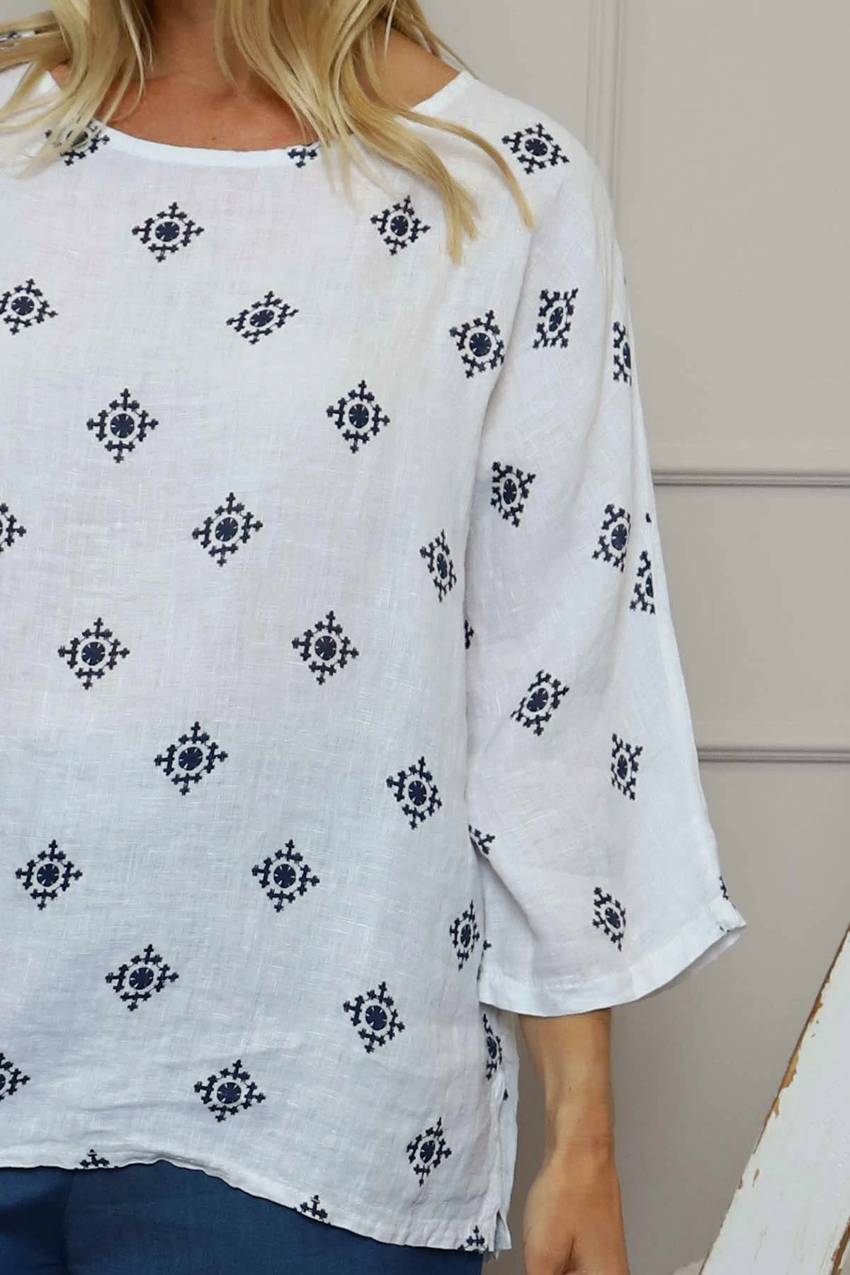 Add detail to your wardrobe with the Made in Italy Vicki Print Linen Top. A fabulous piece that adds interest to any look. Featuring an round neckline, full length sleeves, slight dipped side hemline and all over print.