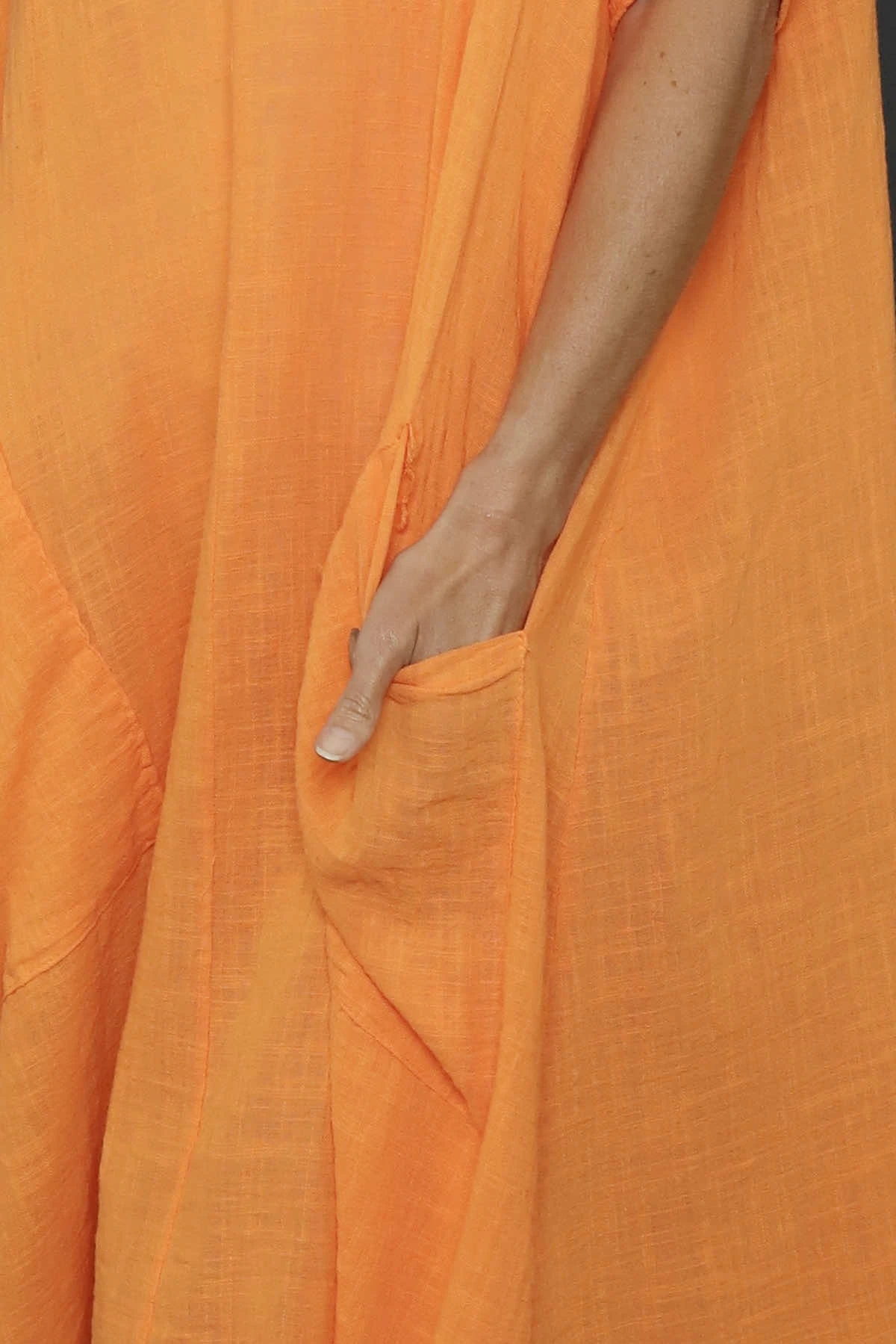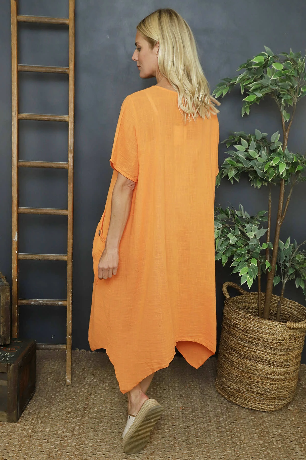 The Viliana Cotton Dress combines comfort with thoughtful design elements. Featuring a gentle V neckline that flatters your silhouette, this dress includes practical pockets and charming button details. The short sleeves and breathable cotton fabric make it perfect for warm days while providing a relaxed yet put-together look for any occasion.